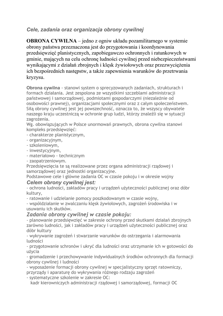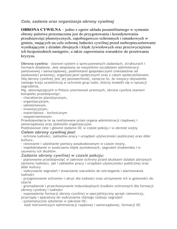 Cele, zadania oraz organizacja obrony cywilnej OBRONA CYWILNA – jedno z ogniw układu pozamilitarnego w systemie obrony państwa przeznaczona jest do przygotowania i koordynowania przedsięwzięć planistycznych, zapobiegawczo ochronnych i ratunkowych w gminie, mających na celu ochronę ludności cywilnej przed niebezpieczeństwami wynikającymi z działań zbrojnych i klęsk Ŝywiołowych oraz przezwycięŜenia ich bezpośrednich następstw, a takŜe zapewnienia warunków do przetrwania kryzysu. Obrona cywilna - stanowi system o sprecyzowanych zadaniach, strukturach i formach działania. Jest zespolona ze wszystkimi szczeblami administracji państwowej i samorządowej, podmiotami gospodarczymi (niezaleŜnie od osobowości prawnej), organizacjami społecznymi oraz z całym społeczeństwem. Siłą obrony cywilnej jest jej powszechność, oznacza to, Ŝe wszyscy obywatele naszego kraju uczestniczą w ochronie grup ludzi, którzy znaleźli się w sytuacji zagroŜenia. Wg. obowiązujących w Polsce unormowań prawnych, obrona cywilna stanowi kompleks przedsięwzięć: - charakterze planistycznym, - organizacyjnym, - szkoleniowym, - inwestycyjnym, - materiałowo - technicznym - zaopatrzeniowym. Przedsięwzięcia te są realizowane przez organa administracji rządowej i samorządowej oraz jednostki organizacyjne. Podstawowe cele i główne zadania OC w czasie pokoju i w okresie wojny Celem obrony cywilnej jest: - ochrona ludności, zakładów pracy i urządzeń uŜyteczności publicznej oraz dóbr kultury, - ratowanie i udzielanie pomocy poszkodowanym w czasie wojny, - współdziałanie w zwalczaniu klęsk Ŝywiołowych, zagroŜeń środowiska i w usuwaniu ich skutków. Zadania obrony cywilnej w czasie pokoju: - planowanie przedsięwzięć w zakresie ochrony przed skutkami działań zbrojnych zarówno ludności, jak i zakładów pracy i urządzeń uŜyteczności publicznej oraz dóbr kultury - wykrywanie zagroŜeń i stwarzanie warunków do ostrzegania i alarmowania ludności - przygotowanie schronów i ukryć dla ludności oraz utrzymanie ich w gotowości do uŜycia - gromadzenie i przechowywanie indywidualnych środków ochronnych dla formacji obrony cywilnej i ludności - wyposaŜenie formacji obrony cywilnej w specjalistyczny sprzęt ratowniczy, przyrządy i aparaturę do wykrywania róŜnego rodzaju zagroŜeń - systematyczne szkolenie w zakresie OC: kadr kierowniczych administracji rządowej i samorządowej, formacji OC ludności w ramach powszechnej samoobrony ,współdziałanie w zwalczaniu klęsk Ŝywiołowych i zagroŜeń środowiska, oraz usuwanie ich skutków. Decyzję o włączeniu sił obrony cywilnej do działań podejmują terenowi szefowie OC. Zadania obrony cywilnej w czasie wojny: - organizuje ewakuację ludności, zaciemnianie i wygaszanie oświetlenia - organizuje i prowadzi akcję ratunkową, udziela pomocy medycznej poszkodowanym - organizuje pomieszczenia i zaopatrzenie dla poszkodowanej ludności - zaopatruje ludność w sprzęt i środki ochrony indywidualnej - prowadzi likwidację skaŜeń i zakaŜeń - pomaga w przywracaniu i utrzymaniu porządku w strefach dotkniętych klęskami - pomaga w budowie i odbudowie awaryjnych ujęć wody pitnej - pomaga w ratowaniu Ŝywności i innych dóbr niezbędnych do przetrwania - udziela doraźnej pomocy w grzebaniu zmarłych. Obowiązki i uprawnienia organów państwowych, samorządowych i organizacji społecznych. Centralnym organem właściwym w sprawach obrony cywilnej jest Szef Obrony Cywilnej Kraju, którego na wniosek Ministra Spraw Wewnętrznych i Administracji powołuje prezes Rady Ministrów. Do zakresu działania Szefa Obrony Cywilnej Kraju naleŜy: - przygotowanie projektów załoŜeń i zasad działania obrony cywilnej, - ustalenie ogólnych zasad realizacji zadań obrony cywilnej, - koordynowanie przedsięwzięć i sprawowanie kontroli nad realizacją zadań obrony cywilnej przez naczelne organa administracji, terenowe organa administracji rządowej i organa samorządu terytorialnego, a takŜe - sprawowania nadzoru nad odbywaniem zasadniczej słuŜby w obronie cywilnej. Terenowymi organami obrony cywilnej w administracji rządowej i samorządowej są Wojewodowie, starostowie, wójtowie oraz burmistrzowie i prezydenci miast jako szefowie obrony cywilnej województw, powiatów i gmin. Do zakresu ich działania naleŜy kierowanie oraz koordynowanie przygotowań i realizacji przedsięwzięć obrony cywilnej przez instytucje państwowe i samorządowe, podmioty gospodarcze i inne jednostki organizacyjne działające na ich terenach. Szefowie Obrony Cywilnej województw i gmin wykonują zadania obrony cywilnej przy pomocy podległych im urzędów oraz powołanych w ich strukturach specjalistycznych komórek organizacyjnych. Za realizację zadań obrony cywilnej w zakładach pracy odpowiedzialni są ich właściciele lub kierownicy. Ministrowie (kierownicy) urzędów centralnych mają obowiązek uwzględniania zadań obrony cywilnej w nadzorowanych przez nich dziedzinach. Organizacje społeczne wykonują zadania obrony cywilnej w zakresie wynikającym z ich statusów i programów działania. Zasady i sposoby realizacji są uzgadniane w porozumieniach zawieranych przez ich naczelne organy z szefem Obrony Cywilnej Kraju. FORMACJE OBRONY CYWILNEJ Formacje obrony cywilnej tworzy się w gminach i zakładach zatrudniających więcej niŜ 50 pracowników. W zakładach pracy zatrudniających mniej niŜ 50 pracowników, mogą być tworzone wspólne formacje dla kilku sąsiadujących ze sobą zakładów. JeŜeli jednak w zakładzie zatrudniającym poniŜej 50 pracowników wytwarza się, magazynuje lub wykorzystuje do produkcji toksyczne środki przemysłowe, kierownicy, właściciele mają obowiązek powołać formacje, zdolne do samodzielnego działania ratowniczego w strefach bezpośredniego zagroŜenia stwarzanego przez zakład pracy. Zgodnie z obowiązującymi przepisami w gminach i zakładach pracy tworzy się: - formacje obr