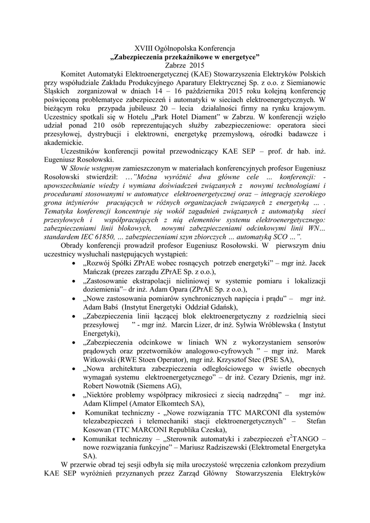 XVIII Ogólnopolska Konferencja „Zabezpieczenia przekaźnikowe w energetyce” Zabrze 2015 Komitet Automatyki Elektroenergetycznej (KAE) Stowarzyszenia Elektryków Polskich przy współudziale Zakładu Produkcyjnego Aparatury Elektrycznej Sp. z o.o. z Siemianowic Śląskich zorganizował w dniach 14 – 16 października 2015 roku kolejną konferencję poświęconą problematyce zabezpieczeń i automatyki w sieciach elektroenergetycznych. W bieżącym roku przypada jubileusz 20 – lecia działalności firmy na rynku krajowym. Uczestnicy spotkali się w Hotelu „Park Hotel Diament” w Zabrzu. W konferencji wzięło udział ponad 210 osób reprezentujących służby zabezpieczeniowe: operatora sieci przesyłowej, dystrybucji i elektrowni, energetykę przemysłową, ośrodki badawcze i akademickie. Uczestników konferencji powitał przewodniczący KAE SEP – prof. dr hab. inż. Eugeniusz Rosołowski. W Słowie wstępnym zamieszczonym w materiałach konferencyjnych profesor Eugeniusz Rosołowski stwierdził: …”Można wyróżnić dwa główne cele … konferencji: upowszechnianie wiedzy i wymiana doświadczeń związanych z nowymi technologiami i procedurami stosowanymi w automatyce elektroenergetycznej oraz – integrację szerokiego grona inżynierów pracujących w różnych organizacjach związanych z energetyką … . Tematyka konferencji koncentruje się wokół zagadnień związanych z automatyką sieci przesyłowych i współpracujących z nią elementów systemu elektroenergetycznego: zabezpieczeniami linii blokowych, nowymi zabezpieczeniami odcinkowymi linii WN… standardem IEC 61850, … zabezpieczeniami szyn zbiorczych … automatyką SCO …”. Obrady konferencji prowadził profesor Eugeniusz Rosołowski. W pierwszym dniu uczestnicy wysłuchali następujących wystąpień: „Rozwój Spółki ZPrAE wobec rosnących potrzeb energetyki” – mgr inż. Jacek Mańczak (prezes zarządu ZPrAE Sp. z o.o.), „Zastosowanie ekstrapolacji nieliniowej w systemie pomiaru i lokalizacji doziemienia”– dr inż. Adam Opara (ZPrAE Sp. z o.o.), „Nowe zastosowania pomiarów synchronicznych napięcia i prądu” – mgr inż. Adam Babś (Instytut Energetyki Oddział Gdańsk), „Zabezpieczenia linii łączącej blok elektroenergetyczny z rozdzielnią sieci przesyłowej ” - mgr inż. Marcin Lizer, dr inż. Sylwia Wróblewska ( Instytut Energetyki), „Zabezpieczenia odcinkowe w liniach WN z wykorzystaniem sensorów prądowych oraz przetworników analogowo-cyfrowych ” – mgr inż. Marek Witkowski (RWE Stoen Operator), mgr inż. Krzysztof Stec (PSE SA), „Nowa architektura zabezpieczenia odległościowego w świetle obecnych wymagań systemu elektroenergetycznego” – dr inż. Cezary Dzienis, mgr inż. Robert Nowotnik (Siemens AG), „Niektóre problemy współpracy mikrosieci z siecią nadrzędną” – mgr inż. Adam Klimpel (Amator Elkomtech SA), Komunikat techniczny - „Nowe rozwiązania TTC MARCONI dla systemów telezabezpieczeń i telemechaniki stacji elektroenergetycznych” – Stefan Kosowan (TTC MARCONI Republika Czeska), Komunikat techniczny – „Sterownik automatyki i zabezpieczeń e2TANGO – nowe rozwiązania funkcyjne” – Mariusz Radziszewski (Elektrometal Energetyka SA). W przerwie obrad tej sesji odbyła się miła uroczystość wręczenia członkom prezydium KAE SEP wyróżnień przyznanych przez Zarząd Główny Stowarzyszenia Elektryków Polskich. Medale pamiątkowe wręczył wiceprezes SEP Krzysztof Woliński następującym osobom: medal im. prof. Mieczysława Pożaryskiego otrzymali – Adam Babś (Gdańsk), Jan Osik (Warszawa), Anna Seliga (Warszawa); medal im. prof. Stanisława Fryzego – Ryszard Migdalski (Bielsko – Biała). Po zakończeniu obrad delegacja uczestników konferencji w towarzystwie córki profesora Wilibalda Winklera złożyła wiązankę kwiatów i zapaliła znicze na jego grobie, który znajduje się na cmentarzu w Zabrzu. Bogaty pierwszy dzień obrad uczestnicy zakończyli wizytą na terenach Muzeum PRL, biorąc aktywny udział w licznych atrakcjach nie tylko kulinarnych z tamtej epoki. Drugi dzień konferencji uczestnicy rozpoczęli od zwiedzania z przewodnikiem historycznych dzielnic Katowic – Nikiszowca i Giszowca. Podczas obrad w tym dniu słuchacze zapoznali się z następującymi wystąpieniami: „Zabezpieczenia szyn zbiorczych, jako podstawowy element automatyki zabezpieczeniowej na stacji elektroenergetycznej” – mgr inż. Krzysztof Burek (Schneider Electric Energy Poland Sp. z o.o.), „Testowanie cyfrowych zabezpieczeń szyn – przyszłość i obecne wyzwania” – mgr inż. Bogdan Gajdemski (Siemens Sp. z o.o.), „Autonomiczne zabezpieczenie transformatora AZT-9” – mgr inż. Piotr Suszek (ZPrAE Sp. z o.o), „Badanie nowego rozwiązania zabezpieczenia ziemnozwarciowego obejmującego 100 % uzwojeń stojana generatora” – mgr inż. Michał Krzęcio (ZAZ-En Sp. z o.o.) , dr inż. Zygmunt Kuran (Instytut Energetyki), „Problemy i wymagania stawiane systemom rejestracji zakłóceń w świetle rozwoju technologii Smart-Grid”– mgr inż. Krzysztof Jakubczyk (ZPrAE Sp. z o.o.), Komunikat techniczny - „Bezpieczniki topikowe firmy SIBA w energetyce i automatyce” – Mariusz Madurski (SIBA Polska Sp. z o.o.), Komunikat techniczny - „Wpływ pojemności doziemnych na system lokalizacji doziemień w rozległych sieciach IT prądu stałego” – Maciej Sałasiński (PROMAC), „Kierunki rozwoju w elektroenergetycznej automatyce zabezpieczeniowej” – mgr inż. Krzysztof Burek (Schneider Electric Energy Poland Sp. z o.o.), „Przyczyny błędnego działania automatyki SCO. Badania układów automatyki”dr inż. Zygmunt Kuran, mgr inż. Sławomir Skrodzki (Instytut Energetyki), „Falowa lokalizacja miejsca zwarcia – nowe możliwości w precyzyjnym wskazaniu miejsca zwarcia” – dr inż. Andrzej Juszczyk (Alstom Grid, SAS Wałbrzych), Komunikat techniczny – „Unikalne funkcje zabezpieczeniowe w s