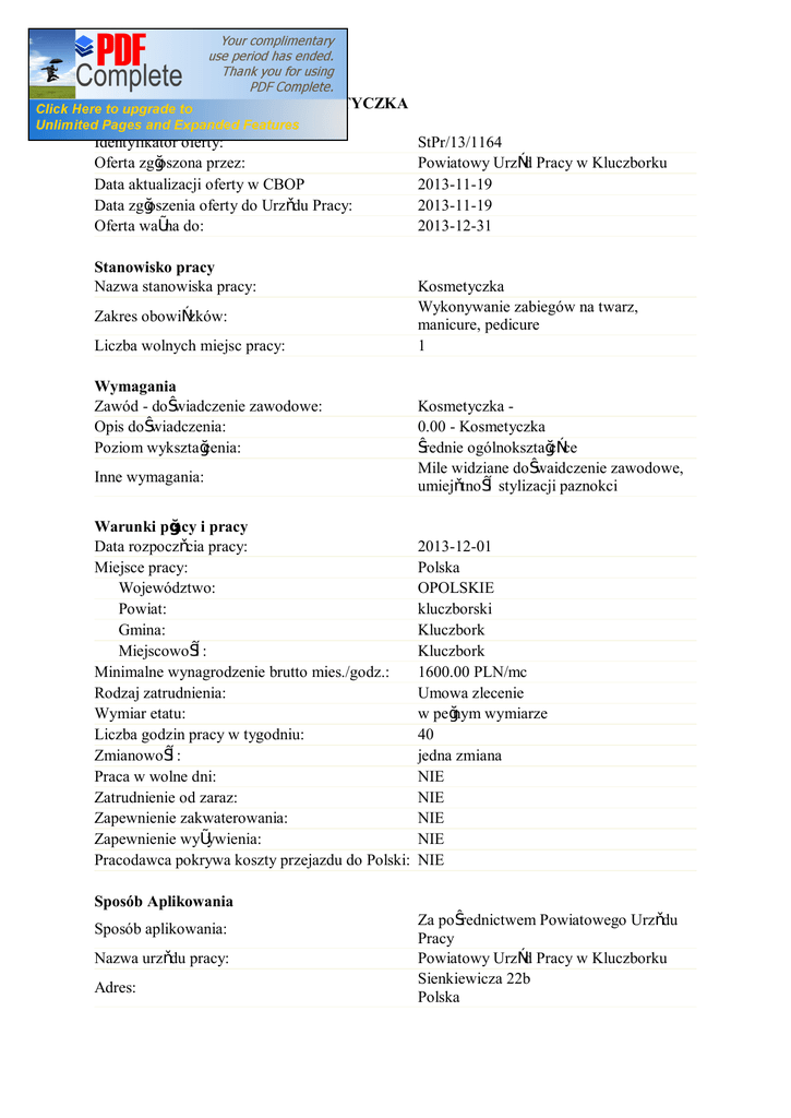 Szczegóły oferty pracy KOSMETYCZKA Identyfikacja oferty Identyfikator oferty: Oferta zgłoszona przez: Data aktualizacji oferty w CBOP Data zgłoszenia oferty do Urzędu Pracy: Oferta ważna do: Stanowisko pracy Nazwa stanowiska pracy: Zakres obowiązków: Liczba wolnych miejsc pracy: Wymagania Zawód - doświadczenie zawodowe: Opis doświadczenia: Poziom wykształcenia: Inne wymagania: Warunki płacy i pracy Data rozpoczęcia pracy: Miejsce pracy: Województwo: Powiat: Gmina: Miejscowość: Minimalne wynagrodzenie brutto mies./godz.: Rodzaj zatrudnienia: Wymiar etatu: Liczba godzin pracy w tygodniu: Zmianowość: Praca w wolne dni: Zatrudnienie od zaraz: Zapewnienie zakwaterowania: Zapewnienie wyżywienia: Pracodawca pokrywa koszty przejazdu do Polski: StPr/13/1164 Powiatowy Urząd Pracy w Kluczborku 2013-11-19 2013-11-19 2013-12-31 Kosmetyczka Wykonywanie zabiegów na twarz, manicure, pedicure 1 Kosmetyczka 0.00 - Kosmetyczka średnie ogólnokształcące Mile widziane dośwaidczenie zawodowe, umiejętność stylizacji paznokci 2013-12-01 Polska OPOLSKIE kluczborski Kluczbork Kluczbork 1600.00 PLN/mc Umowa zlecenie w pełnym wymiarze 40 jedna zmiana NIE NIE NIE NIE NIE Sposób Aplikowania Sposób aplikowania: Nazwa urzędu pracy: Adres: Za pośrednictwem Powiatowego Urzędu Pracy Powiatowy Urząd Pracy w Kluczborku Sienkiewicza 22b Polska Osoba do kontaktu: Nr telefonu: Wymagane dokumenty: Język składania aplikacji: Oferta pracy została udostępniona na portalu Europejskich Służb Zatrudnienia w dniu: Urząd jest w stanie sam wykorzystać ofertę: Czy oferta jest subsydiowana: Czy oferta jest finansowana z PFRON: Justyna Miśkiewicz 774471333 cv polski 2013-11-19 TAK NIE NIE