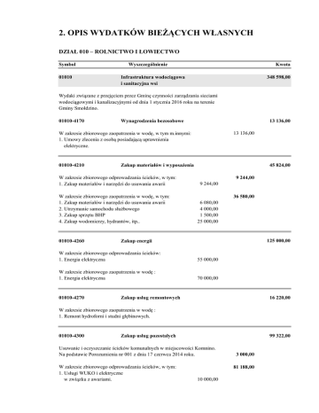 2. OPIS WYDATKÓW BIEŻĄCYCH WŁASNYCH DZIAŁ 010 – ROLNICTWO I ŁOWIECTWO Symbol 01010 Wyszczególnienie Kwota 348 598,00 Infrastruktura wodociągowa i sanitacyjna wsi Wydaki związane z przejęciem przez Gminę czynności zarządzania sieciami wodociągowymi i kanalizacyjnymi od dnia 1 stycznia 2016 roku na terenie Gminy Smołdzino. 01010-4170 13 136,00 Wynagrodzenia bezosobowe 13 136,00 W zakresie zbiorowego zaopatrzenia w wodę, w tym m.innymi: 1. Umowy zlecenia z osobą posiadającą uprawnienia elektryczne. 01010-4210 Zakup materiałów i wyposażenia W zakresie zbiorowego odprowadzania ścieków, w tym: 1. Zakup materiałów i narzędzi do usuwania awarii W zakresie zbiorowego zaopatrzenia w wodę, w tym: 1. Zakup materiałów i narzędzi do usuwania awarii 2. Utrzymanie samochodu służbowego 3. Zakup sprzętu BHP 4. Zakup wodomierzy, hydrantów, itp.. 01010-4260 45 824,00 9 244,00 9 244,00 36 580,00 6 080,00 4 000,00 1 500,00 25 000,00 125 000,00 Zakup energii W zakresie zbiorowego odprowadzania ścieków: 1. Energia elektryczna 55 000,00 W zakresie zbiorowego zaopatrzenia w wodę : 1. Energia elektryczna 70 000,00 01010-4270 Zakup usług remontowych 16 220,00 W zakresie zbiorowego zaopatrzenia w wodę : 1. Remont hydroforni i studni głębinowych. 01010-4300 Zakup usług pozostałych 99 322,00 Usuwanie i oczyszczanie ścieków komunalnych w miejscowości Komnino. Na podstawie Porozumienia nr 001 z dnia 17 czerwca 2014 roku. W zakresie zbiorowego odprowadzania ścieków, w tym: 1. Usługi WUKO i elektryczne w związku z awariami. 3 000,00 81 188,00 10 000,00 2. Gospodarka odpadami - wywóz osadu, skratki, piaskownika. 3. Naprawy pomp i silników. 4. Wywóz nieczystości Komnino, Żelazo, Gardna Mała. W zakresie zbiorowego zaopatrzenia w wodę, w tym : 1. Dozór techniczny. 2. Naprawa pomp i silnków. 01010-4360 15 000,00 6 000,00 50 188,00 15 134,00 2 500,00 12 634,00 2 366,00 Opłaty z tytułu zakupu usług telekomunikacyjnych Wydatek związany z siecią monitoringu obiektów wodno-kanalizacyjnych w Gminie Smołdzino - opłata za pakiet transmisyjny. 01010-4390 Zakup usług obejmujących wykonanie ekspertyz, analiz i opinii W zakresie zbiorowego odprowadzania ścieków, w tym: 1. Badania ścieków. 2 500,00 W zakresie zbiorowego zaopatrzenia w wodę, w tym : 1. Badanie wody. 5 000,00 01010-4430 7 500,00 Różne opłaty i składki 4 500,00 W zakresie zbiorowego odprowadzania ścieków, w tym: 1. Ubezpieczenie. 2 500,00 W zakresie zbiorowego zaopatrzenia w wodę, w tym : 1. Ubezpieczenie. 2 000,00 01010-4510 30 000,00 Opłaty na rzecz budżetu państwa W zakresie zbiorowego odprowadzania ścieków, w tym: 1. Opłata dot. ochrony środowiska. 10 000,00 W zakresie zbiorowego zaopatrzenia w wodę, w tym : 1. Opłata dot. ochrony środowiska. 20 000,00 01010-4530 Podatek od towarów i usług (VAT) W zakresie zbiorowego odprowadzania ścieków, w tym: Podatek od towarów i usług (VAT). Przy założeniu: miesięczna wartość podatu VAT od sprzedaży opodatkowanej wynosi 889,97 zł, zabezpieczenie na dwa miesiące, do chwili możliwości odliczenia VAT od zakupów. W zakresie zbiorowego zaopatrzenia w wodę, w tym: Podatek od towarów i usług (VAT). 4 730,00 1 780,00 Przy założeniu: miesięczna wartość podatu VAT od sprzedaży opodatkowanej wynosi 1.475,0 zł, zabezpieczenie na dwa miesiące, do chwili możliwości odliczenia VAT od zakupów. 2 950,00 01030 Izby rolnicze 6 066,00 01030-2850 Wpłaty gmin na rzecz izb rolniczych w wysokości 2% uzyskanych wpływów z podatku rolnego 6 066,00 Planowane wpływy z tytułu podatku rolnego 303 283 6 065,66 X 2% = 354 664,00 OGÓŁEM DZIAŁ 010 –ROLNICTWO I ŁOWIECTWO DZIAŁ 600 - TRANSPORT I ŁĄCZNOŚĆ Symbol Wyszczególnienie Kwota 60016 Drogi publiczne gminne 164 000,00 60016-4210 Zakup materiałów i wyposażenia 135 000,00 5 000,00 130 000,00 1. Zakup drogowskazów. 2. Zakup kruszywa. 60016-4270 10 000,00 Zakup usług remontowych Uzupełnienie nawierzchni – bieżące usuwanie uszkodzeń, bieżące utrzymanie dróg. 60016-4300 Zakup usług pozostałych Orzeczenia techniczne (np.. w sprawie mostu). 60016-4430 Różne opłaty i składki 4 000,00 4 000,00 15 000,00 Opłata składki OC dróg gminnych. Opłaty za zajęcie pasa drogowego dla Zarządu Dróg Powiatowych. OGÓŁEM DZIAŁ 600 - TRANSPORT I ŁĄCZNOŚĆ 164 000,00 DZIAŁ 630 – TURYSTYKA Symbol Wyszczególnienie Kwota 63003 Zadania w zakresie upowszechniania turystyki 26 500,00 63003-2820 Dotacja celowa z budżetu na finansowanie lub dofinansowanie zadań zleconych do realizacji stowarzyszeniom 15 000,00 Zadanie zlecone do realizacji organizacjom pozarządowych i podmiotom prowadzącym działalność pożytku publicznego, w formie: 1) powierzania wykonywania zadania publicznego wraz z udzieleniem dotacji na finansowanie lub dofinansowanie jego realizacji, 2) wspierania zadań publicznych wraz z udzielaniem dotacji na dofinansowanie jego realizacji 63003-4210 Zakup materiałów i wyposażenia 6 500,00 Zakup materiałów związanych z upowszechnianiem turystyki: 1. Zakup informatorów. 2. Zakup map. 63003-4300 Zakup usług pozostałych 5 000,00 Usługi reklamowe: - wynajem autobusu, - wynajem miejsca reklamowego, - wykonanie projektu upowszechniajacego turystykę. 63095 Pozostała działalność 17 000,00 63095-4300 Zakup usług pozostałych 15 000,00 Organizacja miejsca wykorzystywanego do kąpieli wraz z punktem ratownictwa medycznego w Czołpinie (podpisana zostanie umowa z WOPR w Słupsku - na okres dwóch miesięcy) 63095-4390 Zakup usług obejmujących wykonanie ekspertyz, analiz i opinii 2 000,00 Badanie wody w miejscu kąpieliska w Czołpinie (podpisana zostanie umowa z PSSE w Słupsku na badania mikrobiologiczne i ocenę wizualną wody - dwa badania dwóch próbek wody oraz każdorazwo przy zaistnieniu okoliczności wskazujących na potrzebę ich wykonania). OGÓŁEM DZIAŁ DZIAŁ 630 – TURYSTYKA 43 500,00 DZIAŁ 700 - GOSPODARKA MIESZKANIOWA Symbol Wyszczeg