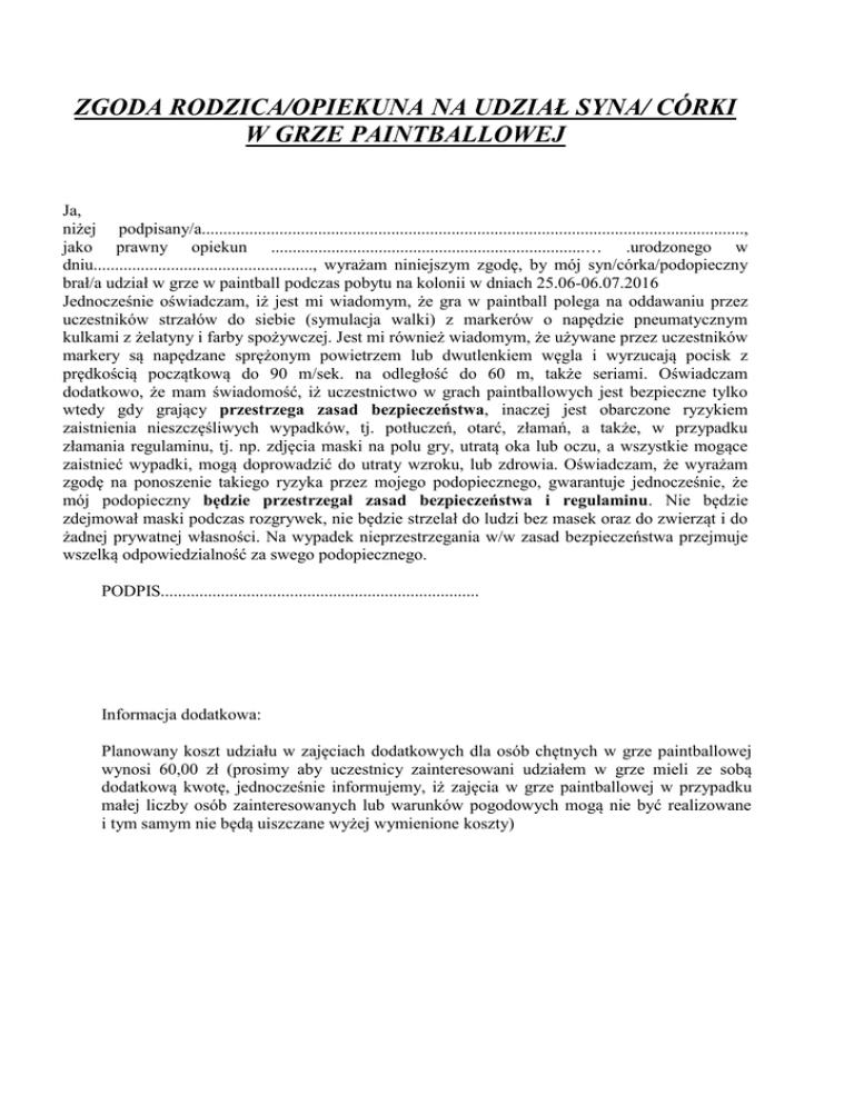 ZGODA RODZICA/OPIEKUNA NA UDZIAŁ SYNA/ CÓRKI W GRZE PAINTBALLOWEJ Ja, niżej podpisany/a.............................................................................................................................., jako prawny opiekun .........................................................................… .urodzonego w dniu..................................................., wyrażam niniejszym zgodę, by mój syn/córka/podopieczny brał/a udział w grze w paintball podczas pobytu na kolonii w dniach 25.06-06.07.2016 Jednocześnie oświadczam, iż jest mi wiadomym, że gra w paintball polega na oddawaniu przez uczestników strzałów do siebie (symulacja walki) z markerów o napędzie pneumatycznym kulkami z żelatyny i farby spożywczej. Jest mi również wiadomym, że używane przez uczestników markery są napędzane sprężonym powietrzem lub dwutlenkiem węgla i wyrzucają pocisk z prędkością początkową do 90 m/sek. na odległość do 60 m, także seriami. Oświadczam dodatkowo, że mam świadomość, iż uczestnictwo w grach paintballowych jest bezpieczne tylko wtedy gdy grający przestrzega zasad bezpieczeństwa, inaczej jest obarczone ryzykiem zaistnienia nieszczęśliwych wypadków, tj. potłuczeń, otarć, złamań, a także, w przypadku złamania regulaminu, tj. np. zdjęcia maski na polu gry, utratą oka lub oczu, a wszystkie mogące zaistnieć wypadki, mogą doprowadzić do utraty wzroku, lub zdrowia. Oświadczam, że wyrażam zgodę na ponoszenie takiego ryzyka przez mojego podopiecznego, gwarantuje jednocześnie, że mój podopieczny będzie przestrzegał zasad bezpieczeństwa i regulaminu. Nie będzie zdejmował maski podczas rozgrywek, nie będzie strzelał do ludzi bez masek oraz do zwierząt i do żadnej prywatnej własności. Na wypadek nieprzestrzegania w/w zasad bezpieczeństwa przejmuje wszelką odpowiedzialność za swego podopiecznego. PODPIS.......................................................................... Informacja dodatkowa: Planowany koszt udziału w zajęciach dodatkowych dla osób chętnych w grze paintballowej wynosi 60,00 zł (prosimy aby uczestnicy zainteresowani udziałem w grze mieli ze sobą dodatkową kwotę, jednocześnie informujemy, iż zajęcia w grze paintballowej w przypadku małej liczby osób zainteresowanych lub warunków pogodowych mogą nie być realizowane i tym samym nie będą uiszczane wyżej wymienione koszty)