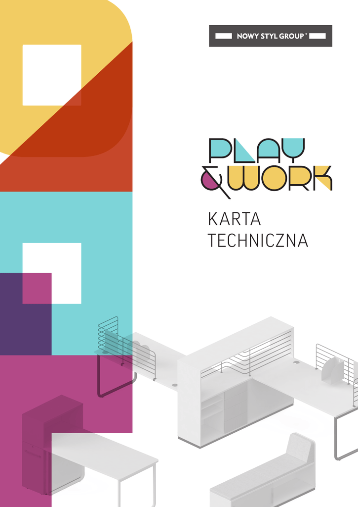 KARTA TECHNICZNA Opis techniczny 1. Biurka wolnostojące Biurko posiada solidną i wytrzymałą metalową konstrukcję nośną, na którą składają się podstawa oraz rama, do której montowany jest blat biurka wykonany z płyty wiórowej obustronnie melaminowanej, klasy E1 o grubości 25 mm. Rama – wykonana jest z zapewniającego odpowiednią sztywność profilu stalowego o przekroju prostokątnym, o wymiarach 30 × 40 mm i grubości ścianki 3 mm. Wykończenie ramy stanowi lakier proszkowy. Do belek ramy mocowana jest podstawa typu U (nogi zamknięte) wykonana z profilu o średnicy 40 mm, grubość ścianki 2 mm. Nogi – podstawy zaokrąglone są promieniem r = 40 mm (promień wewnętrzny). Belka górna nogi wykonana jest z profilu o przekroju 40 × 50 mm i grubości 3 mm. Dostępne są następujące typy blatów: –– blaty prostokątne, 6 –– blaty zaokrąglone promieniem 50 mm – jednostronnie bądź dwustronnie. Blaty prostokątne oraz blaty zaokrąglone jednostronnie pozwalają na integrację biurka z szafą. Konstrukcja ramy biurka umożliwia montaż poziomych kanałów kablowych. Montaż odbywa się przy pomocy łączników tworzywowych. Łączniki stosowane są również do montażu pionowych kanałów kablowych. 7 5 12 8 8 9 10 16 11 15 2 13 3 14 4 1 2 – 4 1 Podstawa metalowa typu U 9 Tablica magnetyczna 2 Blat prostokątny 10 Piórnik 3 Blat zaokrąglony jednostronnie 11 Nakładka tapicerowana 4 Blat zaokrąglony obustronnie (wolnostojące) 12 Panel górny tapicerowany 5 Panele metalowe 13 Panel dolny tapicerowany 6 Półka na dokumenty pozioma (A4) 14 Kanał kablowy pionowy 7 Półka na segregatory 15 Kanał kablowy poziomy 8 Tablica magnetyczna z piórnikiem 16 Organizer metalowy wolnostojący 2 Grupa Nowy Styl zastrzega sobie prawo do zmian konstrukcyjnych produktów/ Opis techniczny 1200 1400 1600 1800 2000 Blat zaokrąglony obustronnie (wolnostojące) 1200 1400 1600 1800 2000 Blat zaokrąglony jednostronnie 1200 1400 1600 1800 2000 Blat prostokątny 800 800 800 2. Biurka wolnostojące – blaty prostokątne z płyty komórkowej Biurko posiada solidną i wytrzymałą metalową konstrukcję nośną, na którą składają się podstawa oraz rama, do której montowany jest blat biurka. Rama – wykonana jest z zapewniającego odpowiednią sztywność profilu stalowego o przekroju prostokątnym, o wymiarach 30 × 40 mm i grubości ścianki 3 mm. Wykończenie ramy stanowi lakier proszkowy. Mocowanie blatu biurka wykonanego z płyty komórkowej do ramy realizowane jest przy użyciu złącz Hettinject. Blaty biurek – wykonane z płyty komórkowej grubości 25 mm pokryte są jednostronnie laminatem HPL. Spodnia część blatu pokryta jest laminatem przeciwprężnym w kolorze szarym. Rama połączona jest z podstawą za pomocą opatentowanego złącza: łącznik – kostka. Konstrukcja ramy biurka umożliwia montaż poziomych kanałów kablowych. Montaż odbywa się przy pomocy łączników tworzywowych. Łączniki stosowane są również do montażu pionowych kanałów kablowych. 800 1600 1800 2000 1600 1800 2000 1200 1400 1600 1800 2000 Biurko prostokątne z opatentowanym rozwiązaniem 900 1000 3. Akcesoria System Play&Work oferuje bogatą gamę akcesoriów 3-go poziomu. Wśród akcesoriów możemy wyróżnić: Panele tapicerowane – dostępne są panele górne oraz panele dolne, montowane do ramy biurka przy pomocy metalowych łączników. System oferuje panele w pełni tapicerowane – tapicerka Blazer (100% wełna). Wewnątrz panelu znajduje się rama z drewna wypełniona rdzeniem z płyty pilśniowej. Konstrukcja paneli tapicerowanych umożliwia wbijanie pinezek. Panele metalowe – mocowane są bezpośrednio do powierzchni blatu biurka. Montaż panelu odbywa się poprzez nasunięcie panelu na blat biurka. W celu zabezpieczenia panelu przed przesunięciem, jest on mocowany do spodniej części blatu przy pomocy wkrętu dociskowego (brak ingerencji w powierzchnię blatu). System zapewnia łatwy montaż oraz demontaż panelu. Panele wykonane są z pręta metalowego (Ø 10 mm), malowanego proszkowo na kolor biały, czarny lub alu. Panele dostępne są w 2 wysokościach oraz szerokościach. Akcesoria mocowane na panel metalowy – konstrukcja akcesoriów umożliwia beznarzędziowy montaż zarówno do paneli w biurkach, jak i paneli metalowych, które są elementem szafy. Nakładki tapicerowane na panel metalowy – wykonane są z tkaniny Blazer (100% wełna). Montaż nakładek odbywa się poprzez ich nałożenie na panel i zasunięcie zamka. Organizery drewniane na blat biurka – mobilny organizer drewniany, dzięki integracji piórnika z panelem metalowym, pomaga w organizacji miejsca pracy. Na panelu mogą być zawieszone zarówno akcesoria metalowe, np. tablica magnetyczna, jak i nakładki tapicerowane (możliwość wbijania pinezek). Kanały kablowe – biurka oraz workbenche mogą być wyposażone w poziome oraz pionowe kanały kablowe. Poziome kanały kablowe, wykonane z metalu, montowane są do ramy biurka przy pomocy dedykowanych łączników tworzywowych. Montaż odbywa się bez użycia narzędzi. Kanały poziome dostarczane są w zestawach po 2 szt. Montaż kanałów kablowych pionowych również odbywa się przy użyciu łączników tworzywowych. Pionowe kanały kablowe dostępne w ramach systemu Play&Work wykonane są z tkaniny Blazer (100% wełna). Kanały dostępne są w 2 wysokościach – 850 oraz 1200 mm. Kanał o długości 850 mm dedykowany jest do wszystkich typów biurek oraz workbenchy. Kanał o długości 1200 mm dedykowany jest do montażu do stolika zintegrowanego z szafą. mm 720 2000 1800 270 370 530 400 Wysokość biurka 740 | wymiary w mm 720 400 1120 1600 1200 1400 1000 Panele do biurek 400 PLAY&WORK 2015 › PL 3 Opis techniczny 4. Big Orga Tower Big Orga Tower wykonany jest z płyty wiórowej obustronnie melaminowanej, klasy E1 o grubości 18 oraz 25 mm. Kontenery Big Orga Tower dostępne są na cokole metalowym, wyposażonym w me