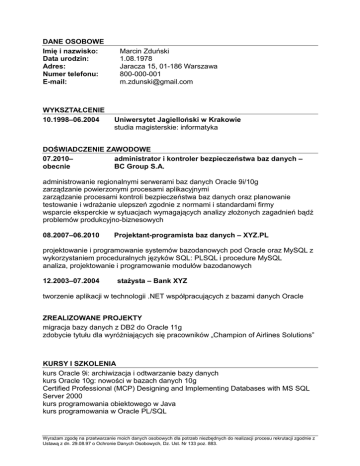 DANE OSOBOWE Imię i nazwisko: Data urodzin: Adres: Numer telefonu: E-mail: WYKSZTAŁCENIE 10.1998–06.2004 Marcin Zduński 1.08.1978 Jaracza 15, 01-186 Warszawa 800-000-001 [email protected] Uniwersytet Jagielloński w Krakowie studia magisterskie: informatyka DOŚWIADCZENIE ZAWODOWE 07.2010– administrator i kontroler bezpieczeństwa baz danych – obecnie BC Group S.A. administrowanie regionalnymi serwerami baz danych Oracle 9i/10g zarządzanie powierzonymi procesami aplikacyjnymi zarządzanie procesami kontroli bezpieczeństwa baz danych oraz planowanie testowanie i wdraŜanie ulepszeń zgodnie z normami i standardami firmy wsparcie eksperckie w sytuacjach wymagających analizy złoŜonych zagadnień bądź problemów produkcyjno-biznesowych 08.2007–06.2010 Projektant-programista baz danych – XYZ.PL projektowanie i programowanie systemów bazodanowych pod Oracle oraz MySQL z wykorzystaniem proceduralnych języków SQL: PLSQL i procedure MySQL analiza, projektowanie i programowanie modułów bazodanowych 12.2003–07.2004 staŜysta – Bank XYZ tworzenie aplikacji w technologii .NET współpracujących z bazami danych Oracle ZREALIZOWANE PROJEKTY migracja bazy danych z DB2 do Oracle 11g zdobycie tytułu dla wyróŜniających się pracowników „Champion of Airlines Solutions” KURSY I SZKOLENIA kurs Oracle 9i: archiwizacja i odtwarzanie bazy danych kurs Oracle 10g: nowości w bazach danych 10g Certified Professional (MCP) Designing and Implementing Databases with MS SQL Server 2000 kurs programowania obiektowego w Java kurs programowania w Oracle PL/SQL WyraŜam zgodę na przetwarzanie moich danych osobowych dla potrzeb niezbędnych do realizacji procesu rekrutacji zgodnie z Ustawą z dn. 29.08.97 o Ochronie Danych Osobowych, Dz. Ust. Nr 133 poz. 883. NAJWAśNIEJSZE UMIEJĘTNOŚCI administracja, optymalizacja i projektowanie baz danych w oparciu o rozwiązanie MySQL administracja systemami Linux, FreeBSD bardzo dobra znajomość systemów operacyjnych Windows administracja i konfiguracja wirtualnych desktopów w opraciu o VMware View znajomość popularnych platform HTTP (Apache, Nginx, Lighttpd) dobra znajomość aplikacji realizujących backup (Backup Exec, Rsync) system kontroli wersji Subversion (SVN) bardzo dobra znajomość SQL DODATKOWE INFORMACJE Języki obce: angielski (certyfikat egzamin FCE) Inne: prawo jazdy kategorii B Zainteresowania: nurkowanie, fotografia WyraŜam zgodę na przetwarzanie moich danych osobowych dla potrzeb niezbędnych do realizacji procesu rekrutacji zgodnie z Ustawą z dn. 29.08.97 o Ochronie Danych Osobowych, Dz. Ust. Nr 133 poz. 883.