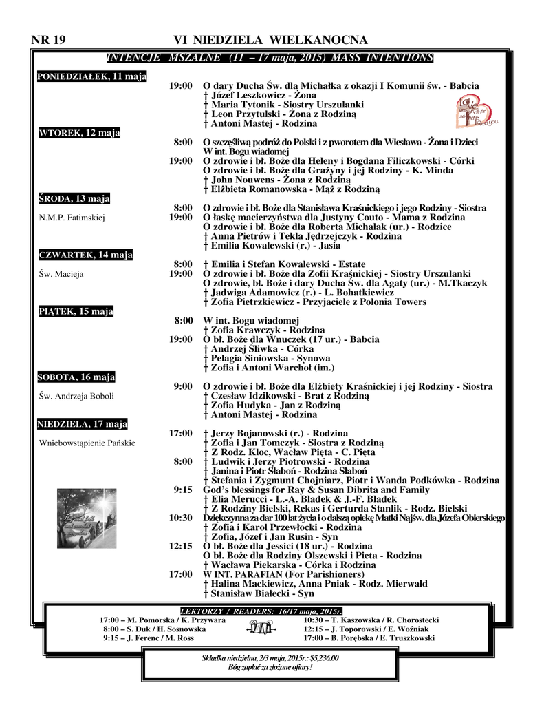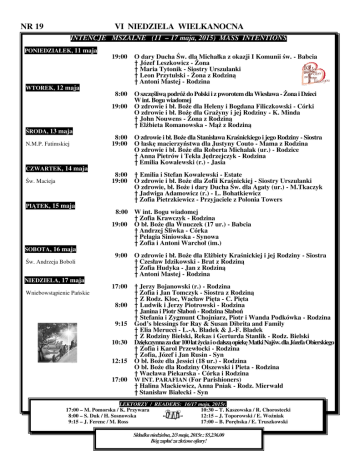 NR 19 VI NIEDZIELA WIELKANOCNA INTENCJE MSZALNE (11 – 17 maja, 2015) MASS INTENTIONS B³ PONIEDZIAŁEK, 11 maja WTOREK, 12 maja 19:00 O dary Ducha Św. dla Michałka z okazji I Komunii św. - Babcia † Józef Leszkowicz - Żona † Maria Tytonik - Siostry Urszulanki † Leon Przytulski - Żona z Rodziną † Antoni Mastej - Rodzina 8:00 O szczęśliwą podróż do Polski i z pworotem dla Wiesława - Żona i Dzieci W int. Bogu wiadomej O zdrowie i bł. Boże dla Heleny i Bogdana Filiczkowski - Córki O zdrowie i bł. Boże dla Grażyny i jej Rodziny - K. Minda † John Nouwens - Żona z Rodziną † Elżbieta Romanowska - Mąż z Rodziną 19:00 ŚRODA, 13 maja N.M.P. Fatimskiej CZWARTEK, 14 maja Św. Macieja PIĄTEK, 15 maja SOBOTA, 16 maja Św. Andrzeja Boboli NIEDZIELA, 17 maja Wniebowstąpienie Pańskie 8:00 19:00 O zdrowie i bł. Boże dla Stanisława Kraśnickiego i jego Rodziny - Siostra O łaskę macierzyństwa dla Justyny Couto - Mama z Rodzina O zdrowie i bł. Boże dla Roberta Michalak (ur.) - Rodzice † Anna Pietrów i Tekla Jędrzejczyk - Rodzina † Emilia Kowalewski (r.) - Jasia 8:00 19:00 † Emilia i Stefan Kowalewski - Estate O zdrowie i bł. Boże dla Zofii Kraśnickiej - Siostry Urszulanki O zdrowie, bł. Boże i dary Ducha Św. dla Agaty (ur.) - M.Tkaczyk † Jadwiga Adamowicz (r.) - L. Bohatkiewicz † Zofia Pietrzkiewicz - Przyjaciele z Polonia Towers 8:00 W int. Bogu wiadomej † Zofia Krawczyk - Rodzina 19:00 O bł. Boże dla Wnuczek (17 ur.) - Babcia † Andrzej Śliwka - Córka † Pelagia Siniowska - Synowa † Zofia i Antoni Warchoł (im.) 9:00 17:00 8:00 9:15 10:30 12:15 17:00 O zdrowie i bł. Boże dla Elżbiety Kraśnickiej i jej Rodziny - Siostra † Czesław Idzikowski - Brat z Rodziną † Zofia Hudyka - Jan z Rodziną † Antoni Mastej - Rodzina † Jerzy Bojanowski (r.) - Rodzina † Zofia i Jan Tomczyk - Siostra z Rodziną † Z Rodz. Kloc, Wacław Pięta - C. Pięta † Ludwik i Jerzy Piotrowski - Rodzina † Janina i Piotr Słaboń - Rodzina Słaboń † Stefania i Zygmunt Chojniarz, Piotr i Wanda Podkówka - Rodzina God’s blessings for Ray & Susan Dibrita and Family † Elia Merucci - L.-A. Bladek & J.-F. Bladek † Z Rodziny Bielski, Rekas i Gerturda Stanlik - Rodz. Bielski Dziękczynna za dar 100 lat życia i o dalszą opiekę Matki Najśw. dla Józefa Obierskiego † Zofia i Karol Przewłocki - Rodzina † Zofia, Józef i Jan Rusin - Syn O bł. Boże dla Jessici (18 ur.) - Rodzina O bł. Boże dla Rodziny Olszewski i Pieta - Rodzina † Wacława Piekarska - Córka i Rodzina W INT. PARAFIAN (For Parishioners) † Halina Mackiewicz, Anna Pniak - Rodz. Mierwald † Stanisław Białecki - Syn LEKTORZY / READERS: 16/17 maja, 2015r. 17:00 – M. Pomorska / K. Przywara 10:30 – T. Kaszowska / R. Chorostecki 8:00 – S. Duk / H. Sosnowska 12:15 – J. Toporowski / E. Woźniak 9:15 – J. Ferenc / M. Ross 17:00 – B. Porębska / E. Truszkowski Składka niedzielna, 2/3 maja, 2015r.: $5,236.00 Bóg zapłać za złożone ofiary!