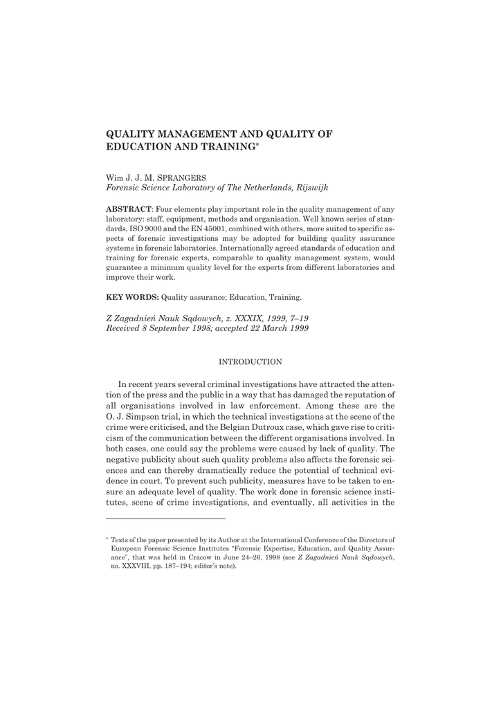 QUALITY MANAGEMENT AND QUALITY OF EDUCATION AND TRAINING* Wim J. J. M. SPRANGERS Forensic Science Laboratory of The Netherlands, Rijswijk ABSTRACT: Four elements play important role in the quality management of any laboratory: staff, equipment, methods and organisation. Well known series of standards, ISO 9000 and the EN 45001, combined with others, more suited to specific aspects of forensic investigations may be adopted for building quality assurance systems in forensic laboratories. Internationally agreed standards of education and training for forensic experts, comparable to quality management system, would guarantee a minimum quality level for the experts from different laboratories and improve their work. KEY WORDS: Quality assurance; Education, Training. Z Zagadnieñ Nauk S¹dowych, z. XXXIX, 1999, 7–19 Received 8 September 1998; accepted 22 March 1999 INTRODUCTION In recent years several criminal investigations have attracted the attention of the press and the public in a way that has damaged the reputation of all organisations involved in law enforcement. Among these are the O. J. Simpson trial, in which the technical investigations at the scene of the crime were criticised, and the Belgian Dutroux case, which gave rise to criticism of the communication between the different organisations involved. In both cases, one could say the problems were caused by lack of quality. The negative publicity about such quality problems also affects the forensic sciences and can thereby dramatically reduce the potential of technical evidence in court. To prevent such publicity, measures have to be taken to ensure an adequate level of quality. The work done in forensic science institutes, scene of crime investigations, and eventually, all activities in the * Texts of the paper presented by its Author at the International Conference of the Directors of European Forensic Science Institutes “Forensic Expertise, Education, and Quality Assurance”, that was held in Cracow in June 24–26, 1998 (see Z Zagadnieñ Nauk S¹dowych, no. XXXVIII, pp. 187–194; editor’s note). 8 W. J. J. M. Sprangers chain of criminal investigation and prosecution must have adequate, controlled, and undisputed quality. Now what exactly is quality? Most people have an instinctive idea of what is meant: a Rolls Royce has quality. Quality is associated with a certain degree of excellence. In quality management however, quality has to do with the relation between a certain product – or service – and its purpose. This way of thinking is expressed in the definition the International Organisation of Standardisation (ISO) has given of quality: “Quality is the degree to which all the properties of a product, process or service meet the requirements imposed on them as a result of the intended purpose”. In this approach, considering the product is the first step towards quality management. It should however be realised that a product is the result of a process, and a process takes place within an organisation, which has its place among other organisations and in society. In modern approaches to quality management, such relationships are becoming more and more important. QUALITY MANAGEMENT SYSTEMS: CONTROL OVER QUALITY A good product should not be a “lucky shot”. Its properties should be under control. A quality management system – a system of administrative procedures and rules – enables an organisation to control the process and all factors that might influence the quality of the product. In several standards quality management systems are described. A well known series of standards is the ISO 9000 series. Another International standard, specifically aimed at laboratories, is the EN 45001. This standard defines a quality management system that is suitable for testing laboratories. In contrast to the ISO 9000 series, it pays a lot of attention to professional skills and the quality of the methods used and their results. In the EN 45001, the desired quality of the product is not only determined by the client (the ISO-9000-philosophy), but also by professional standards. From the point of view of forensic science, the EN 45001 has certain drawbacks. It mainly considers tests and chemical analyses that take place on a regular basis. Tests that are carried out very infrequently, which is often the case in forensic work, do not fit very well within this framework. Also, the scope of this standard is strictly limited to “objective tests”. Interpretation of test results is an important part of the work of forensic scientists. Often the interpretation process can be proven to be objective, but if this is not the case, it has to be qualified as an expert opinion which is not within the scope of standards like the EN 45001. Quality management and quality of education ... 9 This does not imply, however, that the EN 45001 cannot be used by forensic science institutes. It just means it can only be applied to certain aspects of forensic work, which at least is a good starting point. For the more complicated aspects of forensic science other solutions can be found, if necessary at a later stage. It may for instance be possible to combine the EN 45001 with other standards that are more suited to these specific aspects. Whichever standard is being used, there are several elements that will always play an important role in the quality management system of any laboratory. The first one is staff. Education, training, experience and professional skills are the keywords here, as well as maintenance of these qualities. The second element is equipment and instruments, which should be suitable for the purpose intended, calibrated and well maintained. The third factor is the methods used. They should be validated, for instance by means of proficiency tests and inter-laboratory comparisons, and also be fit for purpose. The last element of a quality management system comprises organisational aspects. The structure of the organisation s
