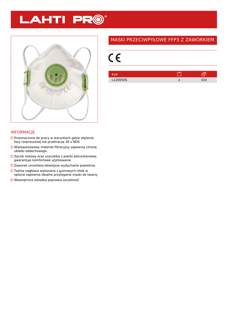 Powered by TCPDF (www.tcpdf.org) MASKI PRZECIWPYŁOWE FFP3 Z ZAWORKIEM Kod L120050S INFORMACJE Przeznaczone do pracy w warunkach gdzie stężenie fazy rozproszonej nie przekracza 30 x NDS Wielowarstwowy materiał filtracyjny zapewnia chronę układu oddechowego Zacisk nosowy oraz uszczelka z pianki poliuretanowej gwarantuje komfortowe użytkowanie Zaworek umożliwia łatwiejsze wydychanie powietrza Taśma nagłowia wykonana z gumowych nitek w oplocie zapewnia idealne przyleganie maski do twarzy Wewnętrzna wkładka poprawia szczelność x 333