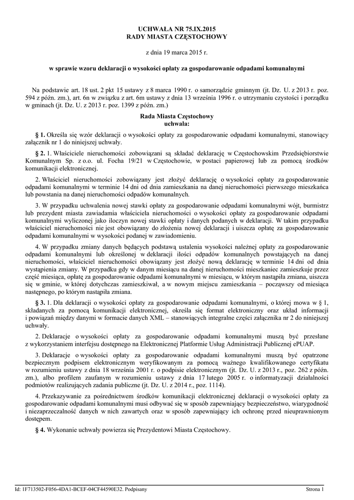 UCHWAŁA NR 75.IX.2015 RADY MIASTA CZĘSTOCHOWY z dnia 19 marca 2015 r. w sprawie wzoru deklaracji o wysokości opłaty za gospodarowanie odpadami komunalnymi Na podstawie art. 18 ust. 2 pkt 15 ustawy z 8 marca 1990 r. o samorządzie gminnym (jt. Dz. U. z 2013 r. poz. 594 z późn. zm.), art. 6n w związku z art. 6m ustawy z dnia 13 września 1996 r. o utrzymaniu czystości i porządku w gminach (jt. Dz. U. z 2013 r. poz. 1399 z późn. zm.) Rada Miasta Częstochowy uchwala: § 1. Określa się wzór deklaracji o wysokości opłaty za gospodarowanie odpadami komunalnymi, stanowiący załącznik nr 1 do niniejszej uchwały. § 2. 1. Właściciele nieruchomości zobowiązani są składać deklarację w Częstochowskim Przedsiębiorstwie Komunalnym Sp. z o.o. ul. Focha 19/21 w Częstochowie, w postaci papierowej lub za pomocą środków komunikacji elektronicznej. 2. Właściciel nieruchomości zobowiązany jest złożyć deklarację o wysokości opłaty za gospodarowanie odpadami komunalnymi w terminie 14 dni od dnia zamieszkania na danej nieruchomości pierwszego mieszkańca lub powstania na danej nieruchomości odpadów komunalnych. 3. W przypadku uchwalenia nowej stawki opłaty za gospodarowanie odpadami komunalnymi wójt, burmistrz lub prezydent miasta zawiadamia właściciela nieruchomości o wysokości opłaty za gospodarowanie odpadami komunalnymi wyliczonej jako iloczyn nowej stawki opłaty i danych podanych w deklaracji. W takim przypadku właściciel nieruchomości nie jest obowiązany do złożenia nowej deklaracji i uiszcza opłatę za gospodarowanie odpadami komunalnymi w wysokości podanej w zawiadomieniu. 4. W przypadku zmiany danych będących podstawą ustalenia wysokości należnej opłaty za gospodarowanie odpadami komunalnymi lub określonej w deklaracji ilości odpadów komunalnych powstających na danej nieruchomości, właściciel nieruchomości obowiązany jest złożyć nową deklarację w terminie 14 dni od dnia wystąpienia zmiany. W przypadku gdy w danym miesiącu na danej nieruchomości mieszkaniec zamieszkuje przez część miesiąca, opłatę za gospodarowanie odpadami komunalnymi w miesiącu, w którym nastąpiła zmiana, uiszcza się w gminie, w której dotychczas zamieszkiwał, a w nowym miejscu zamieszkania – począwszy od miesiąca następnego, po którym nastąpiła zmiana. § 3. 1. Dla deklaracji o wysokości opłaty za gospodarowanie odpadami komunalnymi, o której mowa w § 1, składanych za pomocą komunikacji elektronicznej, określa się format elektroniczny oraz układ informacji i powiązań między danymi w formacie danych XML – stanowiących integralne części załącznika nr 2 do niniejszej uchwały. 2. Deklaracje o wysokości opłaty za gospodarowanie odpadami komunalnymi muszą być przesłane z wykorzystaniem interfejsu dostępnego na Elektronicznej Platformie Usług Administracji Publicznej ePUAP. 3. Deklaracje o wysokości opłaty za gospodarowanie odpadami komunalnymi muszą być opatrzone bezpiecznym podpisem elektronicznym weryfikowanym za pomocą ważnego kwalifikowanego certyfikatu w rozumieniu ustawy z dnia 18 września 2001 r. o podpisie elektronicznym (jt. Dz. U. z 2013 r., poz. 262 z późn. zm.), albo profilem zaufanym w rozumieniu ustawy z dnia 17 lutego 2005 r. o informatyzacji działalności podmiotów realizujących zadania publiczne (jt. Dz. U. z 2014 r., poz. 1114). 4. Przekazywanie za pośrednictwem środków komunikacji elektronicznej deklaracji o wysokości opłaty za gospodarowanie odpadami komunalnymi musi odbywać się w sposób zapewniający bezpieczeństwo, wiarygodność i niezaprzeczalność danych w nich zawartych oraz w sposób zapewniający ich ochronę przed nieuprawnionym dostępem. § 4. Wykonanie uchwały powierza się Prezydentowi Miasta Częstochowy. Id: 1F713502-F056-4DA1-BCEF-04CF44590E32. Podpisany Strona 1 § 5. 1. Traci moc uchwała nr 632/XXXV/2013 Rady Miasta Częstochowy z dnia 29 marca 2013 r. w sprawie wzoru deklaracji o wysokości opłaty za gospodarowanie odpadami komunalnymi zmieniona uchwałą nr 828/XLVII/2013 z dnia 30 grudnia 2013 r. 2. Dotychczas złożone deklaracje zachowują swoją moc i są wiążące. § 6. Uchwała wchodzi w życie po upływie 14 dni od dnia jej ogłoszenia w Dzienniku Urzędowym Województwa Śląskiego z mocą obowiązującą od dnia 1 lipca 2015 r. Przewodniczący Rady Miasta Częstochowy Zdzisław Wolski Id: 1F713502-F056-4DA1-BCEF-04CF44590E32. Podpisany Strona 2 POLA JASNE WYPEŁNIA WŁAŚCICIEL NIERUCHOMOŚCI KOMPUTEROWO LUB RĘCZNIE, DUśYMI, DRUKOWANYMI LITERAMI, CZARNYM LUB NIEBIESKIM KOLOREM 1. PESEL/REGON WŁAŚCICIELA NIERUCHOMOŚCI Załącznik Nr 1 do Uchwały Nr 75.IX.2015 Rady Miasta Częstochowy z dnia 19 marca 2015 r. DO-1 DEKLARACJA O WYSOKOŚCI OPŁATY ZA GOSPODAROWANIE ODPADAMI KOMUNALNYMI 2. Dzień-Miesiąc-Rok ……..-….....-…………... Podstawa prawna: Ustawa z dnia 13 września 1996 r. o utrzymaniu czystości i porządku w gminach (tekst jednolity Dz.U. z 2013 r., poz. 1399 z późn. zm.) Składający: Właściciel nieruchomości, na której zamieszkują oraz właściciel nieruchomości na której nie zamieszkują mieszkańcy w rozumieniu ustawy o utrzymaniu czystości i porządku w gminach1 Termin składania: W ciągu 14 dni od dnia zamieszkania pierwszego mieszkańca lub powstania odpadów komunalnych lub 14 dni od dnia, w którym nastąpiły zmiany danych określonych w deklaracji Miejsce składania: Częstochowskie Przedsiębiorstwo Komunalne Spółka z o.o., ul. Focha 19/21, Częstochowa 42-217 A. PODMIOT DO KTÓREGO SKŁADANA JEST DEKLARACJA 3. Nazwa i adres siedziby organu, do którego naleŜy złoŜyć deklarację Prezydent Miasta Częstochowy w imieniu którego działa Częstochowskie Przedsiębiorstwo Komunalne Spółka z ograniczoną odpowiedzialnością B. OBOWIĄZEK ZŁOśENIA DEKLARACJI Obowiązek złoŜenia deklaracji wynika z art. 6k ustawy 4. Cel złoŜenia deklaracji (zaznacz właściwy kwadrat) złoŜenie de
