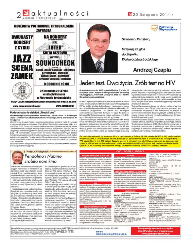 2 aktualności 20 listopada 2014 r Ziemia Piotrkowska Szanowni Państwo, Dziękuję za głos do Sejmiku Województwa Łódzkiego Andrzej Czapla Jeden test. Dwa życia. Zrób test na HIV Krajowe Centrum ds. AIDS, agenda Ministra Zdrowia, 20 listopada 2014 r. rozpoczyna ogólnopolską kampanię edukacyjną pt. Jeden test. Dwa życia. Zrób test na HIV. Dla siebie i swojego dziecka. Podsumowanie działań „Truck i bus” Piotrkowscy policjanci prowadzili działania pn. „Truck & Bus”. W akcji wzięło udział 14 funkcjonariuszy Wydziału Ruchu Drogowego, którzy skontrolowali 36 kierujących. We wtorek na drogach miasta i powiatu piotrkowskiego policjanci ruchu drogowego przeprowadzili działania pod nazwą „Truck & Bus”. Akcja była prowadzona w godzinach od 6.00 do 22.00. Funkcjonariusze szczególnie bacznie przyjrzeli się kierowcom busów i samochodów ciężarowych. W akcji wzięło udział 14 policjantów z Wydziału Ruchu Drogowego piotrkowskiej jednostki. Stróże prawa skontrolowali 36 pojazdów, w tym 2 busy i 16 samochodów ciężarowych. W trakcie kilkunastogodzinnych działań funkcjonariusze zatrzymali 3 dowody rejestracyjne z uwagi na brak ważnych badań technicznych pojazdów. Ponadto nałożyli 19 mandatów karnych, z powodu złego stanu technicznego kontrolowanych samochodów i przekroczenia dozwolonej prędkości przez kierowców. Podobne działania będą prowadzone cyklicznie.- mówi mł.asp.Ilona Sidorko z zespou prasowego piotrkowskiej policji. STANISŁAW STĘPIEŃ Od początku epidemii do września 2014 r. rozpoznano w Polsce 18 204 zakażenia HIV, 3 163 osoby zachorowały na AIDS, 1 283 chorych zmarło. Na dzień 31 października 2014 r. leczeniem ARV objętych było 7 776 pacjentów, w tym 110 dzieci. Szacuje się, że z wirusem żyje ok. 35 tys. osób, więc co druga osoba żyjąca z HIV nie wie, że jest zakażona i może nieświadomie zakażać innych. Jak czytamy w Rekomendacjach PTN AIDS osoby nieświadome swego zakażenia stanowią źródło 75% nowych zakażeń. CO? [email protected] P e n d o l i no i N ab i n o z r o bi ł o n am ki n o Gdyby cała sprawa dotyczyła tylko pociągów Pendolino, to może bym się tak nie wkurzał, bo pociągami często nie jedżdżę a i kwestia pociągu, który nie mieści się na peronie czy też nie mieści się w zamówieniach biletowo – internetowych byłaby mi obca. Ale na inne tory wprowadza mnie Państwowa Komisja Wyborcza z jej tokiem myślenia. – Media biją pianę aż pod samo niebo. Zgadzam się, że należy ustalić, czy program był wadliwy, czy firma, która go przygotowała miała odpowiednią wiedzę i doświadczenie, ale robienie z tego afery natury politycznej to gruba przesada – uważa prof. Piotr Winczorek – polski prawnik, profesor, członek Trybunału Stanu.. Prof. Winczorek posiada tytuł profesora, ale chyba nie posiada czegoś, co nazywa się zwyczajnie poczuciem wstydu. Cała Europa z nas się śmieje, a my mówimy, że deszcz pada. Trochę pokory Panie Psorze. Przekaz tej kampanii społecznej kierowany jest do kobiet w wieku prokreacyjnym, które nie odnoszą ryzyka zakażenia HIV do siebie, a także do tych lekarzy ginekologów, którzy niechętnie kierują swoje pacjentki na badania w kierunku HIV. Kampania przypomina, że lekarz ma obowiązek zaproponować pacjentce będącej w ciąży badanie w kierunku HIV. Badanie powinno zostać wykonane przed 10. tygodniem ciąży oraz między 33. a 37. tygodniem. Celem kampanii jest zmniejszenie liczby zakażeń HIV wśród nowo narodzonych dzieci oraz zwiększenie świadomości dotyczącej testowania w kierunku HIV wśród osób dorosłych. Wiele osób niesłusznie uważa, że problem HIV ich nie dotyczy, przez co o swoim zakażeniu dowiadują się zbyt późno, nawet w fazie AIDS. W naszym kraju rodzą się Bo czasem jedna głupota rodzi następną. Jarosław Kaczyński zapowiedział, że PiS zgłosi inicjatywę, aby przeprowadzić nowe wybory. – To, co się dzisiaj dzieje, jest zagrożeniem dla systemu demokratycznego – tłumaczył. Wniosek PiS popiera również SLD i Polska Razem. Niech popierają, ale przecież przez tyle lat w Sejmie nie zrobili nic, by temu zapobiec, by uzdrowić system i ożywić władców PKW do roboty, zwłaszcza, że biorą potężną kasę co miesiąc za stan gotowości chyba. I, co gorsza, nie ma nawet próby posypania głowy popiołem. Tymczasem PKW potwierdza, że doszło do włamania na stronę www.pkw.gov.pl. Do sieci wyciekły loginy i hasła pracowników PKW i Krajowego Biura Wyborczego. Włamywacze podpisali się między innymi jako „Pendolino Team”. Zwycięzcą przetargu na obsługę wyborów jest Nabino, mała firma z Łodzi. Kto nas nabił: Nabino czy PKW? również dzieci zakażone tym groźnym wirusem.Można temu jednak zapobiec – wystarczy jedynie, żeby przyszła mama wykonała w czasie ciąży test w kierunku HIV i poddała się odpowiedniemu leczeniu, gdyby jego wynik okazał się pozytywny. Dzięki wykonaniu testu w kierunku HIV kobiety ratują nie tylko swoje życie, lecz także dają szansę na zdrowe życie swoim dzieciom. Test na HIV powinna wykonać nie tylko przyszła mama, lecz także przyszły tata. Ojciec dziecka może wykonać test anonimowo, bezpłatnie i bez skierowania w jednym z punktów konsultacyjno-diagnostycznych (adresy punktów można znaleźć na stronie internetowej Krajowego Centrum ds. AIDS www.aids.gov.pl). Kampania została objęta patronatem honorowym przez: Ministra Zdrowia, Głównego Inspektora Sanitarnego, Polskie Towarzystwo Naukowe AIDS, Konsultanta krajowego w dziedzinie położnictwa i ginekologii oraz Konsultanta krajowego w dziedzinie perinatologii. Jednym z partnerów kampanii jest Fundacja Rodzić po Ludzku. MIEJSKA BIBLIOTEKA PUBLICZNA Miejska Biblioteka Publiczna im. Adama Próchnika zaprasza na kolejne spotkanie Dyskusyjnego Klubu Książki, które odbędzie się 19 listopada 2014 r. o godz. 17.00 w Miejskiej Bibliotece Publicznej, ul. Jero