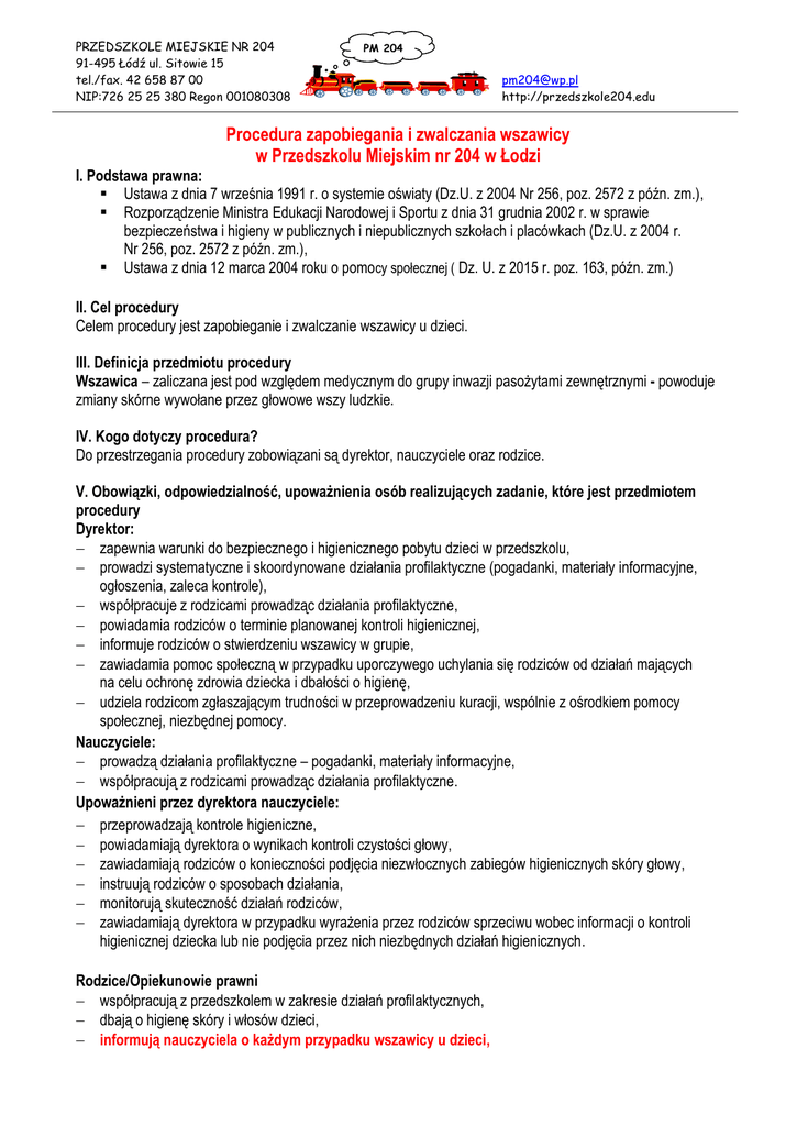 PRZEDSZKOLE MIEJSKIE NR 204 91-495 Łódź ul. Sitowie 15 tel./fax. 42 658 87 00 NIP:726 25 25 380 Regon 001080308 PM 204 [email protected] http://przedszkole204.edu Procedura zapobiegania i zwalczania wszawicy w Przedszkolu Miejskim nr 204 w Łodzi I. Podstawa prawna: Ustawa z dnia 7 września 1991 r. o systemie oświaty (Dz.U. z 2004 Nr 256, poz. 2572 z późn. zm.), Rozporządzenie Ministra Edukacji Narodowej i Sportu z dnia 31 grudnia 2002 r. w sprawie bezpieczeństwa i higieny w publicznych i niepublicznych szkołach i placówkach (Dz.U. z 2004 r. Nr 256, poz. 2572 z późn. zm.), Ustawa z dnia 12 marca 2004 roku o pomocy społecznej ( Dz. U. z 2015 r. poz. 163, późn. zm.) II. Cel procedury Celem procedury jest zapobieganie i zwalczanie wszawicy u dzieci. III. Definicja przedmiotu procedury Wszawica – zaliczana jest pod względem medycznym do grupy inwazji pasożytami zewnętrznymi - powoduje zmiany skórne wywołane przez głowowe wszy ludzkie. IV. Kogo dotyczy procedura? Do przestrzegania procedury zobowiązani są dyrektor, nauczyciele oraz rodzice. V. Obowiązki, odpowiedzialność, upoważnienia osób realizujących zadanie, które jest przedmiotem procedury Dyrektor: zapewnia warunki do bezpiecznego i higienicznego pobytu dzieci w przedszkolu, prowadzi systematyczne i skoordynowane działania profilaktyczne (pogadanki, materiały informacyjne, ogłoszenia, zaleca kontrole), współpracuje z rodzicami prowadząc działania profilaktyczne, powiadamia rodziców o terminie planowanej kontroli higienicznej, informuje rodziców o stwierdzeniu wszawicy w grupie, zawiadamia pomoc społeczną w przypadku uporczywego uchylania się rodziców od działań mających na celu ochronę zdrowia dziecka i dbałości o higienę, udziela rodzicom zgłaszającym trudności w przeprowadzeniu kuracji, wspólnie z ośrodkiem pomocy społecznej, niezbędnej pomocy. Nauczyciele: prowadzą działania profilaktyczne – pogadanki, materiały informacyjne, współpracują z rodzicami prowadząc działania profilaktyczne. Upoważnieni przez dyrektora nauczyciele: przeprowadzają kontrole higieniczne, powiadamiają dyrektora o wynikach kontroli czystości głowy, zawiadamiają rodziców o konieczności podjęcia niezwłocznych zabiegów higienicznych skóry głowy, instruują rodziców o sposobach działania, monitorują skuteczność działań rodziców, zawiadamiają dyrektora w przypadku wyrażenia przez rodziców sprzeciwu wobec informacji o kontroli higienicznej dziecka lub nie podjęcia przez nich niezbędnych działań higienicznych. Rodzice/Opiekunowie prawni współpracują z przedszkolem w zakresie działań profilaktycznych, dbają o higienę skóry i włosów dzieci, informują nauczyciela o każdym przypadku wszawicy u dzieci, wyrażając zgodę na objęcie dziecka opieką (poprzez zapisanie go do przedszkola), w tym opieką zdrowotną, wyrażają zgodę na dokonywanie przeglądu czystości skóry głowy dziecka (nie ma zatem konieczności uzyskiwania od rodziców każdorazowo pisemnej zgody na przeprowadzenie kontroli czystości głowy u dziecka), przeprowadzają niezbędne działania higieniczne w przypadku stwierdzonej w czasie kontroli wszawicy dziecka, zgłaszają nauczycielowi lub dyrektorowi trudności w przeprowadzeniu kuracji. VI. Opis działań 1. Na pierwszym zebraniu z rodzicami rozpoczynającym dany rok szkolny dyrektor zapoznaje wszystkich rodziców z procedurą zapobiegania i zwalczania wszawicy. 2. Nauczyciele na zebraniach grupowych przeprowadzają pogadanki na temat czystości i higieny skóry głowy oraz włosów. 3. We wrześniu każdego roku nauczycielki wywieszają materiały informacyjne dotyczące higieny na tablicy informacyjnej dla rodziców. 4. 2 razy w roku szkolnym dyrektor przedszkola zarządza dokonanie kontroli czystości skóry głowy wszystkich dzieci oraz wszystkich pracowników. 5. Na 7 dni przed planowanym terminem kontroli dyrektor powiadamia rodziców poprzez wywieszenie ogłoszenia w „kąciku rodziców”. W sytuacji zgłoszenia przez rodzica lub pracownika przedszkola przypadku pojawienia się wszawicy, nauczyciele upoważnieni przez dyrektora/ dyrektor, bezzwłocznie dokonują kontroli, bez zachowania 7 dniowego terminu powiadamiania rodziców. 6. W przypadku, gdy rodzice wyrażą sprzeciw wobec informacji o kontroli higienicznej dziecka nauczycielka zawiadamia dyrektora przedszkola. 7. Kontrola odbywa się z zachowaniem zasady intymności tzn. jest ona indywidualna, w wydzielonym pomieszczeniu – w pokoju zajęć indywidualnych lub w łazience. 8. Kontrolę przeprowadzają – w stosunku do dzieci – nauczycielki upoważnione przez dyrektora / dyrektor ; w stosunku do pracowników – wyznaczony przez dyrektora pracownik. 9. Osoby kontrolujące niezwłocznie przekazują dyrektorowi informacje o wynikach kontroli czystości i skali zjawiska. 10. W przypadku stwierdzenia wszawicy w grupie dyrektor przedszkola niezwłocznie informuje rodziców danej grupy o zaistniałym fakcie, z zaleceniem codziennej kontroli czystości głów dzieci oraz czystości głów domowników, a także przekazuje informacje o sposobie działań zwalczających. 11. Nauczycielka upoważniona przez dyrektora zawiadamia niezwłocznie rodziców dzieci, u których stwierdzono wszawicę o konieczności podjęcia natychmiastowych zabiegów higienicznych skóry głowy. Fakt poinformowania odnotowuje w zeszycie kontaktów, a potwierdzany jest on podpisem nauczycielki i rodzica. 12. W razie potrzeby nauczycielka upoważniona przez dyrektora instruuje rodziców o sposobie działań, informuje też o konieczności poddania się kuracji wszystkich domowników. 13. Nauczycielka upoważniona przez dyrektora monitoruje skuteczność działań poprzez przeprowadzenie ponownej kontroli stanu czystości głów dzieci po przeprowadzonych zabiegach higienicznych przez rodziców po upływie od 7 do 10 dni od stwierdzenia wszawicy w grupie. 14. W przypadku, gdy rodzice zgłoszą trudności w p