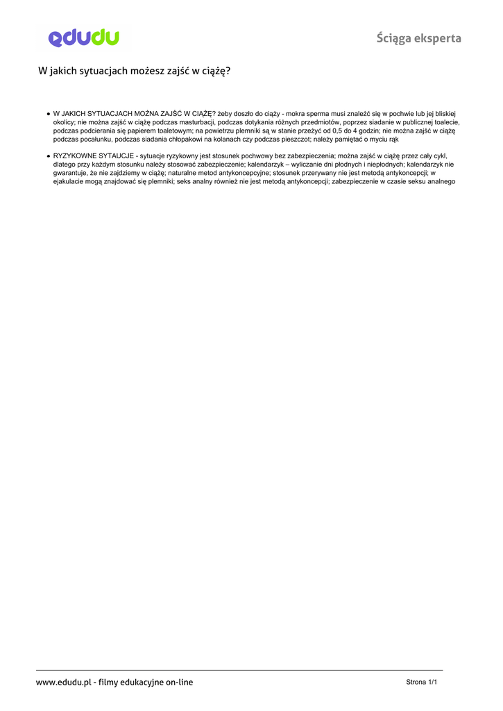 Ściąga eksperta W jakich sytuacjach możesz zajść w ciążę? W JAKICH SYTUACJACH MOŻNA ZAJŚĆ W CIĄŻĘ? żeby doszło do ciąży - mokra sperma musi znaleźć się w pochwie lub jej bliskiej okolicy; nie można zajść w ciążę podczas masturbacji, podczas dotykania różnych przedmiotów, poprzez siadanie w publicznej toalecie, podczas podcierania się papierem toaletowym; na powietrzu plemniki są w stanie przeżyć od 0,5 do 4 godzin; nie można zajść w ciążę podczas pocałunku, podczas siadania chłopakowi na kolanach czy podczas pieszczot; należy pamiętać o myciu rąk RYZYKOWNE SYTAUCJE - sytuacje ryzykowny jest stosunek pochwowy bez zabezpieczenia; można zajść w ciążę przez cały cykl, dlatego przy każdym stosunku należy stosować zabezpieczenie; kalendarzyk – wyliczanie dni płodnych i niepłodnych; kalendarzyk nie gwarantuje, że nie zajdziemy w ciążę; naturalne metod antykoncepcyjne; stosunek przerywany nie jest metodą antykoncepcji; w ejakulacie mogą znajdować się plemniki; seks analny również nie jest metodą antykoncepcji; zabezpieczenie w czasie seksu analnego www.edudu.pl - filmy edukacyjne on-line Powered by TCPDF (www.tcpdf.org) Strona 1/1