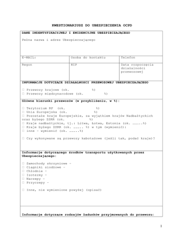 KWESTIONARIUSZ DO UBEZPIECZENIA OCPD DANE INDENTYFIKACYJNEJ I EWIDENCYJNE UBEZPIECZAJĄCEGO Pełna nazwa i adres Ubezpieczającego E-MAIL: Osoba do kontaktu Telefon Regon NIP Data rozpoczęcia działalności przewozowej INFORMACJE DOTYCZĄCE DZIAŁALNOSCI PRZEWOZOWEJ UBEZPIECZAJĄCEGO Przewozy krajowe (ok. Przewozy międzynarodowe (ok. %) %) Główne kierunki przewozów (w przybliżeniu, w %): Terytorium RP (ok. %) Unia Europejska (ok. %) Pozostałe kraje Europejskie, za wyjątkiem krajów Nadbałtyckich oraz byłego ZSRR (ok. %) Kraje nadbałtyckie, tj.: Litwa, Łotwa, Estonia (ok. ………..%) Kraje byłego ZSRR (ok. ……….. %) w tym (wymienić): inne – wymienić (ok. ………..%) Czy wykonywane są przewozy kabotażowe (jeśli tak, podać kraje)? Informacje dotyczącego środków transportu użytkowanych przez Ubezpieczającego: Samochody skrzyniowe – Ciągniki siodłowe – Chłodnie – Izotermy – Naczepy – Przyczepy – Inne, nie wymienione powyżej (opisać) Informacje dotyczące rodzajów ładunków przyjmowanych do przewozu: 1 Czy przyjmowane są do przewozu: Ładunki żywnościowe, szybko psujące się w rozumieniu Umowy o międzynarodowych przewozach szybko psujących się artykułów żywnościowych i o specjalnych środkach transportu przeznaczonych do tych przewozów ATP (ile jako % przewozów i jak często) Ładunki niebezpieczne w rozumieniu Umowy Europejskiej dotyczącej międzynarodowego przewozu drogowego towarów niebezpiecznych ADR (klasy, ile jako % przewozów i jak często) Ładunki podwyższonego ryzyka, tj. komputery, sprzęt i oprogramowanie, telefony komórkowe i akcesoria, sprzęt RTV, AGD, itp. - podkreślić właściwe (ile jako % przewozów i jak często) Spirytus, alkohol, itp. wyroby (ile jako % przewozów i jak często) Znaki akcyzy, wartości pieniężne, papiery wartościowe, itp. (ile jako % przewozów i jak często) Inne rodzaje ładunków niż w/w przyjmowane do przewozu przez Ubezpieczającego (wymienić) Czy współpraca ze zleceniodawcą Ubezpieczającego regulowana jest przez: Doraźne zlecenia Stałe umowy Czy Ubezpieczający korzysta z podwykonawców: nie tak Główni podwykonawcy Ubezpieczającego (wymienić): INFORMACJE DO UBEZPIECZENIA Okres ubezpieczenia (od do) Suma gwarancyjna (oznaczyć walutę) PLN / EUR / USD suma gwarancyjna na jedno i wszystkie zdarzenia suma gwarancyjna na każde zdarzenie Przychód Ubezpieczającego z tytułu prowadzonej działalności przewozowej (bez VAT) W poprzednim roku rozrachunkowym PLN Planowany na bieżący rok rozrachunkowy PLN 2 Oczekiwania Ubezpieczającego co do terminów płatności składki: Składka płatna jednorazowo Składka płatna w 2 równych ratach Składka płatna w 4 równych ratach Inny sposób płatności (podać) Dotychczasowy przebieg szkodowy (proszę podać wszystkie szkody, zaistniałe w ostatnich trzech lata działalności Ubezpieczającego, bez względu na to, czy Ubezpieczający korzystał z ubezpieczenia, czy też nie) Data szkody, przyczyna szkody, wysokość szkody Oświadczam, iż wszelkie informacje i oświadczenia podane w niniejszym wniosku są prawdziwe oraz, że nie ukryliśmy i nie zafałszowaliśmy żadnych faktów. Zgadzamy się, aby niniejszy wniosek wraz z innymi dokumentami dostarczonymi przez nas był podstawa zawarcia umowy ubezpieczenia. Podejmujemy się informować Ubezpieczyciela o wszelkich zmianach w powyższych informacjach, jeżeli nastąpią one przed lub po zawarciu umowy ubezpieczenia. Podpisanie niniejszego wniosku nie zobowiązuje Wnioskodawcy ani Ubezpieczyciela do zawarcia umowy ubezpieczenia. Na podstawie ustawy z dnia 29 sierpnia 1997 r. o ochronie danych osobowych (Dz. U. Nr 101 z 2002 r. poz. 926 tekst jednolity z późniejszymi zmianami), informujemy, ze Pani/Pana dane osobowe będą przetwarzane przez Generali T.U. S.A. z siedziba 02-676 Warszawa, ul. Postępu 15B w celu i zakresie realizacji umowy ubezpieczenia. Ma Pani/Pan prawo wglądu do swoich danych osobowych oraz ich poprawiania. Wyrażam/nie wyrażam*) zgodę/y na przetwarzanie moich danych osobowych w celu marketingowym odnośnie produktów oferowanych przez spółki Generali Group. Miejscowość i data Podpis KONTAKT: F.H.U. "BOS" S.C. Bożena i Maciej Soszyńscy tel. kom: 508 920 606 tel. kom: 517 104 565 e-mail: [email protected] www.licencjetransportowe.com 3