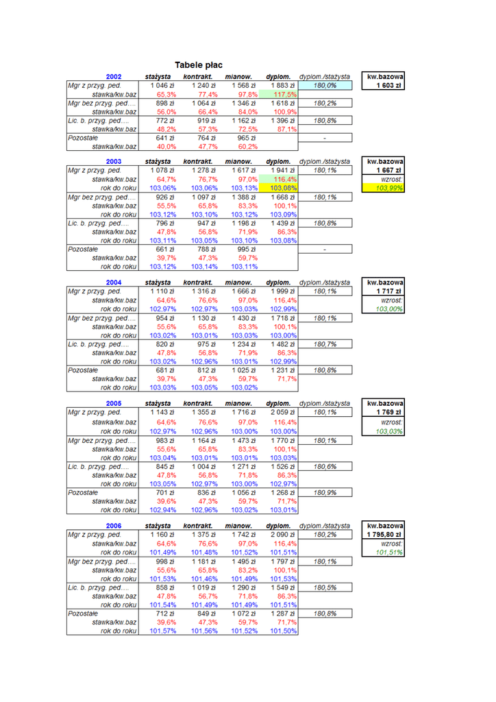 ANALIZA OPISOWA DO TABEL (dla łatwiejszej analizy kolory wyróŜnienia nawiązują do wyróŜnień w tabelach) Zwracam uwagę na zmniejszające się i katastrofalnie niskie relacje w tabeli płac między nauczycielami dyplomowanymi a staŜystami od 2007 r. W latach 2002 - 2007 relacja płacy zasadniczej nauczyciela dyplomowanego do staŜysty mieściła się między 180 a 181 %. W 2008 roku wskaźnik ten wynosił od 162 do 168 %, a w 2009 roku ma się zmniejszyć w zaleŜności od grupy do wielkości między 133 a 138 %. Nie znam drugiej takiej profesji, w której pracownik doświadczony, mistrz w zawodzie, tuŜ przed emeryturą otrzymywałby w tabeli płac tylko o jedną trzecią większą stawkę od pracownika rozpoczynającego pracę (czyli nowicjusza w zawodzie). Właśnie w ub. roku kontrowersje i wzburzenie wzbudziły wyŜsze kwotowo podwyŜki dla nauczycieli staŜystów i kontraktowych niŜ dla nauczycieli mianowanych i dyplomowanych. W obecnej propozycji kształtowania się podwyŜek wynagrodzenia zasadniczego MEN idzie jeszcze dalej. W 2009 roku proponuje się blisko 4-krotny kwotowo wzrost stawki staŜystów w stosunku do nauczycieli dyplomowanych i mianowanych, oraz ponad dwukrotny kwotowo wzrost stawki dla nauczycieli kontraktowych w stosunku do nauczycieli dyplomowanych i mianowanych. RównieŜ od 2007 roku wskaźnik porównujący relację stawki w najwyŜszej grupie (mgr z przygotowaniem pedagogicznym) do kwoty bazowej systematycznie drastycznie spada. W roku 2002 wyniósł on dla nauczycieli dyplomowanych 117,5%, w latach 2003-2007 wyniósł 116,4%, w 2008 r. zmniejszył się do 114,7%, a w styczniu 2009 roku ma spaść do niespotykanie niskiego poziomu 114,1% i pozostać na tym najniŜszym dotąd poziomie równieŜ we wrześniu 2009 r. W analizowanych latach w grupie nauczycieli mianowanych równieŜ obserwuje się spadek, choć stosunkowo niewielki, tego wskaźnika (od 97,8% do 97,1%). W obecnej sytuacji nie powinniśmy się godzić na poziom relacji stawki wynagrodzenia zasadniczego do kwoty bazowej poniŜej 115 % dla dyplomowanych. w najwyŜszej grupie wykształcenia (co daje stawkę wynagrodzenia zasadniczego w styczniu 2009 r. w wysokości 2505 zł.). Kolejna niekorzystna dla nauczycieli tendencja dotyczy relacji wielkości procentowych podwyŜek w tabeli płac do wzrostu kwoty bazowej. W latach 2004-2007 podwyŜki w tabeli płac proporcjonalnie odpowiadały podwyŜce kwoty bazowej i wzrostowi nakładów na edukację. W roku 2008 zauwaŜalne są istotne dysproporcje w podwyŜkach dla poszczególnych grup nauczycieli, gdyŜ przy wzroście kwoty bazowej o 10% proporcjonalnie najmniejsze podwyŜki otrzymali nauczyciele dyplomowani (tylko o 8,4%) Tendencja stosunkowo niŜszych podwyŜek dla nauczycieli z wyŜszymi stopniami awansu zawodowego jest wg projektu podtrzymana równieŜ w regulacji styczniowej 2009 r. Nauczyciele dyplomowani i mianowani nie osiągną poziomu wzrostu kwoty bazowej i wzrostu nakładów na edukację (w styczniu zamiast 5% podwyŜki proponuje się dla nauczycieli dyplomowanych nawet tylko 4,3%). Są to ewidentne dowody na to, Ŝe MEN kolejny raz zaplanowało podwyŜki dla nauczycieli staŜystów i kontraktowych kosztem nauczycieli dyplomowanych i mianowanych. NSZZ Solidarność nie moŜe godzić się na takie rozwiązania. J. Frąckowiak