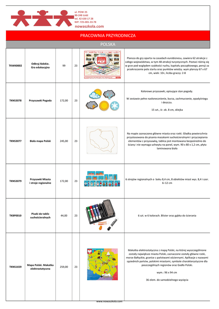 ul. POW 25 90-248 Łódź tel. 42 630 17 28 NIP: 725-001-33-78 nowaszkola.com PRACOWNIA PRZYRODNICZA POLSKA TKWK0002 Odkryj łódzkie. Gra edukacyjna 99 Plansza do gry oparta na zasadach eurobiznesu, zawiera 62 atrakcje z całego województwa, w tym 48 atrakcji turystycznych. Postaci różnią się w grze pod względem szybkości ruchu, kapitału początkowego, pensji za przekroczenie pola startu oraz punktów wiedzy. wym planszy 67 x 67 cm, wiek: 10+, liczba graczy: 2-8 23 Kolorowe przyssawki, opisujące stan pogody. TKNS3078 Przyssawki Pogoda 172,00 W zestawie pełne nasłonecznienie, burza, zachmurzenie, opadyśniegu i deszczu. 23 15 szt., śr. ok. 8 cm, sklejka TKNS3077 Biała mapa Polski 245,00 23 Na mapie zaznaczono główne miasta oraz rzeki. Gładka powierzchnia przystosowana do pisania mazakami suchościeralnymi i przyczepiania elementów z przyssawką, tablica jest montowana bezpośrednio do ściany i nie wymaga uchwytu na panel, wym. 90 x 80 x 1,2 cm, płyta laminowana biała TKNS3079 Przysawki Miasta i stroje regionalne 172,00 23 6 strojów regionalnych o boku 8,4 cm, 8 obiektów miast wys. 8,4 i szer. 6–12 cm TKBP0010 Pisaki do tablic suchościeralnych 44,00 23 6 szt. w 6 kolorach. Blister oraz gąbka do ścierania TKNS1659 Mapa Polski. Makatka elektrostatyczna 259,00 Makatka elektrostatyczna z mapą Polski, na której wyszczególnione zostały największe miasta Polski, zaznaczone zostały główne rzeki, morze Bałtyckie, granice z państwami ościennymi. Aplikacje z nazwami sąsiednich państw, polskimi miastami, symbole charakterystyczne dla poszczególnych regionów oraz Godło Polski. 23 wym.: 96 x 94 cm 36 elem. do samodzielnego wycięcia www.nowaszkola.com TTMP3605 Mapa Polski klocki. Zestaw 5 szt 142,00 23 Mapa-puzzle z klocków Morphun z podziałem na województwa, z najważniejszymi miastami i rzekami. wym. po złożeniu 25,5 x 25,5 cm; 5 szt. TKLN1978 Puzzle. Polska mapa polityczna 48,00 23 70 elem., wym. 36.5 x 28.5 cm TKLN1985 Puzzle Polska 48,00 23 61 elem., wym. 36.5 x 28.5 cm TKMC0190 Puzzle piankowe. Europa 23 Duże elementy puzzli z miękkiego tworzywa sztucznego, które w formie zabawy pozwalają na odkrywanie poszczególnych państw i mieszkających tam ludzi. 54 elem.; wym. po złożeniu 60 x 90 x 1,5 cm TKMO0048 TKNS0371 Województwa Polski. Książka Puzzlowa Mapa Polski. Województwa 67,00 19,00 36,00 Małgorzata Mroczkowska. Bogato ilustrowany, interesujący przewodnik po województwach Polski. Terytorium Polski podzielone jest na mniejsze obszary – województwa. W wyniku reformy administracyjnej z 1 stycznia 1999 roku utworzono ich w naszym kraju 16. Warto wiedzieć, jak się nazywają, gdzie leżą i czym się charakteryzują. Format: 21 x 29,5 cm Liczba stron: 48 stron Oprawa: twarda 5 Układanka drewniana Mapa Polski, powycinana zgodnie z granicami województw dzisiejszej Polski, z naniesionymi ilustracjami i zaznaczonymi ciekawymi miejscami danego regionu. Składa się z 16 elementów z wygodnymi uchwytami, kształtem odpowiadającym poszczególnym województwom Polski, które należy dopasować do odpowiednich miejsc na planszy. Osoba układająca poznaje kształty granic województw i umiejscowienie ich na mapie Polski, to ciekawa i jednocześnie pouczająca zabawa. Układanie poszczególnych elementów to świetna gimnastyka dla mózgu, dziecko uczy się spostrzegawczości, bystrości, kreatywności, a także cierpliwości. wym. planszy: 40 x 40 x 0,8 cm 23 www.nowaszkola.com