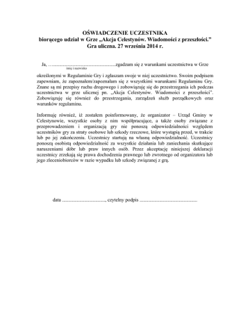 OŚWIADCZENIE UCZESTNIKA biorącego udział w Grze „Akcja Celestynów. Wiadomości z przeszłości.” Gra uliczna. 27 września 2014 r. Ja, …...................................................zgadzam się z warunkami uczestnictwa w Grze imię i nazwisko określonymi w Regulaminie Gry i zgłaszam swoje w niej uczestnictwo. Swoim podpisem zapewniam, że zapoznałem/zapoznałam się z wszystkimi warunkami Regulaminu Gry. Znane są mi przepisy ruchu drogowego i zobowiązuję się do przestrzegania ich podczas uczestnictwa w grze ulicznej pn. „Akcja Celestynów. Wiadomości z przeszłości”. Zobowiązuję się również do przestrzegania, zarządzeń służb porządkowych oraz warunków regulaminu. Informuję również, iż zostałem poinformowany, że organizator – Urząd Gminy w Celestynowie, wszystkie osoby z nim współpracujące, a także osoby związane z przeprowadzeniem i organizacją gry nie ponoszą odpowiedzialności względem uczestników gry za straty osobowe lub szkody rzeczowe, które wystąpią przed, w trakcie lub po jej zakończeniu. Uczestnicy startują na własną odpowiedzialność. Uczestnicy ponoszą osobistą odpowiedzialność za wszystkie działania lub zaniechania skutkujące naruszeniami dóbr lub praw innych osób. Przez akceptację niniejszej deklaracji uczestnicy zrzekają się prawa dochodzenia prawnego lub zwrotnego od organizatora lub jego zleceniobiorców w razie wypadku lub szkody związanej z grą. data ..................................., czytelny podpis ...............................................