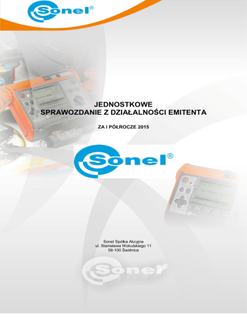 JEDNOSTKOWE SPRAWOZDANIE Z DZIAŁALNOŚCI EMITENTA ZA I PÓŁROCZE 2015 Sonel Spółka Akcyjna ul. Stanisława Wokulskiego 11 58-100 Świdnica SPRAWOZDANIE Z DZIAŁALNOŚCI SONEL S.A. ZA I PÓŁROCZE 2015 I. WSTĘP Sonel S.A. jest firmą produkcyjną, specjalizującą się w produkcji elektronicznych przyrządów pomiarowych. Ponadto przedsiębiorstwo świadczy usługi w zakresie montażu powierzchniowego elementów elektronicznych SMT oraz w zakresie sprawdzania metrologicznego przyrządów pomiarowych. Firma prowadzi działalność od 21-02-1994 roku, najpierw pod firmą TIM Spółka z o.o., później, jako Sonel Spółka z o.o. Od 01-07-1998 roku jest spółką akcyjną. W 2008 roku Spółka została wprowadzona na Giełdę Papierów Wartościowych w Warszawie. Podstawowe dane o Spółce przedstawiają się następująco: Pełna nazwa Firmy: Siedziba: Organ Rejestrowy: Numer wpisu do KRS: Podstawowy przedmiot działalności to: Numer PKD: Numer EKD: Branża: Spółka występuje na rynku regulowanym: Segment: Indeksy: Numer identyfikacji podatkowej: Numer Regon: Sonel Spółka Akcyjna 58-100 Świdnica, ul. Wokulskiego 11 Krajowy Rejestr Sądowy 0000090121 z dnia 14-02-2002 działalność produkcyjna w branży elektronicznej i elektrotechnicznej. W szczególności w Spółce odbywa się produkcja przyrządów pomiarowych oraz usługowy montaż elementów elektronicznych. 26.51Z Produkcja instrumentów i przyrządów pomiarowych, kontrolnych i nawigacyjnych 3320A Przemysł elektromaszynowy Rynek Podstawowy Giełda Papierów Wartościowych w Warszawie 5 PLUS WIG 884-00-33-448 890236667 Czas trwania Spółki jest nieoznaczony. Okresy, za które prezentowane jest sprawozdanie finansowe i porównywalne dane finansowe. Sprawozdanie finansowe sporządzono za okres: od 01-01-2015 do 30-06-2015 Dane porównywalne prezentowane są: za okres od 01-01-2014 do 30-06-2014 w zakresie rachunku zysków i strat oraz wg stanu na dzień 30-06-2014 i 31-12-2014 w zakresie sytuacji bilansowej przedsiębiorstwa. Przedmiotem działalności Spółki jest prowadzenie wszelkiej działalności handlowej, usługowej, produkcyjnej, a w szczególności: 1) 2) 3) 4) 5) 6) 7) 8) 9) 10) 11) 12) 13) 14) 15) 16) 17) 18) 19) 20) 21) 22) 23) 24) 25) 26) 27) 28) 29) 30) 31) 32) 33) 34) 35) Produkcja instrumentów i przyrządów pomiarowych , kontrolnych i nawigacyjnych ( PKD 26.51.Z) Produkcja wyrobów z gumy i tworzyw sztucznych ( PKD 22 ) Produkcja elementów elektronicznych ( PKD 26.11.Z ) Produkcja elektronicznych obwodów drukowanych ( PKD 26.12.Z ) Produkcja komputerów i urządzeń peryferyjnych ( PKD 26.20.Z ) Produkcja sprzętu (tele)komunikacyjnego ( PKD 26.30.Z ) Produkcja elektronicznego sprzętu powszechnego użytku ( PKD 26.40.Z ) Produkcja instrumentów optycznych i sprzętu fotograficznego ( PKD 26.70.Z ) Produkcja urządzeń elektrycznych ( PKD 27 ) Pozostała produkcja wyrobów ( PKD 32 ) Produkcja pozostałych maszyn specjalnego przeznaczenia, gdzie indziej niesklasyfikowana (PKD 28.99.Z ) Naprawa, konserwacja i instalowanie maszyn i urządzeń ( PKD 33 ) Zbieranie odpadów innych niż niebezpieczne ( PKD 38.11.Z ) Zbieranie odpadów niebezpiecznych (PKD 38.12. Z) Sprzedaż hurtowa i detaliczna samochodów osobowych i furgonetek (PKD 45.11 .Z) Sprzedaż hurtowa pozostałych maszyn i urządzeń (46.69.Z ) Sprzedaż detaliczna nowych wyrobów prowadzona w wyspecjalizowanych sklepach ( PKD 47.78.Z ) Transport drogowy towarów ( PKD 49.41.Z ) Sprzedaż hurtowa niewyspecjalizowana ( PKD 46.90.Z ) Magazynowanie i przechowywanie pozostałych towarów ( PKD 52.10.B ) Telekomunikacja (PKD 61 ) Działalność związana z oprogramowaniem ( PKD 62.01.Z ) Przetwarzanie danych; zarządzanie stronami internetowymi (hosting) i podobna działalność ( PKD 63.11.Z ) Pozostała finansowa działalność usługowa, gdzie indziej niesklasyfikowana, z wyłączeniem ubezpieczeń i funduszy emerytalnych ( PKD 64.99.Z ) Działalność wspomagająca usługi finansowe oraz ubezpieczenia i fundusze emerytalne (PKD 66 ) Kupno i sprzedaż nieruchomości na własny rachunek ( PKD 68.10.Z ) Wynajem i zarządzanie nieruchomościami własnymi i dzierżawionymi ( PKD68.20.Z) Działalność prawnicza , rachunkowo-księgowa i doradztwo podatkowe ( PKD 69 ) Działalność firm centralnych (head office): doradztwo związane z zarządzaniem (PKD 70 ) Badania naukowe i prace rozwojowe ( PKD 72 ) Reklama, badanie rynku i opinii publicznej ( PKD 73 ) Pozostała działalność profesjonalna, naukowa i techniczna ( PKD 74 ) Wynajem samochodów i furgonetek (PKD 77.11.Z) Wynajem i dzierżawa pozostałych maszyn, urządzeń oraz dóbr materialnych, gdzie indziej niesklasyfikowane (PKD 77.39.Z ) Działalność związana z administracyjną obsługą biura i pozostała działalność wspomagająca prowadzenie działalności gospodarczej ( PKD 82 ) str. 2 SPRAWOZDANIE Z DZIAŁALNOŚCI SONEL S.A. ZA I PÓŁROCZE 2015 36) 37) 38) 39) Pozostałe pozaszkolne formy edukacji , gdzie indziej niesklasyfikowane (PKD 85.59.B ) Działalność wspomagająca edukację ( PKD 85.60.Z ) Naprawa i konserwacja komputerów i artykułów użytku osobistego i domowego ( PKD 95) Pozostała indywidualna działalność usługowa (PKD 96 ) Władze Spółki to: Walne Zgromadzenie, Rada Nadzorcza i Zarząd Spółki. Skład Zarządu Sonel S.A. jest następujący: Krzysztof Wieczorkowski Prezes Zarządu, Jan Walulik Wiceprezes Zarządu, Wojciech Kwiatkowski Członek Zarządu W firmie jest ustanowiony prokurent w osobie Jolanty Drozdowskiej. Organem nadzorującym prace Zarządu Spółki jest Rada Nadzorcza. Rada Nadzorcza w 2015 roku składała się z następujących osób: • Andrzej Diakun Przewodniczący Rady Nadzorczej, • Mirosław Nowakowski Członek Rady Nadzorczej, • Maciej Posadzy Członek Rady Nadzorczej. • Andrzej Kasperek Członek Rady Nadzorczej, • Stanisław Zając Członek Rady Nadzorczej, W 2015 roku dokonano zmiany w składzie Rady Nadzorczej. Wobec wygaśnięc