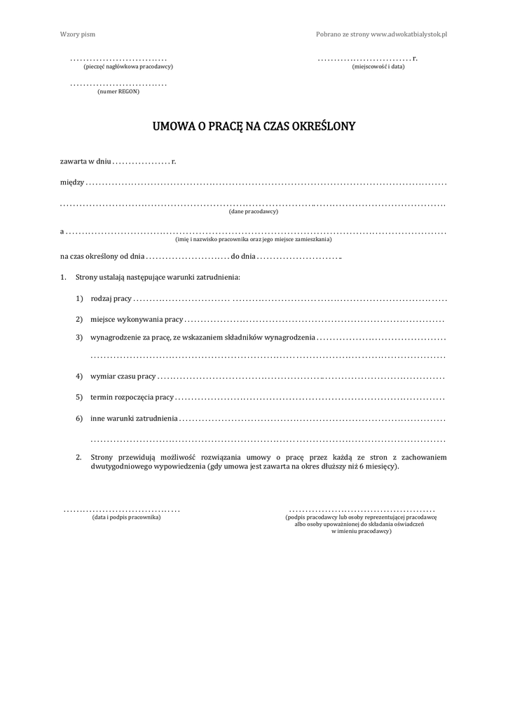 Wzory pism Pobrano ze strony www.adwokatbialystok.pl .............................. . . . . . . . . . . . . . . . . . . . . . . . . . . . . . r. (pieczęć nagłówkowa pracodawcy) (miejscowość i data) .............................. (numer REGON) UMOWA O PRACĘ NA CZAS OKREŚLONY zawarta w dniu . . . . . . . . . . . . . . . . . . r. między . . . . . . . . . . . . . . . . . . . . . . . . . . . . . . . . . . . . . . . . . . . . . . . . . . . . . . . . . . . . . . . . . . . . . . . . . . . . . . . . . . . . . . . . . . . . . . . . . . . . . . . . . . . . . . . . . . . . . . . . . . . . . . . . . . . . . . . . . . . . . . . . . . . . . . . . . . . . . . . . . . . . . . . . . . . . . . . . . . . . . . . . . . . . .. . . . . . . . . . . . . . . . . . . . . . . . . . . . . . . . . . . . . . . . . (dane pracodawcy) a..................................................................................................................... (imię i nazwisko pracownika oraz jego miejsce zamieszkania) na czas określony od dnia . . . . . . . . . . . . . . . . . . . . . . . . . . do dnia . . . . . . . . . . . . . . . . . . . . . . . . . .. 1. Strony ustalają następujące warunki zatrudnienia: 1) rodzaj pracy . . . . . . . . . . . . . . . . . . . . . . . . . . . . . . . . . . . . . . . . . . . . . . . . . . . . . . . . . . . . . . . . . . . . . . . . . . . . . . . . . . . . . . . . . . . . . . . . 2) miejsce wykonywania pracy . . . . . . . . . . . . . . . . . . . . . . . . . . . . . . . . . . . . . . . . . . . . . . . . . . . . . . . . . . . . . . . . . . . . . . . . . . . . . . . . 3) wynagrodzenie za pracę, ze wskazaniem składników wynagrodzenia . . . . . . . . . . . . . . . . . . . . . . . . . . . . . . . . . . . . . . . . ............................................................................................................. 4) wymiar czasu pracy . . . . . . . . . . . . . . . . . . . . . . . . . . . . . . . . . . . . . . . . . . . . . . . . . . .. . . . . . . . . . . . . . . . . . . . . . . . . . . . . . . . . . . . . . 5) termin rozpoczęcia pracy . . . . . . . . . . . . . . . . . . . . . . . . . . . . . . . . . . . . . . . . . . . . . . . . . . . . . . . . . . . . . . . . . . . . . . . . . . . . . . . . . . . 6) inne warunki zatrudnienia . . . . . . . . . . . . . . . . . . . . . . . . . . . . . . . . . . . . . . . . . . . . . . . . . . . . . . . . . . . . . . . . . . . . . . . . . . . . . . . . . . ............................................................................................................. 2. Strony przewidują możliwość rozwiązania umowy o pracę przez każdą ze stron z zachowaniem dwutygodniowego wypowiedzenia (gdy umowa jest zawarta na okres dłuższy niż 6 miesięcy). .................................... (data i podpis pracownika) ............................................. (podpis pracodawcy lub osoby reprezentującej pracodawcę albo osoby upoważnionej do składania oświadczeń w imieniu pracodawcy)