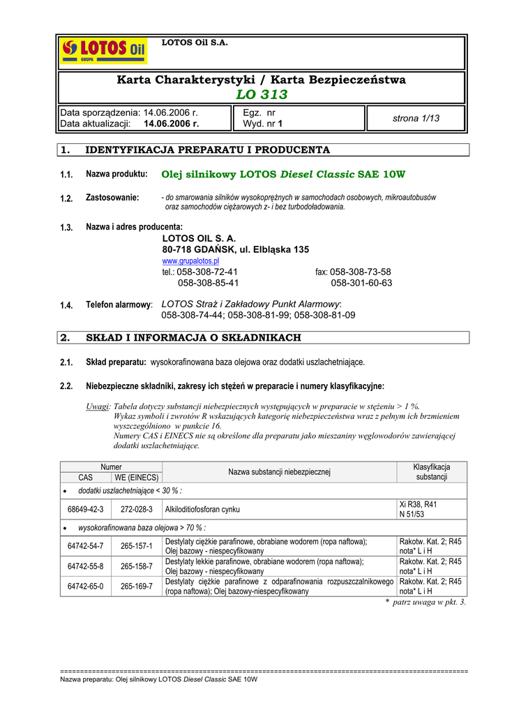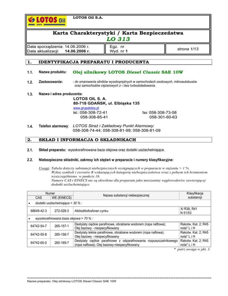 LOTOS Oil S.A. Karta Charakterystyki / Karta Bezpieczeństwa LO 313 Data sporządzenia: 14.06.2006 r. Data aktualizacji: 14.06.2006 r. Egz. nr Wyd. nr 1 strona 1/13 1. IDENTYFIKACJA PREPARATU I PRODUCENTA 1.1. Nazwa produktu: Olej silnikowy LOTOS Diesel Classic SAE 10W 1.2. Zastosowanie: - do smarowania silników wysokoprężnych w samochodach osobowych, mikroautobusów oraz samochodów ciężarowych z- i bez turbodoładowania. 1.3. Nazwa i adres producenta: LOTOS OIL S. A. 80-718 GDAŃSK, ul. Elbląska 135 www.grupalotos.pl tel.: 058-308-72-41 058-308-85-41 fax: 058-308-73-58 058-301-60-63 1.4. Telefon alarmowy: LOTOS Straż i Zakładowy Punkt Alarmowy: 058-308-74-44; 058-308-81-99; 058-308-81-09 2. SKŁAD I INFORMACJA O SKŁADNIKACH 2.1. Skład preparatu: wysokorafinowana baza olejowa oraz dodatki uszlachetniające. 2.2. Niebezpieczne składniki, zakresy ich stężeń w preparacie i numery klasyfikacyjne: Uwagi: Tabela dotyczy substancji niebezpiecznych występujących w preparacie w stężeniu > 1 %. Wykaz symboli i zwrotów R wskazujących kategorię niebezpieczeństwa wraz z pełnym ich brzmieniem wyszczególniono w punkcie 16. Numery CAS i EINECS nie są określone dla preparatu jako mieszaniny węglowodorów zawierającej dodatki uszlachetniające. CAS • Numer WE (EINECS) Klasyfikacja substancji dodatki uszlachetniające < 30 % : 68649-42-3 • Nazwa substancji niebezpiecznej 272-028-3 Alkiloditiofosforan cynku Xi R38, R41 N 51/53 wysokorafinowana baza olejowa > 70 % : 64742-54-7 265-157-1 64742-55-8 265-158-7 64742-65-0 265-169-7 Destylaty ciężkie parafinowe, obrabiane wodorem (ropa naftowa); Rakotw. Kat. 2; R45 Olej bazowy - niespecyfikowany nota* L i H Destylaty lekkie parafinowe, obrabiane wodorem (ropa naftowa); Rakotw. Kat. 2; R45 Olej bazowy - niespecyfikowany nota* L i H Destylaty ciężkie parafinowe z odparafinowania rozpuszczalnikowego Rakotw. Kat. 2; R45 (ropa naftowa); Olej bazowy-niespecyfikowany nota* L i H * patrz uwaga w pkt. 3. ======================================================================================================= Nazwa preparatu: Olej silnikowy LOTOS Diesel Classic SAE 10W LOTOS Oil S.A. Karta Charakterystyki / Karta Bezpieczeństwa LO 313 Data sporządzenia: 14.06.2006 r. Data aktualizacji: 14.06.2006 r. Egz. nr Wyd. nr 1 strona 2/13 3. IDENTYFIKACJA ZAGROŻEŃ 3.1. Klasyfikacja preparatu: Zgodnie z kryteriami klasyfikacji określonymi w Rozporządzeniu Ministra Zdrowia z dnia 2 września 2003 r. w sprawie kryteriów i sposobu klasyfikacji substancji i preparatów chemicznych (Dz. U. 03. 171. 1666 z późniejszymi zmianami) preparat nie jest zaklasyfikowany jako niebezpieczny. Identyfikacji zagrożeń dokonano na podstawie analizy wyników badań oraz metodą obliczeniową na podstawie składu preparatu: • ze względu na przyporządkowanie not L i H bazom olejowym (Rozporządzenie Ministra Zdrowia z dnia 28 września 2005 r. w sprawie wykazu substancji niebezpiecznych wraz z ich klasyfikacją i oznakowaniem - Dz. U. 05. 201. 1674 z późniejszymi zmianami), zbadano je wg IP 346 (metoda • 3.2. z ekstraktem DMSO) pod kątem zawartości policyklicznych węglowodorów aromatycznych (PCA). Wyniki badań oraz dane literaturowe (dane opracowane przez międzynarodowe organizacje) dowodzą, że baza olejowa zawiera mniej niż 3% PCA, zatem produktu nie klasyfikuje się jako niebezpieczny; preparat zawiera składniki niebezpieczne, ale ze względu na bardzo niskie ich stężenia nie klasyfikuje się go jako niebezpieczny. Ewentualne objawy i skutki narażenia: W temperaturach otoczenia olej nie wykazuje działania szkodliwego na drogi oddechowe ze względu na niską zawartość składników niskolotnych. Może on powodować zagrożenie dla układu oddechowego w przypadku, gdy występuje w postaci mgły olejowej lub w postaci gorących oparów. Badania przeprowadzone dla podobnych produktów nie wykazały działań szkodliwych dla oczu lub wykazały występowanie lekkich podrażnień. Ze względu na właściwości organoleptyczne oleju istnieje pewne choć małe prawdopodobieństwo dostania się go drogą pokarmową. Inne objawy i skutki narażenia nie są znane. Uwaga: Uzupełniające informacje o przewidywanych zagrożeniach dla zdrowia człowieka i środowiska przedstawiono w punktach 4- 8 i 10-13. 4. PIERWSZA POMOC 4.1. Postępowanie w przypadku narażenia: 4.1.1. Po wdychaniu: Jeśli obserwuje się szkodliwy wpływ oparów na poszkodowanego należy wyprowadzić go z zagrożonego miejsca na świeże powietrze. Zdjąć zanieczyszczoną odzież. Zapewnić mu spokój i ciepło (okryć kocami). Kontrolować jego oddech i tętno. Przy występowaniu zaburzeń w oddychaniu podawać tlen. W przypadku jego zatrzymania stosować sztuczne oddychanie za pomocą aparatu AMBU, po uprzednim oczyszczeniu jamy ustnej z ciał obcych i śluzu. Jeżeli stanie się to konieczne, wykonać (wyłącznie przez osoby przeszkolone) masaż serca. W przypadku, gdy zaburzenia nie ustępują, natychmiast wezwać lekarza lub odwieźć poszkodowanego do szpitala, pokazać opakowanie preparatu lub etykietę. Jeżeli poszkodowany jest nieprzytomny, również należy wynieść go z atmosfery skażonej na świeże powietrze, ułożyć w pozycji bocznej ustalonej, zdjąć zanieczyszczoną odzież, zapewnić mu spokój i ciepło (okryć kocami), kontrolować jego oddech i tętno. Nie podawać niczego doustnie. Przy występowaniu zaburzeń w oddychaniu postępować jak opisano powyżej. Wezwać lekarza lub odwieźć poszkodowanego do szpitala, pokazać opakowanie preparatu lub etykietę. ======================================================================================================= Nazwa preparatu: Olej silnikowy LOTOS Diesel Classic SAE 10W LOTOS Oil S.A. Karta Charakterystyki / Karta Bezpieczeństwa LO 313 Data sporządzenia: 14.06.2006 r. Data aktualizacji: 14.06.2006 r. Egz. nr Wyd. nr 1 strona 3/13 4.1.2. W przypadku kontaktu ze skórą: Zdjąć zanieczyszczoną odzież.