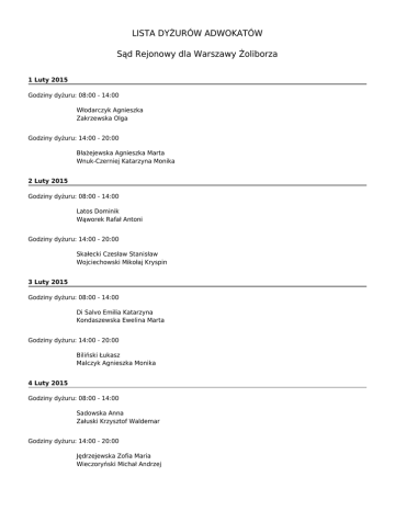 LISTA DYŻURÓW ADWOKATÓW Sąd Rejonowy dla Warszawy Żoliborza 1 Luty 2015 Godziny dyżuru: 08:00 - 14:00 Włodarczyk Agnieszka Zakrzewska Olga Godziny dyżuru: 14:00 - 20:00 Błażejewska Agnieszka Marta Wnuk-Czerniej Katarzyna Monika 2 Luty 2015 Godziny dyżuru: 08:00 - 14:00 Latos Dominik Wąworek Rafał Antoni Godziny dyżuru: 14:00 - 20:00 Skałecki Czesław Stanisław Wojciechowski Mikołaj Kryspin 3 Luty 2015 Godziny dyżuru: 08:00 - 14:00 Di Salvo Emilia Katarzyna Kondaszewska Ewelina Marta Godziny dyżuru: 14:00 - 20:00 Biliński Łukasz Malczyk Agnieszka Monika 4 Luty 2015 Godziny dyżuru: 08:00 - 14:00 Sadowska Anna Załuski Krzysztof Waldemar Godziny dyżuru: 14:00 - 20:00 Jędrzejewska Zofia Maria Wieczoryński Michał Andrzej 5 Luty 2015 Godziny dyżuru: 08:00 - 14:00 Imiełowski Adam Krzysztof Zbiegień-Włodarska Katarzyna Anna Godziny dyżuru: 14:00 - 20:00 Turkowski Michał Żakiewicz Maciej Jan 6 Luty 2015 Godziny dyżuru: 08:00 - 14:00 Biernacki Rafał Karol Kulig Tomasz Wiesław Godziny dyżuru: 14:00 - 20:00 Samson Ewa Hanna Woźniak Jan 7 Luty 2015 Godziny dyżuru: 08:00 - 14:00 Barcz-Pachnik Katarzyna Monika Bogusiewicz-Granecka Daniela Katarzyna Godziny dyżuru: 14:00 - 20:00 Brogowski Marek Kornak Iwona Magdalena 8 Luty 2015 Godziny dyżuru: 08:00 - 14:00 Caspaeri-Dąbska Maria Anna Wach Bartosz Henryk Godziny dyżuru: 14:00 - 20:00 Koniecki Andrzej Stefan Nakonieczna-Wójcicka Dagmara 9 Luty 2015 Godziny dyżuru: 08:00 - 14:00 Skiba Radosław Andrzej Szczygielska Maria Godziny dyżuru: 14:00 - 20:00 Florysiak Kacper Mateusz Ociepa Piotr Antoni 10 Luty 2015 Godziny dyżuru: 08:00 - 14:00 Grotkowska Paulina Anna Piechocki Marcin Karol Godziny dyżuru: 14:00 - 20:00 Gryz-Kacprowicz Dominika Knapik Michał 11 Luty 2015 Godziny dyżuru: 08:00 - 14:00 Gaj Jacek Andrzej Siciarek Michał Tadeusz Godziny dyżuru: 14:00 - 20:00 Pyzik Magdalena Wierzchowski Wojciech 12 Luty 2015 Godziny dyżuru: 08:00 - 14:00 Boćkowski Radosław Eysymontt Małgorzata Anna Godziny dyżuru: 14:00 - 20:00 Jednorałek Anna Szymanek Paweł Artur 13 Luty 2015 Godziny dyżuru: 08:00 - 14:00 Kulisiewicz Stanisław Szczepan Ostrowska Agnieszka Godziny dyżuru: 14:00 - 20:00 Chylak Robert Andrzej Leżański Tomasz Adam 14 Luty 2015 Godziny dyżuru: 08:00 - 14:00 Gałecki Maciej Hubert Melocha Magdalena Godziny dyżuru: 14:00 - 20:00 Dudek Piotr Jan Herman Andrzej Maria 15 Luty 2015 Godziny dyżuru: 08:00 - 14:00 Bednarek Piotr Mieczysław Cichoń Leszek Jan Godziny dyżuru: 14:00 - 20:00 Majewski Aleksander Zdzisław Zawadzki Konrad Mieczysław 16 Luty 2015 Godziny dyżuru: 08:00 - 14:00 Kordiał Grzegorz Kazimierz Morawska-Jankowska Barbara Ewa Godziny dyżuru: 14:00 - 20:00 Chełchowska Jolanta Komorek Krzysztof 17 Luty 2015 Godziny dyżuru: 08:00 - 14:00 Gutkowski Jacek Grzegorz Pawłowski Piotr Godziny dyżuru: 14:00 - 20:00 Dittmajer-Sklepowicz Izabela Magdalena Rodowicz Maciej Kazimierz 18 Luty 2015 Godziny dyżuru: 08:00 - 14:00 Groele Paweł Krzysztof Suszyński Michał Olgierd Godziny dyżuru: 14:00 - 20:00 Berger Leszek Stefan Cerkiewnik Jacek 19 Luty 2015 Godziny dyżuru: 08:00 - 14:00 Rosiak Anna Sadoch Aneta Maria Godziny dyżuru: 14:00 - 20:00 Brudnicka Katarzyna Więckowska Katarzyna 20 Luty 2015 Godziny dyżuru: 08:00 - 14:00 Surowiec Ewa Wilczewski Andrzej Godziny dyżuru: 14:00 - 20:00 Karaś Krzysztof Stanisław Wachowski Marcin Jan 21 Luty 2015 Godziny dyżuru: 08:00 - 14:00 Migas-Lewandowska Zofia Polesak-Polańska Ewelina Małgorzata Godziny dyżuru: 14:00 - 20:00 Francuz Michał Górniak Łukasz 22 Luty 2015 Godziny dyżuru: 08:00 - 14:00 Lipka Wojciech Bogdan Mielke Tomasz Lech Godziny dyżuru: 14:00 - 20:00 Michalski Mariusz Michał Naumann Jerzy 23 Luty 2015 Godziny dyżuru: 08:00 - 14:00 Dąbrowska-Ziemka Edyta Songin Michał Piotr Godziny dyżuru: 14:00 - 20:00 Szelchauz Ewa Maria Zawadzki Marek 24 Luty 2015 Godziny dyżuru: 08:00 - 14:00 Ligner-Żeromska Janina Maria Magdziarz Grzegorz Stanisław Godziny dyżuru: 14:00 - 20:00 Kaczmarska-Janeczko Sylwia Anna Puławska Konstancja Maria 25 Luty 2015 Godziny dyżuru: 08:00 - 14:00 Modzelewska Luiza Halina Wilga Grzegorz Krzysztof Godziny dyżuru: 14:00 - 20:00 Lasocka Dagmara Leśniewski Witold 26 Luty 2015 Godziny dyżuru: 08:00 - 14:00 Deptuła Krzysztof Adam Radwański Grzegorz Sławomir Godziny dyżuru: 14:00 - 20:00 Przybora Artur Śnieżko-Matejek Dominika 27 Luty 2015 Godziny dyżuru: 08:00 - 14:00 Kropidłowski Krzysztof Matyjasik Monika Godziny dyżuru: 14:00 - 20:00 Kot Leszek Witold Poniatowski Michał Paweł 28 Luty 2015 Godziny dyżuru: 08:00 - 14:00 Sokołowska Katarzyna Helena Szela-Flisak Anna Katarzyna Godziny dyżuru: 14:00 - 20:00 Gałecka-Caban Małgorzata Alicja Kloc Artur Krzysztof 1 Marzec 2015 Godziny dyżuru: 08:00 - 14:00 Smolarek Marcin Dariusz Zyguła Karolina Aleksandra Godziny dyżuru: 14:00 - 20:00 Antos Magdalena Barbara Goreń Janusz Tomasz 2 Marzec 2015 Godziny dyżuru: 08:00 - 14:00 Chojnowski Marek Zawadzki Mirosław Lech Godziny dyżuru: 14:00 - 20:00 Czyżyk-Przygoda Izabela Uljasz Tomasz 3 Marzec 2015 Godziny dyżuru: 08:00 - 14:00 Kliś Iwona Marta Lewandowska Katarzyna Anna Godziny dyżuru: 14:00 - 20:00 Margulewicz-Fortuna Karolina Smardzewska Anna Maria 4 Marzec 2015 Godziny dyżuru: 08:00 - 14:00 Stykowska-Sikora Anna Maria Szaranowicz Luka Aleksander Godziny dyżuru: 14:00 - 20:00 Staniszewska Izabela Iwona Zygmunt-Kamińska Iwona 5 Marzec 2015 Godziny dyżuru: 08:00 - 14:00 Jończyk Łukasz Ochotnicki Dominik Godziny dyżuru: 14:00 - 20:00 Jezierski Stanisław Marian Szcząska-Wójcik Maciej 6 Marzec 2015 Godziny dyżuru: 08:00 - 14:00 Barnat Krzysztof Grzegorz Łazarska-Wierzchowska Alicja Godziny dyżuru: 14:00 - 20:00 Ciepliński Krzysztof Piotr Jachowicz Adam 7 Marzec 2015 Godziny dyżuru: 08:00 - 14:00 Krasiński Maciej Andrzej Kurkiewicz-Samuła Magdalena Godziny dyżuru: 14:00 - 20:00 Gajda Jarosław Kazimierz Piechuta Marcin 8 Marzec 2015 Godziny dyżuru: 08:00 - 14: