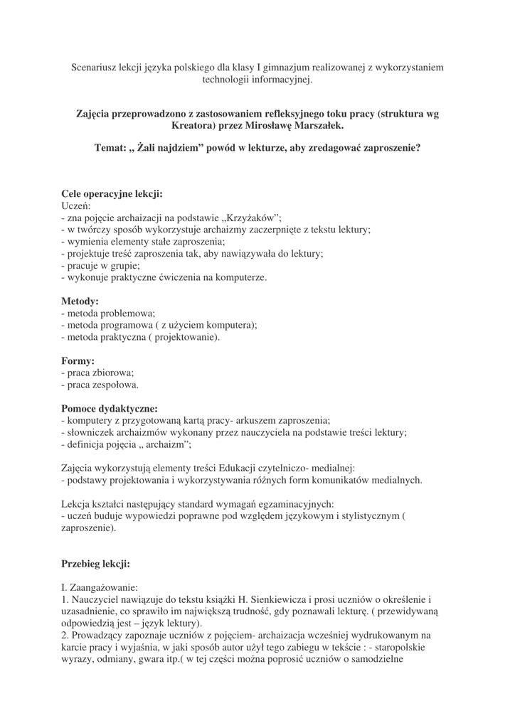 Scenariusz lekcji j zyka polskiego dla klasy I gimnazjum realizowanej z wykorzystaniem technologii informacyjnej. Zaj cia przeprowadzono z zastosowaniem refleksyjnego toku pracy (struktura wg Kreatora) przez Mirosław Marszałek. Temat: „ ali najdziem” powód w lekturze, aby zredagowa zaproszenie? Cele operacyjne lekcji: Ucze : - zna poj cie archaizacji na podstawie „Krzy aków”; - w twórczy sposób wykorzystuje archaizmy zaczerpni te z tekstu lektury; - wymienia elementy stałe zaproszenia; - projektuje tre zaproszenia tak, aby nawi zywała do lektury; - pracuje w grupie; - wykonuje praktyczne wiczenia na komputerze. Metody: - metoda problemowa; - metoda programowa ( z u yciem komputera); - metoda praktyczna ( projektowanie). Formy: - praca zbiorowa; - praca zespołowa. Pomoce dydaktyczne: - komputery z przygotowan kart pracy- arkuszem zaproszenia; - słowniczek archaizmów wykonany przez nauczyciela na podstawie tre ci lektury; - definicja poj cia „ archaizm”; Zaj cia wykorzystuj elementy tre ci Edukacji czytelniczo- medialnej: - podstawy projektowania i wykorzystywania ró nych form komunikatów medialnych. Lekcja kształci nast puj cy standard wymaga egzaminacyjnych: - ucze buduje wypowiedzi poprawne pod wzgl dem j zykowym i stylistycznym ( zaproszenie). Przebieg lekcji: I. Zaanga owanie: 1. Nauczyciel nawi zuje do tekstu ksi ki H. Sienkiewicza i prosi uczniów o okre lenie i uzasadnienie, co sprawiło im najwi ksz trudno , gdy poznawali lektur . ( przewidywan odpowiedzi jest – j zyk lektury). 2. Prowadz cy zapoznaje uczniów z poj ciem- archaizacja wcze niej wydrukowanym na karcie pracy i wyja nia, w jaki sposób autor u ył tego zabiegu w tek cie : - staropolskie wyrazy, odmiany, gwara itp.( w tej cz ci mo na poprosi uczniów o samodzielne odnalezienie w słowniku potrzebnego terminu). 3. Uczniowie zapisuj temat lekcji i wyja niaj jego sens, zamieniaj c archaiczne formy „ ali najdziem” na współczesne odpowiedniki: czy znajdziemy. II. Badanie: 1. Zapoznanie z celami lekcji. 2. Uczniowie wspólnie ustalaj powody zredagowania zaprosze np. lub Zbyszka i Jagienki, zaproszenie na turniej rycerski itp. 3. Nauczyciel prosi o wyliczenie i zapisanie na karcie pracy pi ciu stałych elementów, które musz wyst powa w zaproszeniu: - kto?- nadawca; - do kogo?- adresat; - na co?- cel; - kiedy?- termin wydarzenia; - gdzie?- miejsce wydarzenia. III . Przekształcanie: 1. Podział na zespoły. 2. Nauczyciel prosi uczniów o zaprojektowanie zaproszenia, w którym tre ma zawiera archaizmy ( uczniowie korzystaj ze słownika archaizmów przygotowanych przez nauczyciela). IV. Prezentacja: 1. Uczniowie prezentuj zaprojektowane tre ci zaprosze . 2. Nauczyciel z uczniami wspólnie koryguje ewentualne bł dy. V. Refleksja: 1. Uczniowie podsumowuj zdobyte na lekcji informacje. Wskazuj elementy, które sprawiły im szczególn trudno . VI. Ewaluacja: ( je li pozwoli na to czas) Ucze wypełnia kart oceny lekcji: 1. W dzisiejszej lekcji podobało mi si ...................................................................................................... 2. Zmieniłbym w niej ....................................................................................................... 3. Zainteresowało mnie ........................................................................................................ 4. Znudziło mnie .......................................................................................................... 5. Oceniam lekcj na .................................................................................................... Mirosława Marszałek Gimnazjum Nr 1 Konstantynów Łódzki