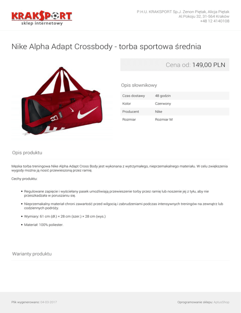 P.H.U. KRAKSPORT Sp.J. Zenon Piętak, Alicja Piętak Al.Pokoju 32, 31-564 Kraków +48 12 4140108 Nike Alpha Adapt Crossbody - torba sportowa średnia Cena od: 149,00 PLN Opis słownikowy Czas dostawy 48 godzin Kolor Czerwony Producent Nike Rozmiar Rozmiar M Opis produktu Męska torba treningowa Nike Alpha Adapt Cross Body jest wykonana z wytrzymałego, nieprzemakalnego materiału. W celu zwiększenia wygody można ją nosić przewieszoną przez ramię. Cechy produktu: Regulowane zapięcie i wyściełany pasek umożliwiają przewieszenie torby przez ramię lub noszenie jej z tyłu, aby nie przeszkadzała w poruszaniu się. Nieprzemakalny materiał chroni zawartość przed wilgocią i zabrudzeniami podczas intensywnych treningów na zewnątrz lub codziennych podróży. Wymiary: 61 cm (dł.) × 28 cm (szer.) × 28 cm (wys.) Materiał: 100% poliester. Warianty produktu Plik wygenerowano: 04-03-2017 Oprogramowanie sklepu: AptusShop P.H.U. KRAKSPORT Sp.J. Zenon Piętak, Alicja Piętak Al.Pokoju 32, 31-564 Kraków +48 12 4140108 M 149,00 PLN Galeria Plik wygenerowano: 04-03-2017 Powered by TCPDF (www.tcpdf.org) Oprogramowanie sklepu: AptusShop
