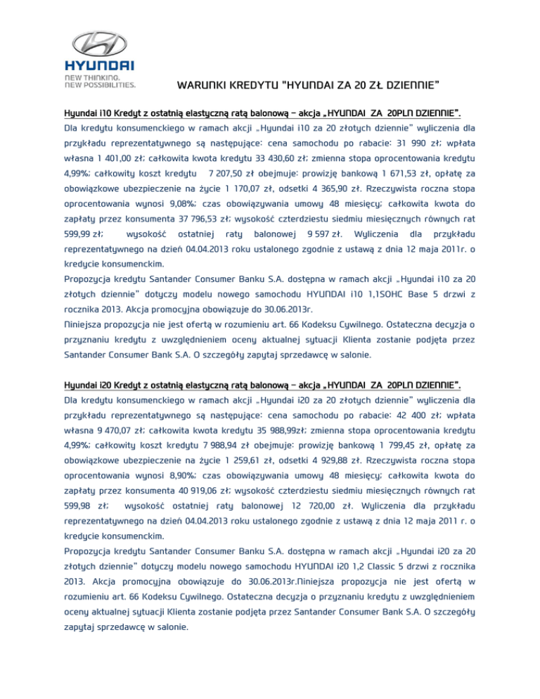 WARUNKI KREDYTU "HYUNDAI ZA 20 ZŁ DZIENNIE” Hyundai i10 Kredyt z ostatnią elastyczną ratą balonową – akcja „HYUNDAI ZA 20PLN DZIENNIE”. Dla kredytu konsumenckiego w ramach akcji „Hyundai i10 za 20 złotych dziennie” wyliczenia dla przykładu reprezentatywnego są następujące: cena samochodu po rabacie: 31 990 zł; wpłata własna 1 401,00 zł; całkowita kwota kredytu 33 430,60 zł; zmienna stopa oprocentowania kredytu 4,99%; całkowity koszt kredytu 7 207,50 zł obejmuje: prowizję bankową 1 671,53 zł, opłatę za obowiązkowe ubezpieczenie na życie 1 170,07 zł, odsetki 4 365,90 zł. Rzeczywista roczna stopa oprocentowania wynosi 9,08%; czas obowiązywania umowy 48 miesięcy; całkowita kwota do zapłaty przez konsumenta 37 796,53 zł; wysokość czterdziestu siedmiu miesięcznych równych rat 599,99 zł; wysokość ostatniej raty balonowej 9 597 zł. Wyliczenia dla przykładu reprezentatywnego na dzień 04.04.2013 roku ustalonego zgodnie z ustawą z dnia 12 maja 2011r. o kredycie konsumenckim. Propozycja kredytu Santander Consumer Banku S.A. dostępna w ramach akcji „Hyundai i10 za 20 złotych dziennie” dotyczy modelu nowego samochodu HYUNDAI i10 1,1SOHC Base 5 drzwi z rocznika 2013. Akcja promocyjna obowiązuje do 30.06.2013r. Niniejsza propozycja nie jest ofertą w rozumieniu art. 66 Kodeksu Cywilnego. Ostateczna decyzja o przyznaniu kredytu z uwzględnieniem oceny aktualnej sytuacji Klienta zostanie podjęta przez Santander Consumer Bank S.A. O szczegóły zapytaj sprzedawcę w salonie. Hyundai i20 Kredyt z ostatnią elastyczną ratą balonową – akcja „HYUNDAI ZA 20PLN DZIENNIE”. Dla kredytu konsumenckiego w ramach akcji „Hyundai i20 za 20 złotych dziennie” wyliczenia dla przykładu reprezentatywnego są następujące: cena samochodu po rabacie: 42 400 zł; wpłata własna 9 470,07 zł; całkowita kwota kredytu 35 988,99zł; zmienna stopa oprocentowania kredytu 4,99%; całkowity koszt kredytu 7 988,94 zł obejmuje: prowizję bankową 1 799,45 zł, opłatę za obowiązkowe ubezpieczenie na życie 1 259,61 zł, odsetki 4 929,88 zł. Rzeczywista roczna stopa oprocentowania wynosi 8,90%; czas obowiązywania umowy 48 miesięcy; całkowita kwota do zapłaty przez konsumenta 40 919,06 zł; wysokość czterdziestu siedmiu miesięcznych równych rat 599,98 zł; wysokość ostatniej raty balonowej 12 720,00 zł. Wyliczenia dla przykładu reprezentatywnego na dzień 04.04.2013 roku ustalonego zgodnie z ustawą z dnia 12 maja 2011 r. o kredycie konsumenckim. Propozycja kredytu Santander Consumer Banku S.A. dostępna w ramach akcji „Hyundai i20 za 20 złotych dziennie” dotyczy modelu nowego samochodu HYUNDAI i20 1,2 Classic 5 drzwi z rocznika 2013. Akcja promocyjna obowiązuje do 30.06.2013r.Niniejsza propozycja nie jest ofertą w rozumieniu art. 66 Kodeksu Cywilnego. Ostateczna decyzja o przyznaniu kredytu z uwzględnieniem oceny aktualnej sytuacji Klienta zostanie podjęta przez Santander Consumer Bank S.A. O szczegóły zapytaj sprzedawcę w salonie. WARUNKI KREDYTU "HYUNDAI ZA 20 ZŁ DZIENNIE” Hyundai i30 Kredyt z ostatnią elastyczną ratą balonową – akcja „HYUNDAI ZA 20PLN DZIENNIE”. Dla kredytu konsumenckiego w ramach akcji „Hyundai i30 za 20 złotych dziennie” wyliczenia dla przykładu reprezentatywnego są następujące: cena samochodu po rabacie: 55 400 zł; wpłata własna 19 545,65 zł; całkowita kwota kredytu 39 185,08 zł; zmienna stopa oprocentowania kredytu 4,99%; całkowity koszt kredytu 8 965,05 zł obejmuje: prowizję bankową 1 959,25 zł, opłatę za obowiązkowe ubezpieczenie na życie 1 371,48 zł, odsetki 5 634,32 zł. Rzeczywista roczna stopa oprocentowania wynosi 8,72%; czas obowiązywania umowy 48 miesięcy; całkowita kwota do zapłaty przez konsumenta 44 819,53 zł; wysokość czterdziestu siedmiu miesięcznych równych rat 599,99 zł; wysokość ostatniej raty balonowej 16 620 zł. Wyliczenia dla przykładu reprezentatywnego na dzień 04.04.2013 roku ustalonego zgodnie z ustawą z dnia 12 maja 2011 r. o kredycie konsumenckim. Propozycja kredytu Santander Consumer Banku S.A. dostępna w ramach akcji „Hyundai i30 za 20 złotych dziennie” dotyczy modelu nowego samochodu HYUNDAI i30 1,4 CVVT Wagon Base z rocznika 2013. Akcja promocyjna obowiązuje do 30.06.2013r. Niniejsza propozycja nie jest ofertą w rozumieniu art. 66 Kodeksu Cywilnego. Ostateczna decyzja o przyznaniu kredytu z uwzględnieniem oceny aktualnej sytuacji Klienta zostanie podjęta przez Santander Consumer Bank S.A. O szczegóły zapytaj sprzedawcę w salonie. Hyundai i40 Kredyt z ostatnią elastyczną ratą balonową – akcja „HYUNDAI ZA 20PLN DZIENNIE”. Dla kredytu konsumenckiego w ramach akcji „Hyundai i40 za 20 złotych dziennie” wyliczenia dla przykładu reprezentatywnego są następujące: cena samochodu po rabacie: 85 900 zł; wpłata własna 43 185,79 zł; całkowita kwota kredytu 46 682,20 zł; zmienna stopa oprocentowania kredytu 4,99%; całkowity koszt kredytu 11 254,77 zł obejmuje: prowizję bankową 2 334,11 zł, opłatę za obowiązkowe ubezpieczenie na życie 1 633,88 zł, odsetki 7 286,78 zł. Rzeczywista roczna stopa oprocentowania wynosi 8,44%; czas obowiązywania umowy 48 miesięcy; całkowita kwota do zapłaty przez konsumenta 53 969,06 zł; wysokość czterdziestu siedmiu miesięcznych równych rat 599,98 zł; wysokość ostatniej raty balonowej 25 770 zł. Wyliczenia dla przykładu reprezentatywnego na dzień 04.04.2013 roku ustalonego zgodnie z ustawą z dnia 12 maja 2011 r. o kredycie konsumenckim. Propozycja kredytu Santander Consumer Banku S.A. dostępna w ramach akcji „Hyundai i40 za 20 złotych dziennie” dotyczy modelu nowego samochodu HYUNDAI i40 1,6GDi Wagon Classic z rocznika 2013. Akcja promocyjna obowiązuje do 30.06.2013r. Niniejsza propozycja nie jest ofertą w rozumieniu art. 66 Kodeksu Cywilnego. Ostateczna decyzja o przyznaniu kredytu z uwzględnieniem oceny aktualnej sytuacji Klienta zostanie