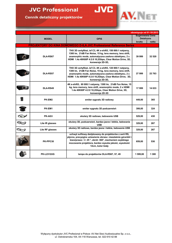 MODEL OPIS obowiązuje od 01-10-2015 Sugerowana Cena Detaliczna brutto netto PROJEKTORY DO KINA DOMOWEGO D-ILA JVC Professional Reference Series DLA-RS67 THX 3D certyfikat, isf C3, 4K e-shift3, 150 000:1 natywny, 1300 lm, 21dB Fan Noise, 15 kg, lens memory, lens shift, anamorphic mode, automatyczna zasłona obiektywu, 2 x HDMI 1.4a 40K60P 4:2:0 10,2Gbps, Clear Motion Drive, 3D, konwersja 2D-3D, 39 999 32 520 DLA-RS57 THX 3D certyfikat, isf C3, 4K e-shift3, 120 000:1 natywny, 1300 lm, 21dB Fan Noise, 15 kg, lens memory, lens shift, anamorphic mode, automatyczna zasłona obiektywu, 2 x HDMI 1.4a 40K60P 4:2:0 10,2Gbps, Clear Motion Drive, 3D, konwersja 2D-3D, 27 999 22 763 DLA-RS49 4K e-shift3, 60 000:1 natywny, 1300 lm, 21dB Fan Noise, 15 kg, lens memory, lens shift, anamorphic mode, 2 x HDMI 1.4a 40K60P 4:2:0 10,2Gbps, Clear Motion Drive, 3D, konwersja 2D-3D 17 999 14 633 PK-EM2 emiter sygnału 3D radiowy 449,00 365 PK-EM1 emiter sygnału 3D podczerwień 399,00 324 PK-AG3 okulary 3D radiowe, ładowanie USB 529,00 430 329,00 267 329,00 267 659,00 536 1 599,00 1 300 Lite IR glasses Lite RF glasses PK-PPC30 PK-L2312UG okulary 3D, podczerwień, bardzo jasne i lekkie, ładowanie USB okulary 3D radiowe, bardzo jasne i lekkie, ładowanie USB uchwyt sufitowy dedykowany do projektorów z serii RS, płynna, precyzyjne ustawienie obrazu: niezależnie góra/dół i lewo/prawo: +/- 25 °, obrót: 360°, mechanizm szybkiego mocowania projektora, bardzo wysoka jakość, wysokość 12cm, kolor biały lampa do projektorów DLA-RS67, 57, 49 Wyłączny dystrybutor JVC Profesional w Polsce: AV.Net Sieci Audiowizualne Sp. z o.o., ul. Ostrobramska 104, 04-118 Warszawa, tel. 022 610 42 88