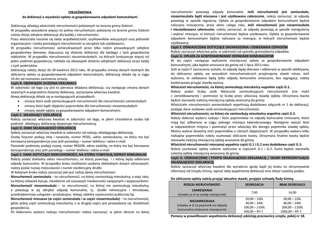 OBJAŚNIENIA do deklaracji o wysokości opłaty za gospodarowanie odpadami komunalnymi Deklarację składają właściciele nieruchomości położonych na terenie gminy Dobroń. W przypadku posiadania więcej niż jednej nieruchomości położonej na terenie gminy Dobroń należy złożyć odrębne deklaracje dla każdej z nieruchomości. Przez właściciela rozumie się także współwłaścicieli, użytkowników wieczystych oraz jednostki organizacyjne i osoby posiadające nieruchomość w zarządzie lub użytkowaniu. W przypadku nieruchomości zamieszkiwanych przez kilka rodzin prowadzących odrębne gospodarstwa domowe, dopuszcza się złożenie deklaracji dla każdego z tych gospodarstw oddzielnie. W przypadku nieruchomości niezamieszkałych, na których funkcjonuje więcej niż jeden podmiot gospodarczy, nakłada się obowiązek złożenia odrębnych deklaracji przez każdy z tych podmiotów. Deklarację należy złożyć do 30 kwietnia 2013 roku. W przypadku zmiany danych istotnych dla obliczenia opłaty za gospodarowanie odpadami komunalnymi, deklarację składa się w ciągu 14 dni od momentu zaistnienia zmiany. Część B. OBOWIĄZEK ZŁOŻENIA DEKLARACJI W zależności od tego czy jest to pierwsza składana deklaracja, czy następuje zmiana danych zawartych w poprzednio złożonej deklaracji, zaznaczamy właściwy kwadrat. Nową deklarację składa się w następujących przypadkach: zmiany ilości osób zamieszkujących nieruchomość dla nieruchomości zamieszkałych zmiany ilości bądź objętości pojemników dla nieruchomości niezamieszkałych zmiany stawki opłaty za gospodarowanie odpadami komunalnymi. Część C. SKŁADAJĄCY DEKLARACJĘ Należy zaznaczyć właściwy kwadrat w zależności od tego, w jakim charakterze osoba lub podmiot składający deklarację dysponuje nieruchomością. Część D. DANE SKŁADAJĄCEGO DEKLARACJĘ Należy zaznaczyć właściwy kwadrat w zależności od rodzaju składającego deklarację. Osoby fizyczne podają imię i nazwisko, numer PESEL, adres zamieszkania, na który ma być kierowana korespondencja oraz jeśli posiadają – numer telefonu i adres e-mail. Pozostałe podmioty podają nazwę, numer REGON, adres siedziby, na który ma być kierowana korespondencja oraz jeśli posiadają – numer telefonu i adres e-mail. Część E. DANE DOTYCZĄCE NIERUCHOMOŚCI, NA KTÓREJ POWSTAJĄ ODPADY KOMUNALNE Należy podać dokładny adres nieruchomości, na której powstają i z której będą odbierane odpady komunalne. W przypadku braku możliwości podania dokładnych danych adresowych, należy podać nazwę miejscowości i numer ewidencyjny działki. W kolejnym kroku należy zaznaczyć jaki jest rodzaj danej nieruchomości. Nieruchomość zamieszkała – to nieruchomość, na której zamieszkują mieszkańcy, a więc taka, na której człowiek bytuje, niezależnie od czasowych nieobecności związanych z wypoczynkiem. Nieruchomość niezamieszkała – to nieruchomość, na której nie zamieszkują mieszkańcy, a powstają w jej obrębie odpady komunalne, tj.: działki rekreacyjne i letniskowe, przedsiębiorstwa usługowe i produkcyjne, sklepy, obiekty użyteczności publicznej itp. Nieruchomość mieszana (w części zamieszkała i w części niezamieszkała) – to nieruchomość, gdzie jedną część zamieszkują mieszkańcy, a w drugiej części jest prowadzona np. działalność gospodarcza. Po dokonaniu wyboru rodzaju nieruchomości należy zaznaczyć, w jakim okresie na danej nieruchomości powstają odpady komunalne. Jeśli nieruchomość jest zamieszkała, niezamieszkała bądź mieszana i jest użytkowana całorocznie, należy zaznaczyć, że odpady powstają w sposób regularny. Opłata za gospodarowanie odpadami komunalnymi będzie naliczana miesięcznie, przez okres całego roku. Jeśli nieruchomość jest niezamieszkała i nieużytkowana całorocznie, należy zaznaczyć, że odpady powstają w sposób nieregularny i wybrać miesiące, w których nieruchomość będzie użytkowana. Opłata za gospodarowanie odpadami komunalnymi będzie naliczana za miesiące, w których nieruchomość będzie użytkowana. Część F. OŚWIADCZENIE DOTYCZĄCE GROMADZENIA I ODBIERANIA ODPADÓW Należy zaznaczyć właściwe pola, w zależności od sposobu gromadzenia odpadów. Część G. OPŁATA ZA GOSPODAROWANIE ODPADAMI KOMUNALNYMI W tej części następuje wyliczenie miesięcznej opłaty za gospodarowanie odpadami komunalnymi, jaka będzie wnoszona do gminy od 1 lipca 2013 roku. Jeśli w części F zaznaczone zostało, że odpady będą zbierane i odbierane w sposób selektywny, do obliczenia opłaty we wszystkich nieruchomościach przyjmujemy stawki niższe. Jeśli wybrano, że oddawane będą tylko odpady komunalne zmieszane, bez segregacji, należy każdorazowo przyjąć stawkę wyższą. Właściciel nieruchomości, na której zamieszkują mieszkańcy wypełnia część G.1. Należy podać liczbę osób faktycznie zamieszkujących nieruchomość (nie mylić z zameldowanymi) i pomnożyć tę liczbę przez właściwą stawkę opłaty. Otrzymana kwota będzie stanowiła należną miesięczną opłatę wnoszoną do gminy. Właściciele nieruchomości zamieszkałych wypełniają dodatkowo załącznik nr 1 do deklaracji, podając dane osobowe osób zamieszkujących nieruchomość. Właściciel nieruchomości, na której nie zamieszkują mieszkańcy wypełnia część G.2. Należy dokonać wyboru rodzaju i ilości pojemników na odpady komunalne zmieszane, które mają być odbierane w ciągu jednego miesiąca kalendarzowego. Następnie wpisać ilość w odpowiednim miejscu i pomnożyć przez właściwą dla danego pojemnika stawkę opłaty. Można wybrać dowolną ilość pojemników o różnych objętościach. W przypadku wyboru kilku rodzajów pojemników należy zsumować obliczone kwoty. Otrzymana finalnie kwota będzie stanowiła należną miesięczną opłatę wnoszona do gminy. Właściciel nieruchomości mieszanej wypełnia czę