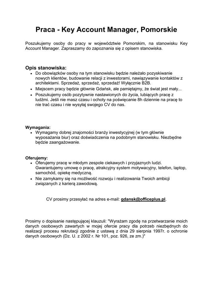 Praca - Key Account Manager, Pomorskie Poszukujemy osoby do pracy w województwie Pomorskim, na stanowisku Key Account Manager. Zapraszamy do zapoznania się z opisem stanowiska. Opis stanowiska: Do obowiązków osoby na tym stanowisku będzie należało pozyskiwanie nowych klientów, budowanie relacji z inwestorami, nawiązywanie kontaktów z architektami. Sprzedaż, sprzedaż, sprzedaż! Wyłącznie B2B. Miejscem pracy będzie głównie Gdańsk, ale pamiętajmy, że świat jest mały... Poszukujemy osób pozytywnie nastawionych do życia, lubiących pracę z ludźmi. Jeśli nie masz czasu i ochoty na poświęcanie 8h dziennie na pracę to nie trać czasu i nie wysyłaj swojego CV do nas. Wymagania: Wymagamy dobrej znajomości branży inwestycyjnej (w tym głównie wyposażania biur) oraz doświadczenia na podobnym stanowisku. Niezbędne będzie zaangażowanie. Oferujemy: Oferujemy pracę w młodym zespole ciekawych i przyjaznych ludzi. Gwarantujemy umowę o pracę, atrakcyjny system motywacyjny, telefon, laptop, samochód, opiekę medyczną. Nie zamykamy się na możliwość rozwoju i realizowania Twoich ambicji związanych z karierą zawodową. CV prosimy przesyłać na adres e-mail: [email protected]. Prosimy o dopisanie następującej klauzuli: "Wyrażam zgodę na przetwarzanie moich danych osobowych zawartych w mojej ofercie pracy dla potrzeb niezbędnych do realizacji procesu rekrutacji zgodnie z ustawą z dnia 29 sierpnia 1997r. o ochronie danych osobowych (Dz. U. z 2002 r. Nr 101, poz. 926, ze zm.)"