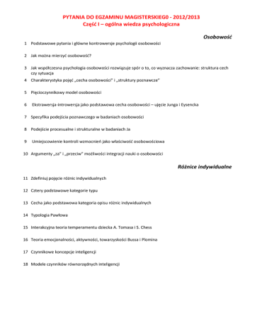 PYTANIA DO EGZAMINU MAGISTERSKIEG0 - 2012/2013 Część I – ogólna wiedza psychologiczna Osobowość 1 Podstawowe pytania i główne kontrowersje psychologii osobowości 2 Jak można mierzyć osobowość? 3 Jak współczesna psychologia osobowości rozwiązuje spór o to, co wyznacza zachowanie: struktura cech czy sytuacja 4 Charakterystyka pojęć „cecha osobowości” i „struktury poznawcze” 5 Pięcioczynnikowy model osobowości 6 Ekstrawersja-introwersja jako podstawowa cecha osobowości – ujęcie Junga i Eysencka 7 Specyfika podejścia poznawczego w badaniach osobowości 8 Podejście procesualne i strukturalne w badaniach Ja 9 Umiejscowienie kontroli wzmocnień jako właściwość osobowościowa 10 Argumenty „za” i „przeciw” możliwości integracji nauki o osobowości Różnice indywidualne 11 Zdefiniuj pojęcie różnic indywidualnych 12 Cztery podstawowe kategorie typu 13 Cecha jako podstawowa kategoria opisu różnic indywidualnych 14 Typologia Pawłowa 15 Interakcyjna teoria temperamentu dziecka A. Tomasa i S. Chess 16 Teoria emocjonalności, aktywności, towarzyskości Bussa i Plomina 17 Czynnikowe koncepcje inteligencji 18 Modele czynników równorzędnych inteligencji 19 Teoria osobowości Allporta jako teoria oparta na koncepcji cech 20 Zasada równości społecznej w kontekście różnic indywidualnych Emocje, motywacja 21 Doznanie flow wg Csikszentmihalyiego 22 Dwa przykładowe różne kryteria wyodrębniania emocji podstawowych 23 Elementy poznawczego modelu motywacji wg Heckhausena i Rhienberga 24 Rodzaje agresji 25 Rola ciała migdałowatego i kory mózgowej w procesie reakcji emocjonalnej 26 Systemy aktywacji emocji wg Izarda 27 Systemy emocjonalno-motywacyjne wg Graya 28 Teoria wyuczonej bezradności Seligmana 29 Wpływ nagród na motywację parateliczną 30 Zależności między preferowanym poziomem trudności zadania a obawą przed niepowodzeniem w teorii Atkinsona Procesy poznawcze 31 Prawa organizacji percepcji 32 Percepcja obiektu w procesie „dół-góra” i „góra-dół” 33 Modele kategoryzacji percepcyjnej 34 Teoria podwójnego kodowania Paivio 35 Wyobrażenia – stanowisko obrazowe vs propozycjonalne 36 Podstawowe rodzaje pamięci wg. Squire’a 37 Koncepcja pamięci semantycznej Collinsa i Quilian. 38 Teorie uwagi (wczesnej i późnej selekcji, podzielności uwagi) 39 Błędy w rozumowaniu 40 Heurystyki rozwiązywania problemów Psychopatologia 41 Objaw psychopatologiczny – zdefiniuj pojęcie oraz podaj przykłady objawów psychopatologicznych 42 Lęk w sytuacji kryzysowej - scharakteryzuj jego przejawy i sposoby radzenia sobie z nim w kryzysie emocjonalnym - podaj przykłady 43 Depresja - jak rozumiesz pojęcie, wymień postaci zaburzeń depresyjnych według współczesnych klasyfikacji psychiatrycznych 44 Współczesne koncepcje pochodzenia i rozwoju psychopatologii depresji -wymień podstawowe kierunki poszukiwania źródeł pochodzenia zaburzeń depresyjnych 45 Zaburzenia osobowości –zdefiniuj czym są, wymień rodzaje zaburzeń osobowości według klasyfikacji ICD 10 i DSM IV oraz scharakteryzuj jedno z nich 46 Zaburzenia nerwicowe – definicja oraz rodzaje zaburzeń nerwicowych według współczesnych klasyfikacji psychiatrycznych ICD 10 i DSM IV 47 Na czym polegają i jaka jest istota zaburzeń psychosomatycznych; podaj rodzaje zaburzeń psychosomatycznych 48 Psychozy – zdefiniuj pojęcie, podaj rodzaje psychoz i scharakteryzuj główne cechy objawu psychotycznego 49 Do jakiej kategorii zaburzeń zaliczana jest schizofrenia w klasyfikacji ICD 10; podaj i omów jej główne objawy 50 Różnice pomiędzy zaburzeniami nerwicowymi i psychotycznymi Wprowadzenie do psychologii 51 Wpływ filozofii na powstanie psychologii - wkład Arystotelesa do historii psychologii 52 Znaczenie historii psychologii dla rozumienia współczesnej psychologii - rola czynników kontekstowych 53 Cele psychologii jako nauki 54 Powstanie i rozwój psychologii behawiorystycznej; podstawowe tezy Manifestu Behawiorystycznego (1913) J.Watsona 55 Paralelizm psychofizyczny jako zasada metodologiczna stosowana w obszarze psychofizyki przez E.H.Webera i G.Fechnera 56 Behawiorystyczna koncepcja człowieka - podstawowe założenia 57 Psychoanalityczna koncepcja człowieka - podstawowe założenia 58 Poznawcza koncepcja człowieka - podstawowe założenia 59 Psychologia humanistyczna jako reakcja na ograniczenia psychoanalizy i behawioryzmu 60 W.Wundt ojcem nowożytnej psychologii - psychologia eksperymentalna i nieeksperymentalna Psychologia społeczna 61 Teorie Ja w psychologii społecznej 62 Klasyczne i nowe teorie atrybucji 63 Geneza i funkcje stereotypów 64 Stereotypy związane z płcią 65 Taktyki autoprezentacji 66 Reguły wpływu społecznego 67 Wywieranie wpływu w bliskich związkach 68 Struktury grupowe 69 Konformizm – rodzaje i uwarunkowania 70 Zachowania prospołeczne i ich geneza Psychologia rozwoju 71 Założenia koncepcji life-span psychology 72 Koncepcja rozwoju poznawczego Jeana Piageta 73 Wybrane koncepcje rozwoju rozumowania moralnego 74 Koncepcja kryzysów rozwojowych Erika Eriksona 75 Koncepcja zadań rozwojowych Roberta Havighursta 76 Specyfika zmian rozwojowych na przestrzeni życia (w ujęciu Anny Brzezińskiej) 77 Rodzaje przywiązania i ich konsekwencje dla rozwoju 78 Podstawowe właściwości rozwojowe okresu dzieciństwa (w ujęciu Anny Matczak) 79 Podstawowe właściwości rozwojowe okresu dorastania (w ujęciu Anny Matczak) 80 Podstawowe właściwości rozwojowe okresu dorosłości (w ujęciu Anny Matczak) PYTANIA DO EGZAMINU MAGISTERSKIEG0 - 2012/2013 Część II - umiejętności warsztatowe Etyka zawodu psychologa 1 Etyczne problemy diagnostyki psychologicznej 2 Etyczne zasady udzielania pomocy psychologicznej 3 Etyki stosowane a moralne problemy współczesności 4 Metodologiczne problemy etyk stosowanych 5 Pojęcie charakteru moralnego 6 Psycholog w środkach masowego przekazu - aspekty etyczne 7 Kompetencje - etyczny wy