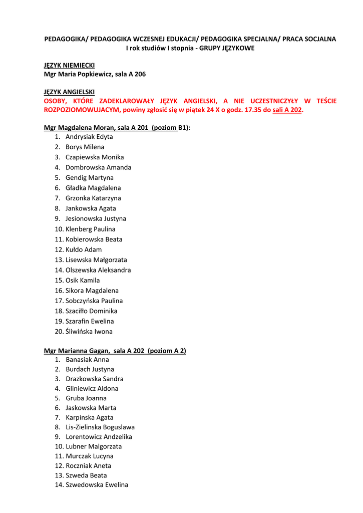 PEDAGOGIKA/ PEDAGOGIKA WCZESNEJ EDUKACJI/ PEDAGOGIKA SPECJALNA/ PRACA SOCJALNA I rok studiów I stopnia - GRUPY JĘZYKOWE JĘZYK NIEMIECKI Mgr Maria Popkiewicz, sala A 206 JĘZYK ANGIELSKI OSOBY, KTÓRE ZADEKLAROWAŁY JĘZYK ANGIELSKI, A NIE UCZESTNICZYŁY W TEŚCIE ROZPOZIOMOWUJACYM, powiny zgłosić się w piątek 24 X o godz. 17.35 do sali A 202. Mgr Magdalena Moran, sala A 201 (poziom B1): 1. Andrysiak Edyta 2. Borys Milena 3. Czapiewska Monika 4. Dombrowska Amanda 5. Gendig Martyna 6. Gładka Magdalena 7. Grzonka Katarzyna 8. Jankowska Agata 9. Jesionowska Justyna 10. Klenberg Paulina 11. Kobierowska Beata 12. Kułdo Adam 13. Lisewska Małgorzata 14. Olszewska Aleksandra 15. Osik Kamila 16. Sikora Magdalena 17. Sobczyńska Paulina 18. Szaciłło Dominika 19. Szarafin Ewelina 20. Śliwińska Iwona Mgr Marianna Gagan, sala A 202 (poziom A 2) 1. Banasiak Anna 2. Burdach Justyna 3. Drazkowska Sandra 4. Gliniewicz Aldona 5. Gruba Joanna 6. Jaskowska Marta 7. Karpinska Agata 8. Lis-Zielinska Boguslawa 9. Lorentowicz Andzelika 10. Lubner Malgorzata 11. Murczak Lucyna 12. Roczniak Aneta 13. Szweda Beata 14. Szwedowska Ewelina 15. Swiecka Monika 16. Wesolowska Agnieszka 17. Wolowski Artur 18. Zawistowska Weronika 19. Zdunek Bozena 20. Zwara Danuta Mgr Nicolas Rougier, sala A 203 (poziom B 1 – ) 1. Adamowicz Klaudia 2. Arkuszyńska Ewa 3. Bieńkowska Anna 4. Bojanowska Karolina 5. Cyrzan Aleksandra 6. Dudkowska Dominika 7. Jurkian Marta 8. Justa Jagoda 9. Kęska Bartłomiej 10. Kobiela Arkadiusz 11. Kuczek Agnieszka 12. Landowska Paulina 13. Lieban Monika 14. Murglin Izabela 15. Pestke Sylwia 16. Plichta Anna 17. Plichta Ewa 18. Tusińska Alicja 19. Zambecka Natalia 20. Zydlewska Anna Mgr Anna Dulska, sala A 205 (poziom B2) 1. Anzlik Małgorzata 2. Berezowska Izabela 3. Bużan Sandra 4. Chmura Katarzyna 5. Czerwionka Monika 6. Gawryś Paulina 7. Jaworska Aleksandra 8. Kąkol Monika 9. Kochanic Dorota 10. Lewandowska Anita 11. Mądra Adriana 12. Michalska Agnieszka 13. Motyka Marta 14. Paszke Paulina 15. Sankiewicz Ewa 16. Sobczak Roman 17. Stachnowicz Aleksandra 18. Wilczewska Aneta 19. Woźniak Anna 20. Żukowska Kinga Mgr Piotr Andrzejewski, sala A 207 (poziom C 1) 1. Boniewska Karolina 2. Cząstka Aleksandra 3. Czeszomska-Kowalczyk Barbara 4. Grochal Monika 5. Hićkiewicz Izabela 6. Sikorska Karolina 7. Iwicka Klaudia 8. Jabłońska Dagmara 9. Jakubowska Katarzyna 10. Kalbarczyk Paulina 11. Karnath Weronika 12. Piankowska Maja Anastazja 13. Pietruszka Magdalena 14. Poniatowska Małgorzata 15. Puch Małgorzata 16. Rybak Joanna 17. Schroeder Magda 18. Studzińska Weronika 19. Styp-Rekowska Martyna 20. Sulewska Agnieszka 21. Suszek Alicja 22. Włoch Wiktoria Mgr Danuta Jędrzejak, sala S 311 (poziom A 1) 1.Bławat Dorota 2.Bober Joanna 3.Buniek Dorota 4.Danecka Justyna 5.Deka Monika 6.Dobrowolski Wojciech 7.Głomska Paulina 8.Hebel Agnieszka 9.Karczewska-Gaweł Bogusława 10.Kozłowska Marta 11.Kwiatkowska Magdalena 12.Mikielska Emilia 13.Milbrandt Ewelina 14.Miotek Grzegorz 15.Młynarska Joanna 16.Mróz Martyna 17.Paprocka-Grawia Paulina 18.Sikorska Katarzyna 19.Trędowicz Paweł