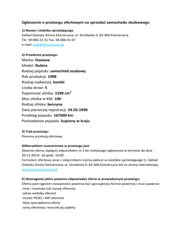 Ogłoszenie o przetargu ofertowym na sprzedaż samochodu służbowego 1) Nazwa i siedziba sprzedającego Zakład Oświaty Gminy Kościerzyna, ul. Strzelecka 9, 83-400 Kościerzyna Tel. 58 686-22-31 Fax. 58 686-41-67 e-mail: [email protected] 2) Przedmiot przetargu: Marka: Daewoo Model: Nubira Rodzaj pojazdu: samochód osobowy Rok produkcji: 1998 Rodzaj nadwozia: kombi Liczba drzwi: 5 Pojemność silnika: 1598 cm3 Moc silnika w KM: 106 Rodzaj silnika: benzyna Data pierwszej rejestracji: 24.02.1998 Przebieg pojazdu: 167000 km Pochodzenie pojazdu: kupiony w kraju 3) Tryb przetargu: Pisemny przetarg ofertowy. 4)Warunkiem uczestnictwa w przetargu jest: Złożenie oferty, będącej załącznikiem nr 2 do niniejszego ogłoszenia w terminie do dnia 20.12.2013r. do godz. 10,00. Formularz ofertowy wraz z załącznikami można pobrać w siedzibie sprzedającego tj. Zakład Oświaty Gminy Kościerzyna, ul. Strzelecka 9, 83-400 Kościerzyna lub ze strony internetowej www.bip.koscierzyna.pl 5) Wymagania jakim powinna odpowiadać oferta w prowadzonym przetargu: Oferta pod rygorem nieważności powinna być sporządzona formie pisemnej i musi zawierać: -imię i nazwisko lub nazwę oferenta -adres siedziby oferent -numer PESEL i NIP oferenta -datę sporządzenia oferty -cenę ofertową i warunki jej zapłaty -oświadczenie, że oferent zapoznał się z warunkami przetargu i przedmiotem sprzedaży oraz przyjmuje warunki bez zastrzeżeń – załącznik nr 1 Każdy oferent może złożyć tylko jedną ofertę. Sprzedający nie dopuszcza składania ofert wariantowych. Oferty należy składać w dni robocze w godz. 7:30-15:00 nie później jednak niż do dnia 20.12.2013r. do godz. 10,00 w Zakład Oświaty Gminy Kościerzyna, ul. Strzelecka 9, 83-400 Kościerzyna, w zaklejonych kopertach z napisem: „Przetarg ofertowy” na sprzedaż samochodu służbowego. Nie otwierać przed dniem 20.12.2013r. godz.10,00 6) Cena wywoławcza – 1.000 zł (słownie zł: Jeden tysiąc złotych 00/100) 7) Miejsce i termin. W którym można obejrzeć sprzedawany składnik majątku ruchomego. Samochód osobowy będący przedmiotem przetargu można oglądać przy ul. Strzeleckiej 9 w Kościerzynie od dnia ukazania się ogłoszenia w godz. 8.00–15.00 8) Termin zawarcia umowy sprzedaży: 1. Zawarcie umowy sprzedaży nastąpi po wyborze przez komisję przetargową najkorzystniejszej oferty. 2. Wydanie przedmiotu sprzedaży zostanie dokonane niezwłocznie po wpłaceniu przez Kupującego ceny nabycia. 3. Sprzedający zastrzega sobie własność pojazdu do chwili uiszczenia przez Kupującego ceny nabycia. 9) Inne informacje: 1. Przetarg jest prowadzony na podstawie rozporządzenia rady Ministrów z dnia 21.05.2010r. w sprawie sposobu i trybu gospodarowania składnikami rzeczowymi majątku ruchomego. 2. Komisja przetargowa wybierze oferenta, który zaoferuje najwyższą cenę na wybrany pojazd objęty przedmiotem przetargu. 10) Komisja przetargowa odrzuca ofertę jeżeli: 1. Została złożona po wyznaczonym terminie w niewłaściwym miejscu 2. Nie zawiera danych i dokumentów o których mowa w pkt.5 lub są one niekompletne, nieczytelne lub budzą inne wątpliwości, zaś złożenie wyjaśnień mogłoby prowadzić do uznania jej za nową ofertę. 11) O odrzuceniu oferty komisja przetargowa zawiadamia niezwłocznie oferenta.