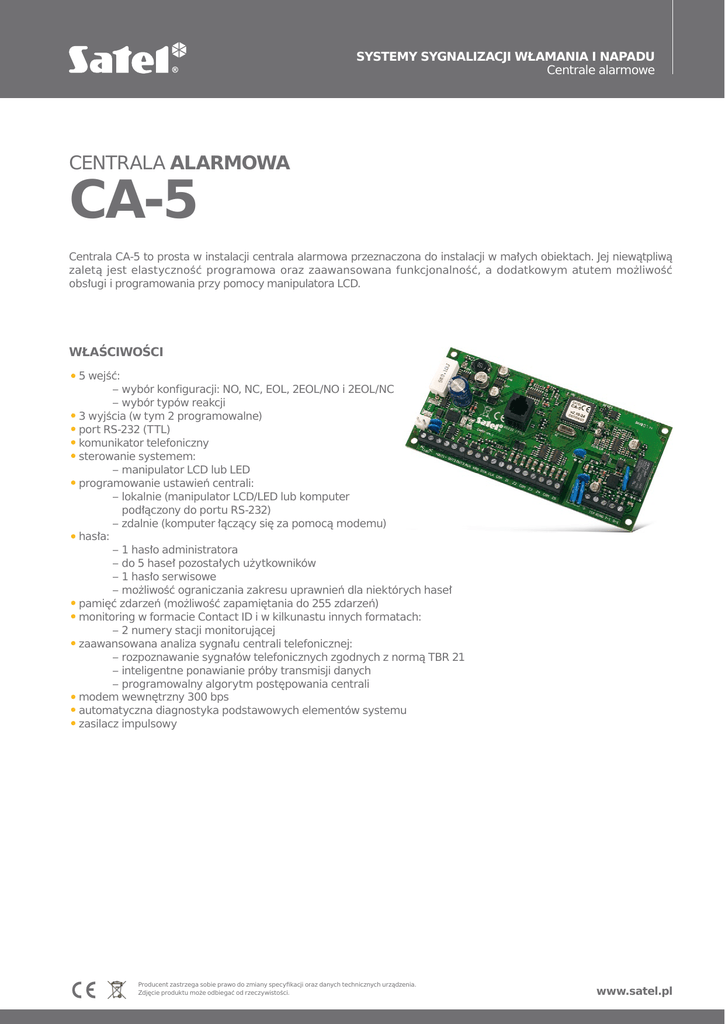 SYSTEMY SYGNALIZACJI WŁAMANIA I NAPADU Centrale alarmowe CENTRALA ALARMOWA CA-5 Centrala CA-5 to prosta w instalacji centrala alarmowa przeznaczona do instalacji w małych obiektach. Jej niewątpliwą zaletą jest elastyczność programowa oraz zaawansowana funkcjonalność, a dodatkowym atutem możliwość obsługi i programowania przy pomocy manipulatora LCD. WŁAŚCIWOŚCI • 5 wejść: – wybór konfiguracji: NO, NC, EOL, 2EOL/NO i 2EOL/NC – wybór typów reakcji • 3 wyjścia (w tym 2 programowalne) • port RS-232 (TTL) • komunikator telefoniczny • sterowanie systemem: – manipulator LCD lub LED • programowanie ustawień centrali: – lokalnie (manipulator LCD/LED lub komputer podłączony do portu RS-232) – zdalnie (komputer łączący się za pomocą modemu) • hasła: – 1 hasło administratora – do 5 haseł pozostałych użytkowników – 1 hasło serwisowe – możliwość ograniczania zakresu uprawnień dla niektórych haseł • pamięć zdarzeń (możliwość zapamiętania do 255 zdarzeń) • monitoring w formacie Contact ID i w kilkunastu innych formatach: – 2 numery stacji monitorującej • zaawansowana analiza sygnału centrali telefonicznej: – rozpoznawanie sygnałów telefonicznych zgodnych z normą TBR 21 – inteligentne ponawianie próby transmisji danych – programowalny algorytm postępowania centrali • modem wewnętrzny 300 bps • automatyczna diagnostyka podstawowych elementów systemu • zasilacz impulsowy Producent zastrzega sobie prawo do zmiany specyfikacji oraz danych technicznych urządzenia. Zdjęcie produktu może odbiegać od rzeczywistości. www.satel.pl SYSTEMY SYGNALIZACJI WŁAMANIA I NAPADU Centrale alarmowe DANE TECHNICZNE CECHY SYSTEMU Klasa zabezpieczenia Maksymalna liczba wejść w systemie Maksymalna liczba wyjść Współpraca z systemem bezprzewodowym ABAX przy wykorzystaniu magistrali Strefy Klasa C 5 3 Nie 1 Użytkownicy: użytkownicy + administratorzy + instalator Moduły rozszerzające 5+1+1 Nie Manipulatory z dodatkowymi wejściami Nie Pamięć zdarzeń 255 Wydruk zdarzeń Nie OBSŁUGA SYSTEMU Manipulatory LCD Tak Manipulatory LED Tak Współpraca ze sterownikami radiowymi z serii RX/RE Tak PŁYTY GŁÓWNE Znamionowe napięcie zasilania (±15%) Typ zasilacza 18 V AC, 50-60 Hz A Nominalne napięcie zasilacza centrali (±10%) Wydajność prądowa zasilacza Obciążalność wyjść wysokoprądowych (±10%) Obciążalność wyjść programowalnych niskoprądowych Maksymalna pojemność akumulatora Klasa środowiskowa Zakres temperatur pracy 12 V DC 1,2 A 1,1 A 50 mA 7 Ah II -10 °C…+55 °C Liczba wejść 5 Port RS-232 Tak Komunikator telefoniczny Tak Modem wewnętrzny Wymiary płytki elektroniki (mm) Tak 147 x 70 KOMUNIKACJA Tak Monitoring Powiadamianie Nie Obsługa przy pomocy programu DLOAD10 Tak Producent zastrzega sobie prawo do zmiany specyfikacji oraz danych technicznych urządzenia. Zdjęcie produktu może odbiegać od rzeczywistości. www.satel.pl