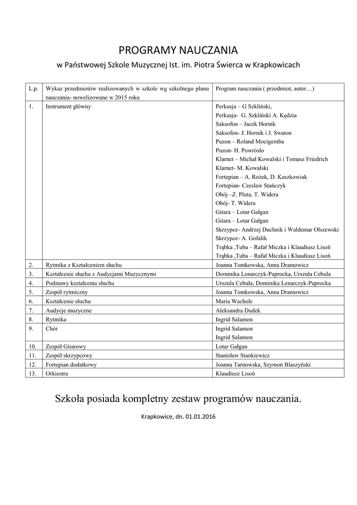 PROGRAMY NAUCZANIA w Paostwowej Szkole Muzycznej Ist. im. Piotra Świerca w Krapkowicach L.p. Wykaz przedmiotów realizowanych w szkole wg szkolnego planu nauczania- nowelizowane w 2015 roku Program nauczania ( przedmiot, autor…) 1. Instrument główny Perkusja – G Szkliński, Perkusja- G. Szkliński A. Kędzia Saksofon – Jacek Hornik Saksofon- J. Hornik i J. Swaton Puzon – Roland Mocigemba Puzon- H. Powrósło Klarnet – Michał Kowalski i Tomasz Friedrich Klarnet- M. Kowalski Fortepian – A. Rożek, D. Kaszkowiak Fortepian- Czeslaw Stańczyk Obój –Z. Pluta, T. Widera Obój- T. Widera Gitara – Lotar Gałgan Gitara – Lotar Gałgan Skrzypce- Andrzej Duchnik i Waldemar Olszewski Skrzypce- A. Gofalik Trąbka ,Tuba – Rafał Miczka i Klaudiusz Lisoń Trąbka ,Tuba – Rafał Miczka i Klaudiusz Lisoń 2. Rytmika z Kształceniem słuchu Joanna Tomkowska, Anna Dramowicz 3. Kształcenie słuchu z Audycjami Muzycznymi Dominika Lenarczyk-Paprocka, Urszula Cebula 4. Podstawy kształcenia słuchu Urszula Cebula, Dominika Lenarczyk-Paprocka 5. Zespół rytmiczny Joanna Tomkowska, Anna Dramowicz 6. Kształcenie słuchu Maria Wacholc 7. Audycje muzyczne Aleksandra Dudek 8. Rytmika Ingrid Salamon 9. Chór Ingrid Salamon Ingrid Salamon 10. Zespół Gitarowy Lotar Gałgan 11. Zespól skrzypcowy Stanisław Stankiewicz 12. Fortepian dodatkowy Joanna Tarnowska, Szymon Blaszyński 13. Orkiestra Klaudiusz Lisoń Szkoła posiada kompletny zestaw programów nauczania. Krapkowice, dn. 01.01.2016