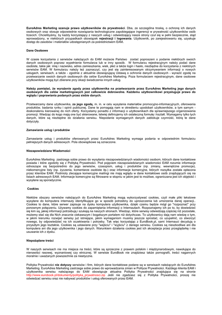 EuroAdres Marketing szanuje prawo użytkowników do prywatności. Dba, ze szczególna troską, o ochronę ich danych osobowych oraz stosuje odpowiednie rozwiązania technologiczne zapobiegające ingerencji w prywatność użytkowników osób trzecich. Chcielibyśmy, by każdy korzystający z naszych usług i odwiedzający nasze strony czuł się w pełni bezpiecznie, stąd wprowadzony, w niektórych przypadkach obowiązek rejestracji i logowania. Użytkownik, po zarejestrowaniu się, uzyskuje dostęp do zasobów i materiałów udostępnianych za pośrednictwem EAM. Dane Osobowe W czasie korzystania z serwisów należących do EAM możecie Państwo zostać poproszeni o podanie niektórych swoich danych osobowych poprzez wypełnienie formularza lub w inny sposób. W formularzu rejestracyjnym należy podać dane osobiste, takie jak: imię i nazwisko, adres zamieszkania, wiek, płeć a także login i hasło, niezbędne do korzystania z niektórych serwisów EAM. W formularzu należy też zaznaczyć, czy jest się zainteresowanym otrzymywaniem informacji o nowych usługach, serwisach, a także - zgodnie z aktualnie obowiązującą Ustawą o ochronie danych osobowych - wyrazić zgodę na przetwarzanie swoich danych osobowych dla celów EuroAdres Marketing. Poza formularzem rejestracyjnym, dane osobowe użytkowników mogą być zbierane przy okazji świadczenia innych usług. Należy pamiętać, że wyrażenie zgody przez użytkownika na przetwarzanie przez EuroAdres Marketing jego danych osobowych dla celów marketingowych jest całkowicie dobrowolne. Każdemu użytkownikowi przysługuje prawo do wglądu i poprawiania podanych przez siebie danych. Przetwarzamy dane użytkownika, za jego zgodą, m. in. w celu wysyłania materiałów promocyjno-informacyjnych, oferowania produktów, badania rynku i opinii publicznej. Dane te pomagają nam w określeniu upodobań użytkowników, a tym samym doskonaleniu kierowanej do nich oferty. Korzystamy ponadto z informacji o użytkownikach dla sprawniejszego organizowania promocji. Wiedząc do kogo mają one być skierowane, łatwiej definiujemy ich ostateczną formułę i kształt. Wymagamy tylko tych danych, które są niezbędne do działania serwisu. Niepodanie wymaganych danych zablokuje czynność, którą te dane dotyczyły. Zamawianie usług i produktów Zamawianie usług i produktów oferowanych przez EuroAdres Marketing wymaga podania w odpowiednim formularzu pełniejszych danych adresowych. Pola obowiązkowe są oznaczone. Niezapowiedziane Wiadomości EuroAdres Marketing zastrzega sobie prawo do wysyłania niezapowiedzianych wiadomości osobom, których dane kontaktowe posiada i które zgodziły się z Polityką Prywatności. Pod pojęciem niezapowiedzianych wiadomości EAM rozumie informacje odnoszące się bezpośrednio do jego serwisów, czasopism, usług i produktów (np. zmiany, wewnętrzne promocje), niekomercyjne listy (np. życzenia, komentarze osobiste itp.) oraz informacje komercyjne, których rozsyłka została opłacona przez klientów EAM. Podmioty zlecające komercyjne mailingi nie mają wglądu w dane kontaktowe osób znajdujących się na listach adresowych EAM. Informacje komercyjne są filtrowane w stopniu w jakim jest to możliwe, ograniczana jest ich objętość i wysyłane są sporadycznie. Cookies Niektóre obszary serwisów należących do EuroAdres Marketing mogą wykorzystywać cookies, czyli małe pliki tekstowe wysyłane do komputera internauty identyfikujące go w sposób potrzebny do uproszczenia lub umorzenia danej operacji.. Cookies to dane, które serwer zapisuje na dysku komputera użytkownika, dzięki czemu będzie mógł go "rozpoznać" przy ponownym połączeniu. Używamy cookies do zapamiętania informacji o Internautach. Rozpoznajemy ich po to, by dowiedzieć się kim są, jakiej informacji potrzebują i szukają na naszych stronach. Wiedząc, które serwisy odwiedzają częściej niż pozostałe, możemy stać się dla Nich znacznie ciekawszym i bogatszym portalem niż dotychczas. To użytkownicy dają nam wiedzę o tym, w jakim kierunku rozwijać serwisy już istniejące, jakim wymaganiom musimy jeszcze sprostać, co uzupełnić, co stworzyć nowego, by odpowiedzieć na ich oczekiwania i potrzeby. Tak więc korzystając z EuroBook.pl, sami Internauci decydują o przyszłym jego kształcie. Cookies są ustawiane przy "wejściu" i "wyjściu" z danego serwisu. Cookies są nieszkodliwe ani dla komputera ani dla jego użytkownika i jego danych. Warunkiem działania cookies jest ich akceptacja przez przeglądarkę i nie usuwanie ich z dysku. Niepożądane treści W naszych serwisach nie ma miejsca na treści, które są sprzeczne z prawem polskim i międzynarodowym, nawołujące do nienawiści rasowej, wyznaniowej czy etnicznej. W serwisie EuroBook nie znajdziesz także pornografii, treści nagannych moralnie i uważanych powszechnie za nieetyczne. Polityka Prywatności nie dotyczy serwisów i firm, których dane kontaktowe podane są w serwisach należących do EuroAdres Marketing. EuroAdres Marketing zastrzega sobie prawo do wprowadzania zmian w Polityce Prywatności. Każdego klienta EAM i użytkownika serwisu należącego do EAM obowiązuje aktualna Polityka Prywatności znajdująca się na stronie http://www.eurobook.pl/dokumenty/polityka_prywatnosci.zip Jeśli nie zgadzasz się z Polityka Prywatności, proszę nie odwiedzać serwisu oraz nie nabywać produktów i usług oferowanych przez EAM.