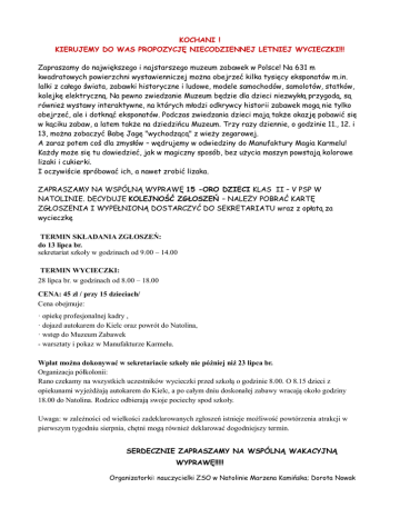 KOCHANI ! KIERUJEMY DO WAS PROPOZYCJĘ NIECODZIENNEJ LETNIEJ WYCIECZKI!!! Zapraszamy do największego i najstarszego muzeum zabawek w Polsce! Na 631 m kwadratowych powierzchni wystawienniczej można obejrzeć kilka tysięcy eksponatów m.in. lalki z całego świata, zabawki historyczne i ludowe, modele samochodów, samolotów, statków, kolejkę elektryczną. Na pewno zwiedzanie Muzeum będzie dla dzieci niezwykłą przygodą, są również wystawy interaktywne, na których młodzi odkrywcy historii zabawek mogą nie tylko obejrzeć, ale i dotknąć eksponatów. Podczas zwiedzania dzieci mają także okazję pobawić się w kąciku zabaw, a latem także na dziedzińcu Muzeum. Trzy razy dziennie, o godzinie 11., 12. i 13, można zobaczyć Babę Jagę "wychodzącą" z wieży zegarowej. A zaraz potem coś dla zmysłów – wędrujemy w odwiedziny do Manufaktury Magia Karmelu! Każdy może się tu dowiedzieć, jak w magiczny sposób, bez użycia maszyn powstają kolorowe lizaki i cukierki. I oczywiście spróbować ich, a nawet zrobić lizaka. ZAPRASZAMY NA WSPÓLNĄ WYPRAWĘ 15 -ORO DZIECI KLAS II – V PSP W NATOLINIE. DECYDUJE KOLEJNOŚĆ ZGŁOSZEŃ – NALEŻY POBRAĆ KARTĘ ZGŁOSZENIA I WYPEŁNIONĄ DOSTARCZYĆ DO SEKRETARIATU wraz z opłatą za wycieczkę TERMIN SKŁADANIA ZGŁOSZEŃ: do 13 lipca br. sekretariat szkoły w godzinach od 9.00 – 14.00 TERMIN WYCIECZKI: 28 lipca br. w godzinach od 8.00 – 18.00 CENA: 45 zł / przy 15 dzieciach/ Cena obejmuje: · opiekę profesjonalnej kadry , · dojazd autokarem do Kielc oraz powrót do Natolina, · wstęp do Muzeum Zabawek - warsztaty i pokaz w Manufakturze Karmelu. Wpłat można dokonywać w sekretariacie szkoły nie później niż 23 lipca br. Organizacja półkolonii: Rano czekamy na wszystkich uczestników wycieczki przed szkołą o godzinie 8.00. O 8.15 dzieci z opiekunami wyjeżdżają autokarem do Kielc, a po całym dniu doskonałej zabawy wracają około godziny 18.00 do Natolina. Rodzice odbierają swoje pociechy spod szkoły. Uwaga: w zależności od wielkości zadeklarowanych zgłoszeń istnieje możliwość powtórzenia atrakcji w pierwszym tygodniu sierpnia, chętni mogą również deklarować dogodniejszy termin. SERDECZNIE ZAPRASZAMY NA WSPÓLNĄ WAKACYJNĄ WYPRAWĘ!!!!! Organizatorki: nauczycielki ZSO w Natolinie Marzena Kamińska; Dorota Nowak