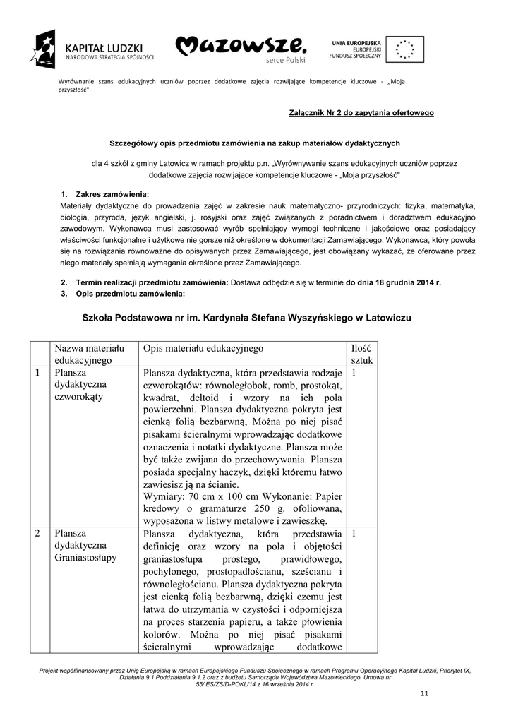 Wyrównanie szans edukacyjnych uczniów poprzez dodatkowe zajęcia rozwijające kompetencje kluczowe - „Moja przyszłość" Załącznik Nr 2 do zapytania ofertowego Szczegółowy opis przedmiotu zamówienia na zakup materiałów dydaktycznych dla 4 szkół z gminy Latowicz w ramach projektu p.n. „Wyrównywanie szans edukacyjnych uczniów poprzez dodatkowe zajęcia rozwijające kompetencje kluczowe - „Moja przyszłość" 1. Zakres zamówienia: Materiały dydaktyczne do prowadzenia zajęć w zakresie nauk matematyczno- przyrodniczych: fizyka, matematyka, biologia, przyroda, język angielski, j. rosyjski oraz zajęć związanych z poradnictwem i doradztwem edukacyjno zawodowym. Wykonawca musi zastosować wyrób spełniający wymogi techniczne i jakościowe oraz posiadający właściwości funkcjonalne i użytkowe nie gorsze niż określone w dokumentacji Zamawiającego. Wykonawca, który powoła się na rozwiązania równoważne do opisywanych przez Zamawiającego, jest obowiązany wykazać, że oferowane przez niego materiały spełniają wymagania określone przez Zamawiającego. 2. 3. Termin realizacji przedmiotu zamówienia: Dostawa odbędzie się w terminie do dnia 18 grudnia 2014 r. Opis przedmiotu zamówienia: Szkoła Podstawowa nr im. Kardynała Stefana Wyszyńskiego w Latowiczu 1 2 Nazwa materiału edukacyjnego Plansza dydaktyczna czworokąty Plansza dydaktyczna Graniastosłupy Opis materiału edukacyjnego Ilość sztuk Plansza dydaktyczna, która przedstawia rodzaje 1 czworokątów: równoległobok, romb, prostokąt, kwadrat, deltoid i wzory na ich pola powierzchni. Plansza dydaktyczna pokryta jest cienką folią bezbarwną, Można po niej pisać pisakami ścieralnymi wprowadzając dodatkowe oznaczenia i notatki dydaktyczne. Plansza może być także zwijana do przechowywania. Plansza posiada specjalny haczyk, dzięki któremu łatwo zawiesisz ją na ścianie. Wymiary: 70 cm x 100 cm Wykonanie: Papier kredowy o gramaturze 250 g. ofoliowana, wyposażona w listwy metalowe i zawieszkę. Plansza dydaktyczna, która przedstawia 1 definicję oraz wzory na pola i objętości graniastosłupa prostego, prawidłowego, pochylonego, prostopadłościanu, sześcianu i równoległościanu. Plansza dydaktyczna pokryta jest cienką folią bezbarwną, dzięki czemu jest łatwa do utrzymania w czystości i odporniejsza na proces starzenia papieru, a także płowienia kolorów. Można po niej pisać pisakami ścieralnymi wprowadzając dodatkowe Projekt współfinansowany przez Unię Europejską w ramach Europejskiego Funduszu Społecznego w ramach Programu Operacyjnego Kapitał Ludzki, Priorytet IX, Działania 9.1 Poddziałania 9.1.2 oraz z budżetu Samorządu Województwa Mazowieckiego. Umowa nr 55/ ES/ZS/D-POKL/14 z 16 września 2014 r. 11 Wyrównanie szans edukacyjnych uczniów poprzez dodatkowe zajęcia rozwijające kompetencje kluczowe - „Moja przyszłość" oznaczenia i notatki dydaktyczne. Plansza może być także zwijana do przechowywania. Plansza posiada specjalny haczyk, dzięki któremu łatwo zawiesisz ją na ścianie. Wymiary: 70 cm x 100 cm Wykonanie: Papier kredowy o gramaturze 250 g. ofoliowana, wyposażona w listwy metalowe i zawieszkę. 3 Plansza dydaktyczna Okrąg i koło Plansza dydaktyczna, która przedstawia 1 informacje na temat okręgu i koła: wzór na pole powierzchni koła, wzór na długość okręgu, cięciwa, łuk okręgu, wycinek kołowy, itp.. Nieoceniona pomoc na zajęcia z matematyki. Plansza dydaktyczna pokryta jest cienką folią bezbarwną, dzięki czemu jest łatwa do utrzymania w czystości i odporniejsza na proces starzenia papieru, a także płowienia kolorów. Można po niej pisać pisakami ścieralnymi wprowadzając dodatkowe oznaczenia i notatki dydaktyczne. Plansza może być także zwijana do przechowywania. Plansza posiada specjalny haczyk, dzięki któremu łatwo zawiesisz ją na ścianie. Wymiary: 70 cm x 100 cm Wykonanie: Papier kredowy o gramaturze 250 g. ofoliowana, wyposażona w listwy metalowe i zawieszkę. 4 Plansza dydaktyczna Ostrosłupy Plansza dydaktyczna, która przedstawia 1 definicję oraz wzory na pola i objętości ostrosłupa prawidłowego, czworościanu, ostrosłupa ściętego. Na rysunkach pokazano również kąty w ostrosłupie. Plansza dydaktyczna pokryta jest cienką folią bezbarwną, dzięki czemu jest łatwa do utrzymania w czystości i odporniejsza na proces starzenia papieru, a także płowienia kolorów. Można po niej pisać pisakami ścieralnymi wprowadzając dodatkowe oznaczenia i notatki dydaktyczne. Plansza może być także zwijana do przechowywania. Plansza posiada specjalny haczyk, dzięki któremu łatwo zawiesisz ją na ścianie. Wymiary: 70 cm x 100 cm Wykonanie: Papier kredowy o gramaturze 250 g. ofoliowana, wyposażona w listwy Projekt współfinansowany przez Unię Europejską w ramach Europejskiego Funduszu Społecznego w ramach Programu Operacyjnego Kapitał Ludzki, Priorytet IX, Działania 9.1 Poddziałania 9.1.2 oraz z budżetu Samorządu Województwa Mazowieckiego. Umowa nr 55/ ES/ZS/D-POKL/14 z 16 września 2014 r. 12 Wyrównanie szans edukacyjnych uczniów poprzez dodatkowe zajęcia rozwijające kompetencje kluczowe - „Moja przyszłość" 5 6 7 8 metalowe i zawieszkę. Plansza Plansza dydaktyczna, która przedstawia pola i dydaktyczna obwody figur płaskich: trójkąt, trapez, kwadrat, Pola i obwody prostokąt, równoległobok, romb. Plansza figur płaskich dydaktyczna pokryta jest cienką folią bezbarwną, dzięki czemu jest łatwa do utrzymania w czystości i odporniejsza na proces starzenia papieru, a także płowienia kolorów. Można po niej pisać pisakami ścieralnymi wprowadzając dodatkowe oznaczenia i notatki dydaktyczne. Plansza może być także zwijana do przechowywania. Plansza posiada specjalny haczyk, dzięki któremu łatwo zawiesisz ją na ścianie. Wymiary: 70 cm x 100 cm Wykonanie: Papier kredowy o gramaturze 250 g. ofoliowana, wyposażona w listwy metalowe i zawieszkę. Pl