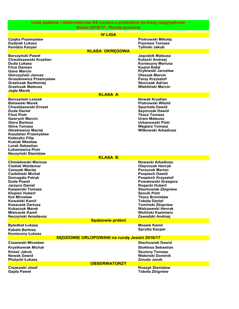 Lista sędziów i obserwatorów KS Leszno z podziałem na klasy rozgrywkowe Sezon 2016/17 - Runda jesienna IV LIGA Czajka Przemysław Dudziak Łukasz Kendzia Kacper KLASA OKRĘGOWA Barczyński Paweł Chwaliszewski Krystian Duda Łukasz Filuś Damian Gano Marcin Gierczyński Janusz Gruszkiewicz Przemysław Grzelczak Bartłomiej Grzelczak Mateusz Jagła Marek Piotrowski Mikołaj Poprawa Tomasz Tyliński Jakub Jagodzik Mateusz Kołacki Andrzej Konieczny Mariusz Kozioł Rafał Kryłowski Jarosław Oleszak Marcin Parzy Krzysztof Skorczak Adrian Wlekliński Marcin KLASA A Barczyński Leszek Bielawski Marek Chwaliszewski Ernest Duda Daniel Filuś Piotr Gawrych Marcin Giera Bartosz Glina Tomasz Głoskiewicz Maciej Kasztelan Przemysław Kołeczko Filip Kubiak Wiesław Lorek Sebastian Łukasiewicz Piotr Neczyński Stanisław Nowak Krystian Piotrowski Witold Spychała Dawid Szymczak Dawid Tkacz Tomasz Uram Mateusz Urbanowski Piotr Węglarz Tomasz Witkowski Arkadiusz KLASA B Chmielewski Mariusz Cieślak Waldemar Czeszak Maciej Ćwikliński Michał Domagała Patryk Duda Paweł Jarzyna Daniel Kasperski Tomasz Klupieć Hubert Kot Mirosław Kowalski Kamil Kozaczek Dariusz Kubaczyk Marek Mielcarek Kamil Neczyński Amadeusz Byledbał Łukasz Kabała Bartosz Konieczny Łukasz Sędziowie próbni Nowacki Arkadiusz Olejniczak Henryk Porzucek Marian Pospiech Dawid Pospiech Krzysztof Powałowski Grzegorz Rogacki Hubert Stachowiak Zbigniew Szocik Piotr Tkacz Bronisław Toboła Daniel Tomiński Zbigniew Walczewski Henryk Woliński Kazimierz Zawadzki Andrzej Mosiek Kamil Sprutta Kacper SĘDZIOWIE URLOPOWANI na rundę Jesień 2016/17 Ciszewski Mirosław Krystkowiak Michał Kmieć Jakub Nowak Dawid Płużycki Łukasz Stachowiak Dawid Stokłosa Sebastian Szumny Tomasz Waleński Dominik Zmuda Jacek OBSERWATORZY Ciszewski Józef Gajda Paweł Roszyk Stanisław Toboła Zbigniew