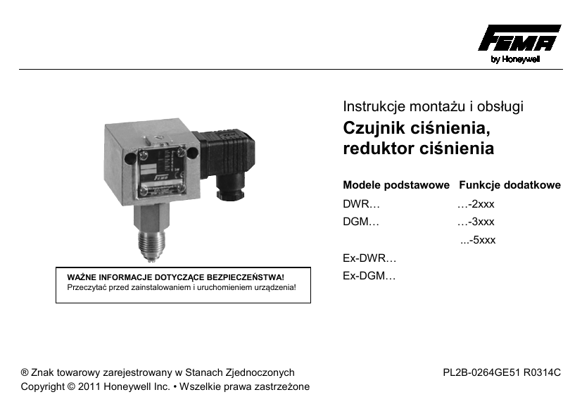 Instrukcje montażu i obsługi Czujnik ciśnienia, reduktor ciśnienia Modele podstawowe Funkcje dodatkowe DWR… …-2xxx DGM… …-3xxx ...-5xxx Ex-DWR… WAŻNE INFORMACJE DOTYCZĄCE BEZPIECZEŃSTWA! Przeczytać przed zainstalowaniem i uruchomieniem urządzenia! ® Znak towarowy zarejestrowany w Stanach Zjednoczonych Copyright © 2011 Honeywell Inc. • Wszelkie prawa zastrzeżone Ex-DGM… PL2B-0264GE51 R0314C Charakterystyka Charakterystyka Zastosowanie Para wodna, gorąca woda, zgodnie z TRBS i DIN EN 12828 Paliwo gazowe, zgodnie z DVGW arkusz G260 Paliwa ciekłe, np. olej pędny Normy badawcze dla DWR VdTÜV Druck 100, EN 12952-11, EN 12953-9 DIN EN 764-7 w nawiązaniu do EN 161, jeśli chodzi o zgodność materiałów EN 13611, DIN EN 1854 Dyrektywy unijne Normy badawcze dla DGM EN 13611, DIN EN 1854 Dyrektywy unijne EU/2009/142/EC (GAD) EU/94/9/EC (ATEX) Zadanie Czujnik i reduktor ciśnienia (z blokadą wewnętrzną) Dla maksymalnej i minimalnej funkcji przełącznika Czujnik Konstrukcja specjalna, 2 mln cykli przełączania EU 97/23 EC (PED) EU 94/9 EC (ATEX) 30 PL2B-0264GE51 R0314C Kod typu Obudowy przełącznika Kod typu Wersja podstawow a DWR XXX Wersja z funkcją dodatkową DWR XXX-YYY Wersja Ex-d Wersja Ex-i Ex-DWR XXX DWRXXX -5xx DWR Identyfikator serii XXX Identyfikator zakresu ciśnienia YYY Identyfikator funkcji dodatkowej Ex- Identyfikator wersji Ex-d ...-5xx Identyfikator wersji Ex-i Kod typu odnosi się również częściowo do serii DGM… nie wszystkie Ważna uwaga: technicznie możliwe kombinacje modeli znajdują się w naszych zapasach. Z tego powodu zalecamy skontaktowanie się z nami przed złożeniem zamówienia celem uzyskania pomocy przy doborze modeli najlepiej nadających się do wybranego zastosowania. PL2B-0264GE51 R0314C DWR XXX Obudowa wtyku (200) DWR XXX-2… (Wtyk do DIN EN 175301) Obudowa połączenia terminalowego (300) Obudowa połączenia terminalowego (500) Urządzenie przełączające typu Ex (700) DWR XXX-3… DWR XXX-5… Ex-DWR… Ważna uwaga Przełączniki ciśnienia to precyzyjne przyrządy, skonfigurowane i wyregulowane w fabryce. Nie należy więc otwierać urządzenia ani zmieniać ustawień lakierowanych śrub regulacyjnych. Punkty przełączania mogą ulec zmianie — niezbędne będzie ponowna regulacja. 31 Ważne informacje dotyczące bezpieczeństwa Ważne informacje dotyczące bezpieczeństwa Prosimy o przeczytanie poniższych informacji przed przystąpieniem do montażu i oddaniem do użytkowania Montaż i obsługa Montaż czujników ciśnienia może zostać przeprowadzony wyłącznie przez przeszkolony personel (branża elektryczna/hydrauliczna/mechaniczna), w oparciu o instrukcje montażowe oraz obowiązujące przepisy prawne. Te urządzenia należy instalować (połączenie mechaniczne, ciśnieniowe) tyko na materiałach dopasowanych elektrochemicznie. W przeciwnym wypadku istnieje ryzyko uszkodzenia materiałów bazowych przez korozję stykową. Wynikiem tego może być utrata stabilności i wycieki. 32 Należy zachować ostrożność podczas dotykania urządzenia — istnieje ryzyko poparzenia. Urządzenie może osiągnąć średnią temperaturę rzędu 70°C. Ryzyko zamarzania przy pracy z materiałami przy temperaturze do – 20°C. Nie należy otwierać skrzynki przewodów ani wtyczki. Nie należy również usuwać śrub zaciskowych, dopóki urządzenie nie przejdzie w stan spoczynku. PL2B-0264GE51 R0314C Instrukcje dotyczące bezpieczeństwa Instrukcje dotyczące bezpieczeństwa Urządzenia z serii DWR zostały zaprojektowane jako czujniki ciśnienia dla gazów zgodnie z DVGW, arkusz G260, dla paliw ciekłych (np. olej grzewczy EL) oraz dla systemów pary wodnej i gorącej wody zgodnie z TRBS i DIN 4751, część 2. Urządzenia serii DGM zostały zaprojektowane i zatwierdzone dla gazów zgodnie z DVGW, arkusz G260, i kryteriami w zakresie szczelności ustanowionymi w normie EN 1854. Urządzenie to musi być stosowane wyłącznie w zakresach elektrycznych, hydraulicznych i termicznych określonych w arkuszu danych. PL2B-0264GE51 R0314C Obciążenia impedancyjne mogą spowodować oparzenia lub przepalenie styków. Stosowanie środków zapobiegawczych leży w zakresie odpowiedzialności klienta. Środkiem takim może być użycie członów RC. W przypadku stosowania wersji ZF 1979 (bezolejowa i bezsmarowa), należy starać się uniknąć zanieczyszczenia powierzchni będących w kontakcie z materiałami (począwszy od otwarcia opakowania, aż po zakończenie montażu). Nie przewiduje się odpowiedzialności za wersję bezolejową i bezsmarową. Będące w kontakcie z materiałami wysokiej jakości części czujnika wykonane ze stali nierdzewnej pozwalają na stosowanie tych urządzeń z szeroką gamą materiałów. Przed dokonaniem wyboru NIEZBĘDNE jest jednak przeprowadzenie testu odporności chemicznej. 33 Instrukcje dotyczące bezpieczeństwa Nie zezwala się na stosowanie z kwasami czy też innymi agresywnymi substancjami, takimi jak kwas fluorowodorowy, chlorek miedzi, woda królewska czy nadtlenek wodoru. Nie zezwala się na stosowanie w systemach zawierających niestabilne gazy lub ciecze, takie jak cyjanowodór, acetylen rozpuszczony lub NOx. Urządzenia należy chronić przed promieniami słonecznymi oraz deszczem. Przełączniki ciśnieniowe są urządzeniami precyzyjnymi, kalibrowanymi fabrycznie. Nie należy otwierać urządzenia ani zmieniać ustawień lakierowanych śrub regulacyjnych. Należy chronić przełącznik ciśnieniowy przed nadmiernymi wibracjami, 34 np. izolując go mechanicznie lub stosując inne środki zabezpieczające przed wibracjami. Silnie zanieczyszczone materiały mogą spowodować zatkanie czujnika oraz błędy i/lub jego nieprawidłowe działanie. Jeśli sprzęt jest stosowany do tego celu, niezbędne jest zastosowanie odpowiednich uszczelnień chemicznych. Czujniki ciśnienia oraz uszczelki chemiczne tworzą jednostkę funkcjonalną i nie można ich rozdzielać. Przed rozmontowaniem