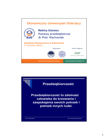 Ekonomiczny Uniwersytet Dziecięcy Rekiny biznesu Postawy przedsiębiorcze dr Piotr Wachowiak Akademia Ekonomiczna w Katowicach 21 września 2009 r. www.uniwersytet-dzieciecy.pl EKONOMICZNY UNIWERSYTET DZIECIĘCY WWW.UNIWERSYTET-DZIECIECY.PL Przedsiębiorczość Przedsiębiorczość to zdolność człowieka do kreowania i zaspokajania swoich potrzeb i potrzeb innych ludzi. © Piotr Wachowiak www.uniwersytet-dzieciecy.pl 1 Człowiek przedsiębiorczy Człowiek przedsiębiorczy to taki, który w każdych warunkach – jakie stwarza mu otoczenie – potrafi dostrzegać i realizować swoje potrzeby i potrzeby innych. © Piotr Wachowiak www.uniwersytet-dzieciecy.pl Otoczenie, w którym działa człowiek Człowiek działa w otoczeniu turbulentnym, w którym zmiany zachodzą bardzo gwałtownie i są trudne do przewidzenia. Zmiany należy traktować jak szanse dla rozwoju. © Piotr Wachowiak www.uniwersytet-dzieciecy.pl 2 Źródło zachowań przedsiębiorczych Głównym źródłem zachowań przedsiębiorczych jest innowacyjność, którą powinien się charakteryzować każdy człowiek. Innowacyjność polega na poszukiwaniu nowych dróg, możliwości i rozwiązań. Innowacyjność powinna być procesem ciągłym. © Piotr Wachowiak www.uniwersytet-dzieciecy.pl Zachowanie przedsiębiorcze Zachowując się, w sposób przedsiębiorczy należy postępować etycznie. © Piotr Wachowiak www.uniwersytet-dzieciecy.pl 3 Jakie cechy powinien posiadać przedsiębiorca? Potrzeba osiągnięcia czegoś znaczącego. Zachowanie kontroli nad własnym losem. Skłonność do ryzyka. Wiara we własne siły. Kreatywne myślenie. Umiejętność myślenia pozytywnego. Umiejętność wyznaczania celów. Umiejętność podejmowania decyzji. © Piotr Wachowiak www.uniwersytet-dzieciecy.pl Własny biznes Człowiek przedsiębiorczy powinien zakładać własny biznes. Argumenty przemawiające za założeniem własnego biznesu: Satysfakcja z pracy na swoim. Osiągnie sukcesów własnymi siłami. Szansa na duże pieniądze. Szansa na spełnienie się. © Piotr Wachowiak www.uniwersytet-dzieciecy.pl 4 Przedsiębiorcy © Piotr Wachowiak Andrzej Blikle Henry Ford Irena Eris Bill Gates Zbigniew Grycan www.uniwersytet-dzieciecy.pl Podsumowanie Kluczem do zachowań przedsiębiorczych jest posiadanie: - wizji, - wiedzy, - chęci do działania. Jest to bardzo ciężka praca. © Piotr Wachowiak www.uniwersytet-dzieciecy.pl 5 Przedsiębiorczości można się nauczyć! © Piotr Wachowiak www.uniwersytet-dzieciecy.pl 6
