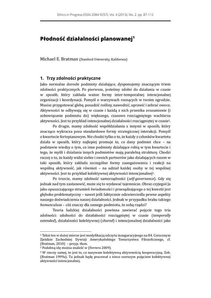 Ethics in Progress (ISSN 2084-9257). Vol. 4 (2013). No. 2. pp. 87-112 Płodność działalności planowanej1 Michael E. Bratman (Stanford University, Kalifornia) 1. Trzy zdolności praktyczne Jako normalne dorosłe podmioty działające, dysponujemy znaczącym triem zdolnosci praktycznych. Po pierwsze, jestesmy zdolni do działania w czasie w sposob, ktory zakłada wazne formy inter-temporalnej intencjonalnej organizacji i koordynacji. Pomysl o warzywach rosnących w twoim ogrodzie. Musisz przygotowac glebę, posadzic rosliny, nawodnic, uprawic i zebrac owoce. Aktywnosci te odbywają się w czasie i kazdą z nich przenika zrozumienie (i zobowiązanie podmiotu do) większego, czasowo rozciągniętego wachlarza aktywnosci. Jest to przykład intencjonalnej działalnosci rozciągniętej w czasie2. Po drugie, mamy zdolnosc wspołdziałania z innymi w sposob, ktory znacząco wykracza poza standardowe formy strategicznej interakcji. Pomysl o kwartecie fortepianowym. Nie chodzi tylko o to, ze kazdy z członkow kwartetu działa w sposob, ktory najlepiej promuje to, co dany podmiot chce – na podstawie wiedzy o tym, co inne podmioty działające robią w tym kwartecie i tego, ze mysli i działania innych podmiotow mają paralelną strukturę. Chodzi raczej o to, ze kazdy widzi siebie i swoich partnerow jako działających razem w taki sposob, ktory zakłada szczegolne formy zaangazowania i reakcji na wspolną aktywnosc, jak rowniez – na udział kazdej osoby w tej wspolnej aktywnosci. Jest to przykład kolektywnej aktywnosci intencjonalnej3. Po trzecie, mamy zdolnosc samorządnosci (self-governance). Gdy się jednak nad tym zastanowic, moze się to wydawac tajemnicze. Obraz czyjegos Ja jako opuszczającego strumien swiadomosci i przesądzającego o tej kwestii jest głęboko problematyczny – nawet jesli faktycznie odzwierciedla pewne aspekty naszego doswiadczenia naszej działalnosci. Jednak w przypadku braku takiego homunculusa – coz znaczy dla samego podmiotu, ze sobą rządzi? Teoria ludzkiej działalnosci powinna zawierac pojęcie tego tria zdolnosci: zdolnosci do działalnosci rozciągniętej w czasie (temporally extended), działalnosci kolektywnej (shared) i intencjonalnej działalnosci jako Tekst ten w duzej mierze jest modyfikacją odczytu inauguracyjnego na 84. Corocznym Zjezdzie Zachodniej Dywizji Amerykanskiego Towarzystwa Filozoficznego, cf. (Bratman, 2010) – przyp. tłum. 2 Podobną idę mozna znalezc w (Ferrero 2009). 3 W rzeczy samej, to jest to, co nazywam kolektywną aktywnoscią kooperacyjną. Zob. (Bratman 1999a). Tu jednak będę pracował z nieco szerszym pojęciem kolektywnej aktywnosci intencjonalnej. 1 Płodność działalności planowanej samorządnosci (self-governed intentional agency). W kazdym przypadku mamy trzy wzajemnie powiązane sprawy. Po pierwsze, chcemy wiedziec, jakie pojęcia najlepiej wspierają nasze teoretyczne rozumienie tych fenomenow. Po drugie, chcemy zrozumiec, jak to jest, ze urzeczywistniamy te zdolnosci. Po trzecie, chcemy zrozumiec szczegolne aspekty normatywne tych zdolnosci. Nasze zainteresowania mają więc charakter pojęciowy, metafizyczny i normatywny. Moją odpowiedzią na te kwestie ma byc proba zrozumienia tych trzech zdolnosci praktycznych poprzez odwołanie do wspolnej, zasadniczej zdolnosci do indywidualnej działalnosci planowanej. Ta zasadnicza zdolnosc planowania sama wystarcza do bycia zdolnym do rozciągniętej w czasie działalnosci intencjonalnej. Co więcej, gdy ją odpowiednio uzupełnimy, ta zasadnicza zdolnosc wystarcza do bycia zdolnym do kolektywnej działalnosci intencjonalnej i działalnosci jako samorządnosci. Te srodki uzupełniające stanowią w duzej mierze ciągłosc względem srodkow, ktorymi dysponujemy w ramach naszej teorii indywidualnej działalnosci planowanej. W ten sposob tworzymy pomost między srodkami pojęciowymi, metafizycznymi i normatywnymi dla modelu naszej indywidualnej działalnosci planowanej a pojęciowymi, metafizycznymi i normatywnymi srodkami adekwatnymi dla modelu kazdej z tria zdolnosci praktycznych, ktore wymienilismy. Artykułujemy przeto struktury działalnosci planowanej, ktore wystarczają dla zasadniczych przypadkow działalnosci rozciągniętej w czasie, działalnosci kolektywnej i działalnosci jako intencjonalnej samorządnosci. Hipoteza płodnosci działalnosci planowanej jest taka, ze owo trio ludzkich zdolnosci praktycznych – a byc moze innych rowniez4 – jest w ten sposob ugruntowane w naszej zdolnosci do działalnosci planowanej5. 2. Myślenie praktyczne i czas Nie wszystkie podmioty działające są podmiotami planującymi. Mogą istniec podmioty zorientowane na cel, ktore nie strukturyzują swoich mysli i działania w czasie poprzez planowanie. Psy i bardzo młode dzieci są tu przykładami. Takie podmioty angazują się w aktywnosc zorientowaną na cel, w ktorej ich zachowanie sledzi cel – powiedzmy, otrzymanie łyka wody. Moze to zakładac złozoną plastycznosc reagowania – spragniony pies moze odpowiednio zareagowac na twoje podsunięcie miski z wodą. Zdaje się jednak nieprawdopodobne, ze pies, czy 15-miesięczny człowiek, okresla plany dla Allan Gibbard rozpatruje naszą zdolnosc do działalnosci planowanej jako podstawę myslenia normatywnego (Gibbard 2003). Scott Shapiro traktuje zas prawo jako ugruntowane w naszych zdolnosciach planowania. (Shapiro 2011). Zarowno Gibbard jak i Shapiro mierzą w ten sposob w rozszerzenie płodnosci działalnosci planowanej. 5 (Bratman 2010). Kluczowy jest tu wymog zagwarantowania warunkow wystarczających dla zasadniczych przypadkow tych form ludzkiej działalnosci. Hipoteza płodnosci działalnosci pozostawia otwartą mozliwosc wielu takich warunkow wystarczających. 4 88 Michael E. Bratman okresu rozciągniętego w czasie i mysli o swoim zachowaniu i organizuje je w czasie pod kątem tych planow. Oczywiscie, czy pies lub młode dziecko organizuje (lub nie) swoje mysli i działania w ten planowo okreslony (planinfu