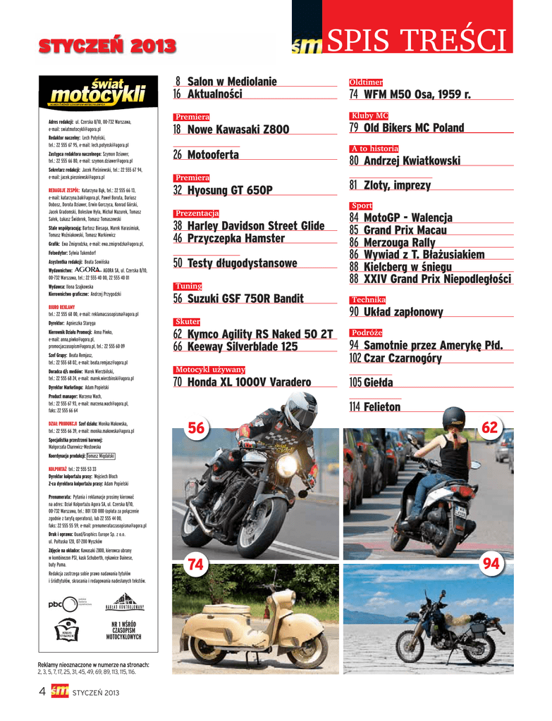 SPIS TREŚCI STYCZEŃ 2013 8 Salon w Mediolanie 16 Aktualności Adres redakcji: ul. Czerska 8/10, 00-732 Warszawa, e-mail: [email protected] Redaktor naczelny: Lech Potyński, tel.: 22 555 67 95, e-mail: [email protected] Zastępca redaktora naczelnego: Szymon Dziawer, tel.: 22 555 66 80, e-mail: [email protected] Sekretarz redakcji: Jacek Pieśniewski, tel.: 22 555 67 94, e-mail: [email protected] REDAGUJE ZESPÓŁ: Katarzyna Bąk, tel.: 22 555 66 13, e-mail: [email protected], Paweł Boruta, Dariusz Dobosz, Dorota Dziawer, Erwin Gorczyca, Konrad Górski, Jacek Gradomski, Bolesław Hyła, Michał Mazurek, Tomasz Sałek, Łukasz Świderek, Tomasz Tomaszewski Stale współpracują: Bartosz Biesaga, Marek Harasimiuk, Tomasz Woźniakowski, Tomasz Markiewicz Grafik: Ewa Żmigrodzka, e-mail: [email protected], Fotoedytor: Sylwia Tukendorf Asystentka redakcji: Beata Sowińska Wydawnictwo: AGORA SA, ul. Czerska 8/10, 00-732 Warszawa, tel.: 22 555 40 00, 22 555 40 01 Wydawca: Ilona Szajkowska Kierownictwo graficzne: Andrzej Przygodzki BIURO REKLAMY tel.: 22 555 68 00, e-mail: [email protected] Premiera 18 Nowe Kawasaki Z800 zzvvsssssssss 26 Motooferta Premiera 32 Hyosung GT 650P Prezentacja 38 Harley Davidson Street Glide 46 Przyczepka Hamster zzvvsssssssss 50 Testy długodystansowe Tuning 56 Suzuki GSF 750R Bandit Skuter Dyrektor: Agnieszka Staręga Kierownik Działu Promocji: Anna Piwko, e-mail: anna,[email protected], [email protected], tel.: 22 555 60 09 62 Kymco Agility RS Naked 50 2T 66 Keeway Silverblade 125 Szef Grupy: Beata Remjasz, tel.: 22 555 68 02, e-mail: [email protected] Doradca d/s mediów: Marek Wierzbiński, tel.: 22 555 68 24, e-mail: [email protected] Dyrektor Marketingu: Adam Popielski Motocykl używany 70 Honda XL 1000V Varadero Product manager: Marzena Wach, tel.: 22 555 67 93, e-mail: [email protected], faks: 22 555 66 64 DZIAŁ PRODUKCJI Szef działu: Monika Makowska, tel.: 22 555 66 39, e-mail: [email protected] Oldtimer 74 WFM M50 Osa, 1959 r. Kluby MC 79 Old Bikers MC Poland A to historia 80 Andrzej Kwiatkowski zzvvssssssssvvvs 81 Zloty, imprezy Sport 84 85 86 86 88 88 MotoGP - Walencja Grand Prix Macau Merzouga Rally Wywiad z T. Błażusiakiem Kielcberg w śniegu XXIV Grand Prix Niepodległości Technika 90 Układ zapłonowy Podróże 94 Samotnie przez Amerykę Płd. 102 Czar Czarnogóry zzvvzvcz 105 Giełda zzvvsssvcz 114 Felieton 56 62 74 94 Specjalistka przestrzeni barwnej: Małgorzata Charewicz-Mostowska Koordynacja produkcji: Tomasz Migdalski KOLPORTAŻ tel.: 22 555 53 33 Dyrektor kolportażu prasy: Wojciech Błoch Z-ca dyrektora kolportażu prasy: Adam Popielski Prenumerata: Pytania i reklamacje prosimy kierować na adres: Dział Kolportażu Agora SA, ul. Czerska 8/10, 00-732 Warszawa, tel.: 801 130 000 (opłata za połączenie zgodnie z taryfą operatora), lub 22 555 44 00, faks: 22 555 55 59, e-mail: [email protected] Druk i oprawa: Quad/Graphics Europe Sp. z o.o. ul. Pułtuska 120, 07-200 Wyszków Zdjęcie na okładce: Kawasaki Z800, kierowca ubrany w kombinezon PSI, kask Schuberth, rękawice Dainese, buty Puma. Redakcja zastrzega sobie prawo nadawania tytułów i śródtytułów, skracania i redagowania nadesłanych tekstów. NR 1 WŚRÓD CZASOPISM MOTOCYKLOWYCH Reklamy nieoznaczone w numerze na stronach: 2, 3, 5, 7, 17, 25, 31, 45, 49, 69, 89, 113, 115, 116. 4 STYCZEŃ 2013