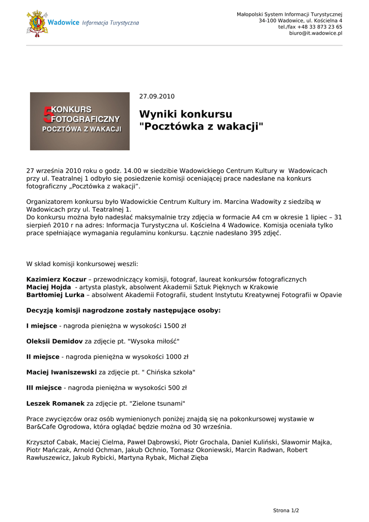 Małopolski System Informacji Turystycznej 34-100 Wadowice, ul. Kościelna 4 tel./fax +48 33 873 23 65 [email protected] 27.09.2010 Wyniki konkursu "Pocztówka z wakacji" 27 września 2010 roku o godz. 14.00 w siedzibie Wadowickiego Centrum Kultury w Wadowicach przy ul. Teatralnej 1 odbyło się posiedzenie komisji oceniającej prace nadesłane na konkurs fotograficzny „Pocztówka z wakacji”. Organizatorem konkursu było Wadowickie Centrum Kultury im. Marcina Wadowity z siedzibą w Wadowicach przy ul. Teatralnej 1. Do konkursu można było nadesłać maksymalnie trzy zdjęcia w formacie A4 cm w okresie 1 lipiec – 31 sierpień 2010 r na adres: Informacja Turystyczna ul. Kościelna 4 Wadowice. Komisja oceniała tylko prace spełniające wymagania regulaminu konkursu. Łącznie nadesłano 395 zdjęć. W skład komisji konkursowej weszli: Kazimierz Koczur – przewodniczący komisji, fotograf, laureat konkursów fotograficznych Maciej Hojda - artysta plastyk, absolwent Akademii Sztuk Pięknych w Krakowie Bartłomiej Lurka – absolwent Akademii Fotografii, student Instytutu Kreatywnej Fotografii w Opavie Decyzją komisji nagrodzone zostały następujące osoby: I miejsce - nagroda pieniężna w wysokości 1500 zł Oleksii Demidov za zdjęcie pt. "Wysoka miłość" II miejsce - nagroda pieniężna w wysokości 1000 zł Maciej Iwaniszewski za zdjęcie pt. " Chińska szkoła" III miejsce - nagroda pieniężna w wysokości 500 zł Leszek Romanek za zdjęcie pt. "Zielone tsunami" Prace zwycięzców oraz osób wymienionych poniżej znajdą się na pokonkursowej wystawie w Bar&Cafe Ogrodowa, która oglądać będzie można od 30 września. Krzysztof Cabak, Maciej Cielma, Paweł Dąbrowski, Piotr Grochala, Daniel Kuliński, Sławomir Majka, Piotr Mańczak, Arnold Ochman, Jakub Ochnio, Tomasz Okoniewski, Marcin Radwan, Robert Rawłuszewicz, Jakub Rybicki, Martyna Rybak, Michał Zięba Strona 1/2 Małopolski System Informacji Turystycznej 34-100 Wadowice, ul. Kościelna 4 tel./fax +48 33 873 23 65 [email protected] Strona 2/2 Powered by TCPDF (www.tcpdf.org)