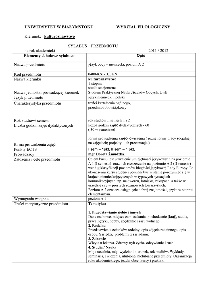 UNIWERSYTET W BIAŁYMSTOKU WYDZIAŁ FILOLOGICZNY Kierunek: kulturoznawstwo SYLABUS na rok akademicki Elementy składowe sylabusu PRZEDMIOTU 2011 / 2012 Opis Nazwa przedmiotu język obcy – niemiecki, poziom A 2 Kod przedmiotu Nazwa kierunku 0400-KS1-1LEKN kulturoznawstwo I stopnia studia stacjonarne Studium Praktycznej Nauki Języków Obcych, UwB język niemiecki i polski Nazwa jednostki prowadzącej kierunek Język przedmiotu Charakterystyka przedmiotu Rok studiów/ semestr Liczba godzin zajęć dydaktycznych forma prowadzenia zajęć Punkty ECTS Prowadzący Założenia i cele przedmiotu Wymagania wstępne Treści merytoryczne przedmiotu treści kształcenia ogólnego, przedmiot obowiązkowy rok studiów I, semestr 1 i 2 liczba godzin zajęć dydaktycznych - 60 ( 30 w semestrze) forma prowadzenia zajęć- ćwiczenia ( różne formy pracy socjalnej na zajęciach; projekty i ich prezentacje ) I sem – 1pkt, II sem – 1 pkt, mgr Dorota Żmudzka. Celem kursu jest utrwalenie umiejętności językowych na poziomie A 1 (I semestr) oraz ich rozszerzenie na poziomie A 2 (II semestr) według klasyfikacji poziomów biegłości językowej Rady Europy. Po ukończeniu kursu studenci powinni być w stanie porozumieć się w krajach niemieckojęzycznych w typowych sytuacjach komunikacyjnych, np. na dworcu, lotnisku, zakupach, a także w urzędzie czy w prostych rozmowach towarzyskich. Poziom A 2 oznacza osiągnięcie dobrej znajomości języka w stopniu elementarnym. poziom A 1 Tematyka: 1. Przedstawianie siebie i innych Dane osobowe, miejsce zamieszkania, pochodzenie (kraj), studia, praca, języki, hobby, spędzanie czasu wolnego. 2. Rodzina Przedstawienie członków rodziny, opis zdjęcia rodzinnego, opis osoby. Sąsiedzi, problemy z sąsiadami. 3. Zdrowie Wizyta u lekarza. Zdrowy tryb życia- odżywianie i ruch. 4. Studia / Nauka Moja uczelnia, mój wydział i kierunek, rok studiów. Wykłady, seminaria, ćwiczenia, ulubione/ nielubiane przedmioty. Organizacja roku akademickiego, języki obce, kursy i praktyki. Forma i warunki zaliczenia przedmiotu Wykaz literatury podstawowej i uzupełniającej 5. Podróże Przygotowanie podróży, plan podróży prywatnej i służbowej. Rozkłady jazdy pociągów i autobusów. Rezerwacja pokoju w hotelu. Prospekt / spot reklamowy. Opis widoku z okna pociągu/samochodu. Opis pogody. 6. Czas wolny Zainteresowania, sport w różnych porach roku. Bierne i aktywne spędzanie wolnego czasu. Kluby i stowarzyszenia. Nazwy potraw i artykułów spożywczych. Restauracja (menu, zamawianie, płacenie). Poznawanie ludzi, kontakty towarzyskie. 7. Mieszkanie Szukanie mieszkania, ogłoszenia mieszkaniowe. Opis mieszkania i jego okolicy. Przeprowadzka, wypadek podczas przeprowadzki i w domu, pierwsza pomoc. 8. Zakupy / Handel Działy w supermarkecie i domu handlowym. Nazwy produktów. Szukanie porady u sprzedawcy, przymierzanie. 9. Kultura / Rozrywka Wydarzenia kulturalne w moim mieście. Wyjście do teatru, kina, na koncert. 10. Praca. Wykształcenie, przekwalifikowanie się. Zawód – dotychczasowe doświadczenia , oczekiwania na przyszłość. Poszukiwanie pracy, ogłoszenia o zatrudnieniu, pisanie życiorysu. Oficjalne rozmowy telefoniczne. Formy grzecznościowe. 1. systematyczny i aktywny udział w zajęciach oraz zaliczenie nieobecności w trybie ustalonym przez lektora ( ocenianie ciągłe ) 2. pozytywne oceny z testów cząstkowych, semestralnych i egzaminu 3. zaliczenie egzaminu pisemnego i ustnego 4. praca nad projektami oraz ich prezentacja podczas zajęć Literatura podstawowa: “studio d A 2”, wydawnictwo Cornelsen Literatura uzupełniająca: “Berliner Platz” 1,2, 3 , wydawnictwo Langenscheidt „Übungsgrammatik Sequenzen” , DaF, wydawnictwo Cornelsen „Klipp und klar” – gramatyka języka niemieckiego z ćwiczeniami, wydawnictwo LektorKlett Dorota Żmudzka podpis osoby składającej