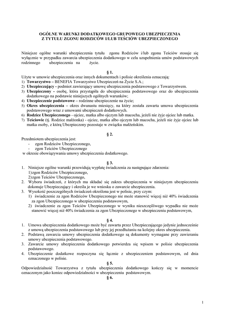 OGÓLNE WARUNKI DODATKOWEGO GRUPOWEGO UBEZPIECZENIA Z TYTUŁU ZGONU RODZICÓW I/LUB TEŚCIÓW UBEZPIECZONEGO Niniejsze ogólne warunki ubezpieczenia tytułu zgonu Rodziców i/lub zgonu Teściów stosuje się wyłącznie w przypadku zawarcia ubezpieczenia dodatkowego w celu uzupełnienia umów podstawowych rodzinnego ubezpieczenia na Ŝycie. § 1. UŜyte w umowie ubezpieczenia oraz innych dokumentach i polisie określenia oznaczają: 1) Towarzystwo – BENEFIA Towarzystwo Ubezpieczeń na śycie S.A.; 2) Ubezpieczający - podmiot zawierający umowę ubezpieczenia podstawowego z Towarzystwem. 3) Ubezpieczony - osobę, która przystąpiła do ubezpieczenia podstawowego oraz do ubezpieczenia dodatkowego na podstawie niniejszych ogólnych warunków; 4) Ubezpieczenie podstawowe – rodzinne ubezpieczenie na Ŝycie; 5) Okres ubezpieczenia – okres dwunastu miesięcy, na który została zawarta umowa ubezpieczenia podstawowego wraz z umowami ubezpieczeń dodatkowych. 6) Rodzice Ubezpieczonego - ojciec, matka albo ojczym lub macocha, jeŜeli nie Ŝyje ojciec lub matka. 7) Teściowie (tj. Rodzice małŜonka) - ojciec, matka albo ojczym lub macocha, jeŜeli nie Ŝyje ojciec lub matka osoby, z którą Ubezpieczony pozostaje w związku małŜeńskim. § 2. Przedmiotem ubezpieczenia jest: - zgon Rodziców Ubezpieczonego, - zgon Teściów Ubezpieczonego w okresie obowiązywania umowy ubezpieczenia dodatkowego. § 3. 1. Niniejsze ogólne warunki przewidują wypłatę świadczenia za następujące zdarzenia: 1) zgon Rodziców Ubezpieczonego, 2) zgon Teściów Ubezpieczonego, 2. Wyboru świadczeń, z których ma składać się zakres ubezpieczenia w niniejszym ubezpieczeniu dokonuje Ubezpieczający i określa je we wniosku o zawarcie ubezpieczenia. 3. Wysokość poszczególnych świadczeń określona jest w polisie, przy czym: 1) świadczenie za zgon Rodziców Ubezpieczonego nie moŜe stanowić więcej niŜ 40% świadczenia za zgon Ubezpieczonego w ubezpieczeniu podstawowym, 2) świadczenie za zgon Teściów Ubezpieczonego w wyniku nieszczęśliwego wypadku nie moŜe stanowić więcej niŜ 40% świadczenia za zgon Ubezpieczonego w ubezpieczeniu podstawowym, § 4. 1. Umowa ubezpieczenia dodatkowego moŜe być zawarta przez Ubezpieczającego jedynie jednocześnie z umową ubezpieczenia podstawowego lub przy jej przedłuŜaniu na kolejny okres ubezpieczenia. 2. Podstawą zawarcia umowy ubezpieczenia dodatkowego są dokumenty wymagane przy zawieraniu umowy ubezpieczenia podstawowego. 3. Zawarcie umowy ubezpieczenia dodatkowego potwierdza się wpisem w polisie ubezpieczenia podstawowego. 4. Ubezpieczenie dodatkowe rozpoczyna się łącznie z ubezpieczeniem podstawowym, od dnia oznaczonego w polisie. § 5. Odpowiedzialność Towarzystwa z tytułu ubezpieczenia dodatkowego kończy się w momencie oznaczonym jako koniec odpowiedzialności w ubezpieczeniu podstawowym. § 6. 1 1. Wysokość składki ustala się oddzielnie dla kaŜdego ze świadczeń wymienionych w § 3 ust. 1 niniejszych ogólnych warunków. Wysokość składki ustala się na zasadach określonych w § 13 ubezpieczenia podstawowego. 2. Wysokość składki oraz wysokość świadczeń pozostaje niezmienna w trakcie trwania okresu ubezpieczenia. 3. Zmiana składki i zakresu ubezpieczenia moŜe być dokonana przy przedłuŜaniu umowy ubezpieczenia o kolejny okres ubezpieczenia. Propozycja zmian moŜe być przedstawiona przez kaŜda ze stron, najpóźniej na 30 dni przed końcem okresu ubezpieczenia. 4. Terminy opłacania składki dla ubezpieczenia dodatkowego są takie same jak dla ubezpieczenia podstawowego i określone są w polisie. § 7. 1. Występując do Towarzystwa o świadczenie z tytułu umowy ubezpieczenia dodatkowego Ubezpieczony powinien dołączyć do wniosku: a) akt zgonu Rodzica lub teścia, b) zaświadczenie o przyczynie zgonu, c) kopię dowodu osobistego. 2. Terminy wypłaty świadczeń są identyczne jak dla świadczeń wypłacanych z ubezpieczenia podstawowego. 3. Świadczenia z ubezpieczenia dodatkowego wypłacane są Ubezpieczonemu. § 8. 1. FIAT Ubezpieczenia śyciowe S.A. nie ponosi odpowiedzialności w razie zgonu Rodzica lub Teścia wskutek: - działań wojennych, - wyniku popełnienia lub usiłowania popełnienia przez niego przestępstwa, - masowych rozruchów społecznych, - działania w stanie po uŜyciu alkoholu, zaŜyciu narkotyków lub innych środków odurzających, z wyjątkiem tych sytuacji, gdy spoŜycie tych środków nastąpiło zgodnie z zaleceniami lekarza, - zatrucia spowodowanego spoŜywaniem alkoholu, uŜywaniem narkotyków lub innych środków odurzających, - prowadzenia pojazdu mechanicznego lub innego pojazdu przez wyŜej wymienionego nie posiadającego odpowiedniego prawa jazdy lub innego dokumentu uprawniającego do prowadzenia danego pojazdu (określonego w kodeksie drogowym), - wyczynowego uprawiania sportu, za który uwaŜa się uprawianie dyscyplin sportowych w ramach sekcji lub klubów sportowych albo w celach zarobkowych, jak równieŜ uczestniczenia w wyprawach/wyjazdach do miejsc charakteryzujących się ekstremalnymi warunkami klimatycznymi lub przyrodniczymi, - popełnieniem samobójstwa, przed upływem dwóch lat od daty przystąpienia Ubezpieczonego do ubezpieczenia. 2. Świadczenie nie przysługuje Ubezpieczonemu, który czynem niedozwolonym, stwierdzonym przez Sąd, spowodował zgon Rodzica lub Teścia. § 9. W sprawach nie uregulowanych w niniejszych ogólnych warunkach mają zastosowanie ogólne warunki ubezpieczenia podstawowego, przepisy Kodeksu cywilnego oraz ustawy z dnia 22 maja 2003 roku o działalności ubezpieczeniowej (Dz. U. nr 124 z 2003r. poz. 1151). 2. Niniejsze ogólne warunki ubezpieczenia zostały przyjęte uchwałą Zarządu BENEFIA Towarzystwo Ubezpieczeń na śycie S.A. nr 4/15/05 z dnia 06 kwietnia 2005r. i obowiązują do umów ubezpieczenia zawieranych od dnia 15 kwietnia 2005 r. 1. 2