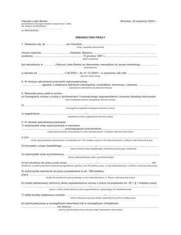 Wrocław, 20 września 20XX r. Fabryka Lalek Barbie (pracodawca oraz jego siedziba (miejscowość i data) lub miejsce zamieszkania) ....................................................................... (nr REGON-EKD) ŚWIADECTWO PRACY 1. Stwierdza się, że ..........................Jan Kowalski................................................................................................... (imię i nazwisko pracownika) imiona rodziców .....................................Zdzisław, Barbara..................................................................................... urodzony................................................................. 12 grudnia 1961 r...................................................................... (data urodzenia) był zatrudniony w ................Fabryce Lalek Barbie na stanowisku menedżera do spraw marketingu........................ (pracodawca) w okresie od ...................................1.08.2000 r. do 31.12.20XX r. w wymiarze cały etat........................................... (wymiar czasu pracy) 2. W okresie zatrudnienia pracownik wykonywał pracę .......................... zgodnie z ustalonym zakresem obowiązków, prawidłowo, terminowo i rzetelnie............................. (zajmowane stanowiska lub pełnione funkcje) 3. Stosunek pracy ustał w wyniku: a) rozwiązania umowy o pracę z zachowaniem 3-miesięcznego wypowiedzenia z powodu likwidacji stanowiska (tryb i podstawa prawna rozwiązania stosunku pracy) b) ...............................................................................—............................................................................................. (szczególne przypadki rozwiązania stosunku pracy) c) wygaśnięcia ...........................................................—.............................................................................................. (podstawa prawna wygaśnięcia stosunku pracy) 4. W okresie zatrudnienia pracownik: 1) wykorzystał urlop wypoczynkowy w wymiarze: .........................................................przysługującym pracownikowi............................................................................ (urlop wypoczynkowy wykorzystany w roku kalendarzowym, w którym ustał stosunek pracy) w tym ................................................................................... — .................................................................................. (urlop wypoczynkowy wykorzystany na podstawie art. 1672 kodeksu pracy w roku kalendarzowym, w którym ustał stosunek pracy) 2) korzystał z urlopu bezpłatnego ...........................................— ............................................................................... (okres trwania urlopu bezpłatnego i podstawa prawna jego udzielenia) 3) wykorzystał urlop wychowawczy ..........................................— .............................................................................. (okres wykorzystanego urlopu wychowawczego) 4) był niezdolny do pracy przez okres ......................................— .................................................................... dni (liczba dni, za które pracownik otrzymał wynagrodzenie zgodnie z art. 92 kodeksu pracy, w roku kalendarzowym, w którym ustał stosunek pracy) 5) wykorzystał zwolnienie od pracy przewidziane w art. 188 kodeksu pracy ........................................................................................—................................................................................ (liczba dni zwolnienia wykorzystanego w roku kalendarzowym, w którym ustał stosunek pracy) 6) został zastosowany skrócony okres wypowiedzenia umowy o pracę na podstawie art. 36 1 § 1 kodeksu pracy .........................................................................................—....................................................................................... (okres, o który został skrócony okres wypowiedzenia, uprawniający do odszkodowania) 7) odbył służbę wojskową w okresie ................................................. —..................................................................... (okres odbywania czynnej służby wojskowej lub jej form zastępczych) 8) wykonywał pracę w szczególnych warunkach lub w szczególnym charakterze ...............................................nie dotyczy.................................................................................................................... (okresy wykonywania pracy oraz jej rodzaj i zajmowane stanowiska) 9) wykorzystał dodatkowy urlop albo inne uprawnienia lub świadczenia przewidziane przepisami prawa pracy ..............3 dni robocze z zachowaniem prawa do wynagrodzenia na poszukiwanie pracy (art. 36 1 § 1 k.p.).............. 10) ......................................................................................—.................................................................................... (okresy nieskładkowe, przypadające w okresie zatrudnienia wskazanym w ust. 1, uwzględniane przy ustalaniu prawa do emerytury lub renty) grudnia 2003 r.) 5. Informacja o zajęciu wynagrodzenia: ....................................................................................nie dotyczy............................................................................... (oznaczenie komornika i numer sprawy egzekucyjnej) ..........................................................................................—...................................................................................... (wysokość potrąconych kwot) 6. Informacje uzupełniające Pan Ken (pieczęć i podpis pracodawcy lub osoby działającej w jego imieniu) POUCZENIE Pracownik może w ciągu 7 dni od dnia otrzymania świadectwa pracy wystąpić do pracodawcy z wnioskiem o sprostowanie tego świadectwa. W razie nieuwzględnienia wniosku pracownikowi przysługuje, w ciągu 7 dni od dnia otrzymania zawiadomienia o odm