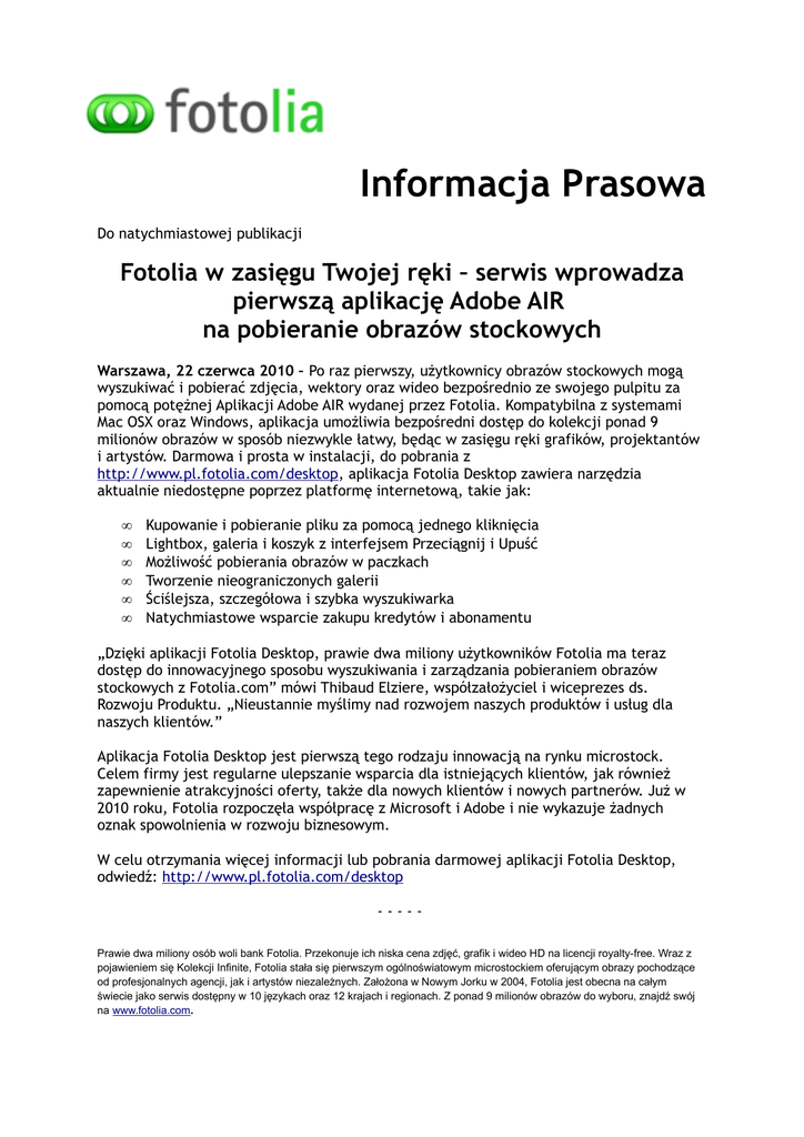 Informacja Prasowa Do natychmiastowej publikacji Fotolia w zasięgu Twojej ręki – serwis wprowadza pierwszą aplikację Adobe AIR na pobieranie obrazów stockowych Warszawa, 22 czerwca 2010 – Po raz pierwszy, użytkownicy obrazów stockowych mogą wyszukiwać i pobierać zdjęcia, wektory oraz wideo bezpośrednio ze swojego pulpitu za pomocą potężnej Aplikacji Adobe AIR wydanej przez Fotolia. Kompatybilna z systemami Mac OSX oraz Windows, aplikacja umożliwia bezpośredni dostęp do kolekcji ponad 9 milionów obrazów w sposób niezwykle łatwy, będąc w zasięgu ręki grafików, projektantów i artystów. Darmowa i prosta w instalacji, do pobrania z http://www.pl.fotolia.com/desktop, aplikacja Fotolia Desktop zawiera narzędzia aktualnie niedostępne poprzez platformę internetową, takie jak: • • • • • • Kupowanie i pobieranie pliku za pomocą jednego kliknięcia Lightbox, galeria i koszyk z interfejsem Przeciągnij i Upuść Możliwość pobierania obrazów w paczkach Tworzenie nieograniczonych galerii Ściślejsza, szczegółowa i szybka wyszukiwarka Natychmiastowe wsparcie zakupu kredytów i abonamentu „Dzięki aplikacji Fotolia Desktop, prawie dwa miliony użytkowników Fotolia ma teraz dostęp do innowacyjnego sposobu wyszukiwania i zarządzania pobieraniem obrazów stockowych z Fotolia.com” mówi Thibaud Elziere, współzałożyciel i wiceprezes ds. Rozwoju Produktu. „Nieustannie myślimy nad rozwojem naszych produktów i usług dla naszych klientów.” Aplikacja Fotolia Desktop jest pierwszą tego rodzaju innowacją na rynku microstock. Celem firmy jest regularne ulepszanie wsparcia dla istniejących klientów, jak również zapewnienie atrakcyjności oferty, także dla nowych klientów i nowych partnerów. Już w 2010 roku, Fotolia rozpoczęła współpracę z Microsoft i Adobe i nie wykazuje żadnych oznak spowolnienia w rozwoju biznesowym. W celu otrzymania więcej informacji lub pobrania darmowej aplikacji Fotolia Desktop, odwiedź: http://www.pl.fotolia.com/desktop ----Prawie dwa miliony osób woli bank Fotolia. Przekonuje ich niska cena zdjęć, grafik i wideo HD na licencji royalty-free. Wraz z pojawieniem się Kolekcji Infinite, Fotolia stała się pierwszym ogólnoświatowym microstockiem oferującym obrazy pochodzące od profesjonalnych agencji, jak i artystów niezależnych. Założona w Nowym Jorku w 2004, Fotolia jest obecna na całym świecie jako serwis dostępny w 10 językach oraz 12 krajach i regionach. Z ponad 9 milionów obrazów do wyboru, znajdź swój na www.fotolia.com.