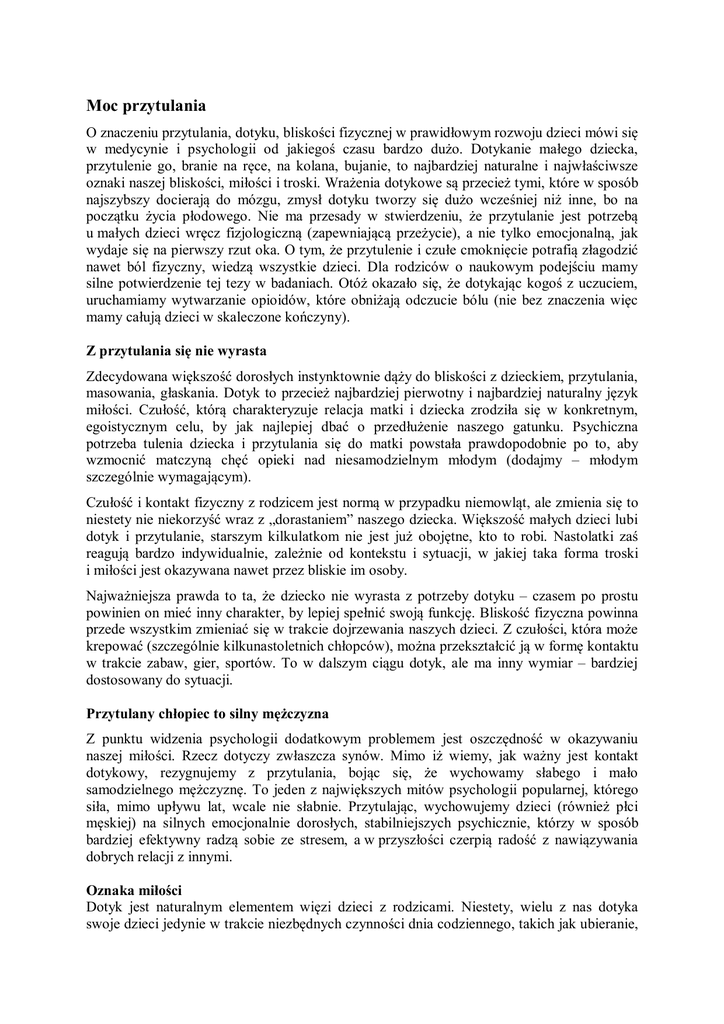 Moc przytulania O znaczeniu przytulania, dotyku, bliskości fizycznej w prawidłowym rozwoju dzieci mówi się w medycynie i psychologii od jakiegoś czasu bardzo dużo. Dotykanie małego dziecka, przytulenie go, branie na ręce, na kolana, bujanie, to najbardziej naturalne i najwłaściwsze oznaki naszej bliskości, miłości i troski. Wrażenia dotykowe są przecież tymi, które w sposób najszybszy docierają do mózgu, zmysł dotyku tworzy się dużo wcześniej niż inne, bo na początku życia płodowego. Nie ma przesady w stwierdzeniu, że przytulanie jest potrzebą u małych dzieci wręcz fizjologiczną (zapewniającą przeżycie), a nie tylko emocjonalną, jak wydaje się na pierwszy rzut oka. O tym, że przytulenie i czułe cmoknięcie potrafią złagodzić nawet ból fizyczny, wiedzą wszystkie dzieci. Dla rodziców o naukowym podejściu mamy silne potwierdzenie tej tezy w badaniach. Otóż okazało się, że dotykając kogoś z uczuciem, uruchamiamy wytwarzanie opioidów, które obniżają odczucie bólu (nie bez znaczenia więc mamy całują dzieci w skaleczone kończyny). Z przytulania się nie wyrasta Zdecydowana większość dorosłych instynktownie dąży do bliskości z dzieckiem, przytulania, masowania, głaskania. Dotyk to przecież najbardziej pierwotny i najbardziej naturalny język miłości. Czułość, którą charakteryzuje relacja matki i dziecka zrodziła się w konkretnym, egoistycznym celu, by jak najlepiej dbać o przedłużenie naszego gatunku. Psychiczna potrzeba tulenia dziecka i przytulania się do matki powstała prawdopodobnie po to, aby wzmocnić matczyną chęć opieki nad niesamodzielnym młodym (dodajmy – młodym szczególnie wymagającym). Czułość i kontakt fizyczny z rodzicem jest normą w przypadku niemowląt, ale zmienia się to niestety nie niekorzyść wraz z „dorastaniem” naszego dziecka. Większość małych dzieci lubi dotyk i przytulanie, starszym kilkulatkom nie jest już obojętne, kto to robi. Nastolatki zaś reagują bardzo indywidualnie, zależnie od kontekstu i sytuacji, w jakiej taka forma troski i miłości jest okazywana nawet przez bliskie im osoby. Najważniejsza prawda to ta, że dziecko nie wyrasta z potrzeby dotyku – czasem po prostu powinien on mieć inny charakter, by lepiej spełnić swoją funkcję. Bliskość fizyczna powinna przede wszystkim zmieniać się w trakcie dojrzewania naszych dzieci. Z czułości, która może krepować (szczególnie kilkunastoletnich chłopców), można przekształcić ją w formę kontaktu w trakcie zabaw, gier, sportów. To w dalszym ciągu dotyk, ale ma inny wymiar – bardziej dostosowany do sytuacji. Przytulany chłopiec to silny mężczyzna Z punktu widzenia psychologii dodatkowym problemem jest oszczędność w okazywaniu naszej miłości. Rzecz dotyczy zwłaszcza synów. Mimo iż wiemy, jak ważny jest kontakt dotykowy, rezygnujemy z przytulania, bojąc się, że wychowamy słabego i mało samodzielnego mężczyznę. To jeden z największych mitów psychologii popularnej, którego siła, mimo upływu lat, wcale nie słabnie. Przytulając, wychowujemy dzieci (również płci męskiej) na silnych emocjonalnie dorosłych, stabilniejszych psychicznie, którzy w sposób bardziej efektywny radzą sobie ze stresem, a w przyszłości czerpią radość z nawiązywania dobrych relacji z innymi. Oznaka miłości Dotyk jest naturalnym elementem więzi dzieci z rodzicami. Niestety, wielu z nas dotyka swoje dzieci jedynie w trakcie niezbędnych czynności dnia codziennego, takich jak ubieranie, mycie, wchodzenie po schodach za rękę, przytrzymywanie przy wejściu do samochodu czy autobusu. Ross Campbell, amerykański terapeuta rodzinny, mówi wręcz o napełnianiu emocjonalnego zbiornika dziecka (jak twierdzi, niezbędnego do dobrego rozwoju) poprzez przytulanie. Kontakt fizyczny jest przecież najmniej wymagający czasu, można znaleźć na niego przestrzeń nawet w naszym zapracowanym życiu. Może to być przecież przelotne muśniecie ręki, poklepanie po ramieniu, mocniejszy uścisk na do widzenia. Jednym z błędów wychowawczych, mających dalekosiężne skutki w prawidłowym rozwoju emocjonalnym dziecka, jest realizacja sprzecznych komunikatów (szczególnie z języka ciała i słów). Niech dotyk sprawia nam rzeczywistą, a nie wymuszoną radość. Przytulajmy nasze dzieci, bo to oznaka naszej troski i miłości, a nie dlatego, że tak trzeba. Dbajmy o jasny i tożsamy komunikat przy przytulaniu. Jeśli dotykamy to róbmy to z przesłaniem – lubię to, jesteś mi bliski. Nawiązujmy kontakt wzrokowy. Pamiętajmy też o prawie małego dziecka do odmowy takiego kontaktu, nie bądźmy nachalni, nie przekraczajmy niepotrzebnie granic, bądźmy czujni na to, co nasze dziecko do nas mówi. Pisząc o dotyku i przytulaniu, nie można nie wspomnieć o wielu dzieciach z bardzo dużą nadwrażliwością w obrębie tego zmysłu. Jeśli niechęć do przytulania objawia się sztywnieniem, unikaniem, czy nawet złością, może ona mieć podłoże neurologiczne, na które dziecko nie ma wpływu. Jeśli dodatkowo maluch nie lubi brudzić rąk, malować palcami, myć głowy, drażnią go metki warto zasięgnąć porady psychologa. Niech najlepszą puentą rozważań o mocy przytulania będzie rozmowa z moim prawie pięcioletnim synkiem. – Mamo, co robisz? – Piszę coś. O przytulaniu. – Aha. – A Ty lubisz się przytulać? – Tak. – A do kogo? – Do ciebie, taty, Ewy (siostra) i pani Ewy (nauczycielka w przedszkolu). – A dlaczego akurat do tych osób? – Bo jesteście moi ukochani. Piękne, prawda? Naukowe dowody na wielką wartość dotyku Wspomnieć również należy o sławnym eksperymencie z początku lat 60 pod znamiennym tytułem „Natura miłości”, w którym to Harry Harlow udowodnił ogromny wpływ dotyku na rozwój psychiczny małp. Eksperyment był kontrowersyjny, ale jego wnioski zaskakujące. Okazało się, że małe rezusy–sieroty zdecydowanie wybierały atr