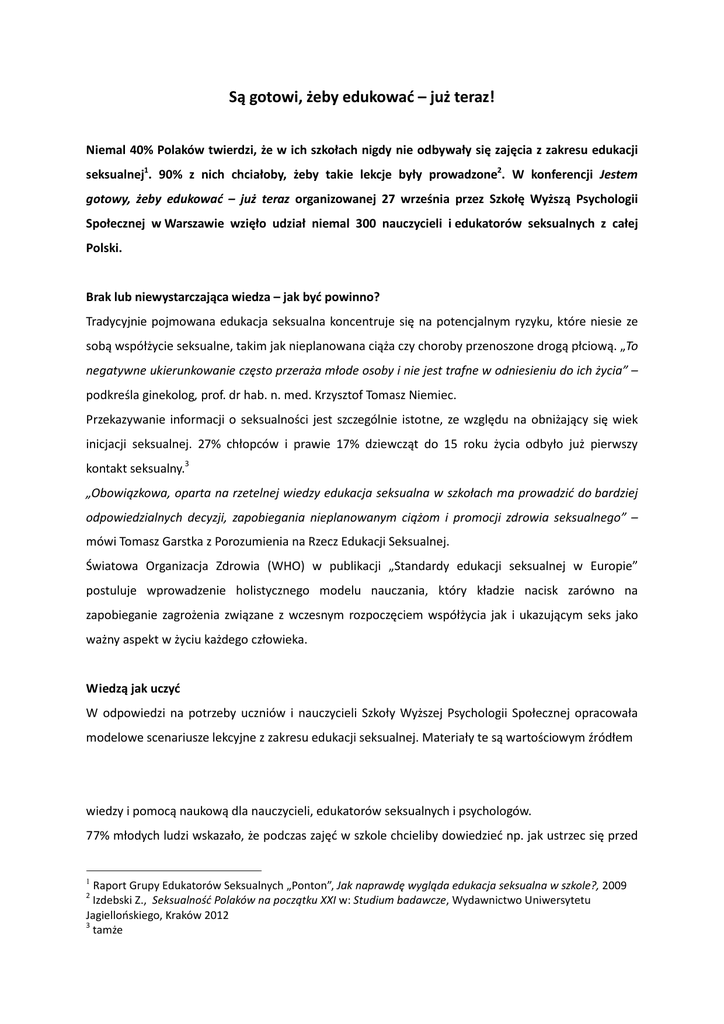 Są gotowi, żeby edukować – już teraz! Niemal 40% Polaków twierdzi, że w ich szkołach nigdy nie odbywały się zajęcia z zakresu edukacji seksualnej1. 90% z nich chciałoby, żeby takie lekcje były prowadzone2. W konferencji Jestem gotowy, żeby edukować – już teraz organizowanej 27 września przez Szkołę Wyższą Psychologii Społecznej w Warszawie wzięło udział niemal 300 nauczycieli i edukatorów seksualnych z całej Polski. Brak lub niewystarczająca wiedza – jak być powinno? Tradycyjnie pojmowana edukacja seksualna koncentruje się na potencjalnym ryzyku, które niesie ze sobą współżycie seksualne, takim jak nieplanowana ciąża czy choroby przenoszone drogą płciową. „To negatywne ukierunkowanie często przeraża młode osoby i nie jest trafne w odniesieniu do ich życia” – podkreśla ginekolog, prof. dr hab. n. med. Krzysztof Tomasz Niemiec. Przekazywanie informacji o seksualności jest szczególnie istotne, ze względu na obniżający się wiek inicjacji seksualnej. 27% chłopców i prawie 17% dziewcząt do 15 roku życia odbyło już pierwszy kontakt seksualny.3 „Obowiązkowa, oparta na rzetelnej wiedzy edukacja seksualna w szkołach ma prowadzić do bardziej odpowiedzialnych decyzji, zapobiegania nieplanowanym ciążom i promocji zdrowia seksualnego” – mówi Tomasz Garstka z Porozumienia na Rzecz Edukacji Seksualnej. Światowa Organizacja Zdrowia (WHO) w publikacji „Standardy edukacji seksualnej w Europie” postuluje wprowadzenie holistycznego modelu nauczania, który kładzie nacisk zarówno na zapobieganie zagrożenia związane z wczesnym rozpoczęciem współżycia jak i ukazującym seks jako ważny aspekt w życiu każdego człowieka. Wiedzą jak uczyć W odpowiedzi na potrzeby uczniów i nauczycieli Szkoły Wyższej Psychologii Społecznej opracowała modelowe scenariusze lekcyjne z zakresu edukacji seksualnej. Materiały te są wartościowym źródłem wiedzy i pomocą naukową dla nauczycieli, edukatorów seksualnych i psychologów. 77% młodych ludzi wskazało, że podczas zajęć w szkole chcieliby dowiedzieć np. jak ustrzec się przed 1 Raport Grupy Edukatorów Seksualnych „Ponton”, Jak naprawdę wygląda edukacja seksualna w szkole?, 2009 Izdebski Z., Seksualność Polaków na początku XXI w: Studium badawcze, Wydawnictwo Uniwersytetu Jagiellońskiego, Kraków 2012 3 tamże 2 chorobami przenoszonymi drogą płciową, jak zabezpieczyć się przed niepożądana ciążą4. Równie ważnymi zagadnieniami są informacje o współżyciu seksualnym, nauka rozwiązywania konfliktów i budowania trwałych związków uczuciowych. „Przygotowane scenariusze lekcyjne pozwalają przekazać młodzieży podstawowe informacje o seksualności. Traktują m.in. o inicjacji, roli antykoncepcji, pozwalają rozpoznawać ryzykowne zachowania seksualne i uczą o chorobach przenoszonych drogą płciową”– mówi Aleksandra Jodko, seksuolog ze Szkoły Wyższej Psychologii Społecznej. – „Konspekty opracowane są w nowoczesny i przyjazny sposób, pozwalający szybko przyswoić wiedzę. Zawierają np. propozycje ćwiczeń grupowych, prowadzenia dyskusji i tematy prac domowych”. Scenariusze lekcyjne można pobrać na stronie internetowej www.swps.pl oraz na: www.wpadka.pl/swiadoma-szkola. *** Podczas konferencji Jestem gotowy, żeby edukować - już teraz swoją wiedzą i doświadczeniem z nauczycielami podzielili się wybitni eksperci: seksuolog, prof. Zbigniew Lew-Starowicz –, lekarz ginekolog, prof. dr hab. n. med. Krzysztof Tomasz Niemiec, dr n. hum. Alicja Długołęcka z Akademii Wychowania Fizycznego, Aleksandra Jodko ze Szkoły Wyższej Psychologii Społecznej oraz Tomasz Garstka z Porozumienia na Rzecz Edukacji Seksualnej. Organizatorem konferencji Jestem gotowy, żeby edukować - już teraz była Szkoła Wyższa Psychologii Społecznej w Warszawie. Patronat merytoryczny nad wydarzeniem objęło Polskie Towarzystwo Seksuologiczne. Patroni medialni: Wprost, Nastek.pl oraz magazyn nauczyciela Mentor. Szczegółowych informacji udziela: Justyna Giers, Green Stream Communication S.A. [email protected] tel. 533 343 096 4 Izdebski Z., Seksualność Polaków na początku XXI w: Studium badawcze, Wydawnictwo Uniwersytetu Jagiellońskiego, Kraków 2012