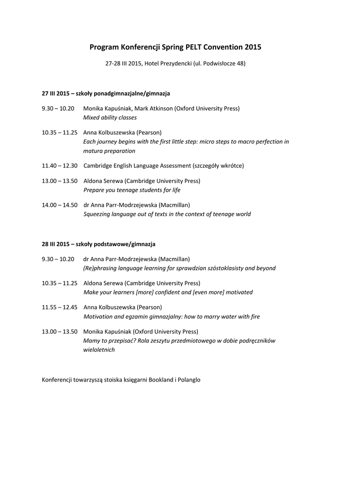 Program Konferencji Spring PELT Convention 2015 27-28 III 2015, Hotel Prezydencki (ul. Podwisłocze 48) 27 III 2015 – szkoły ponadgimnazjalne/gimnazja 9.30 – 10.20 Monika Kapuśniak, Mark Atkinson (Oxford University Press) Mixed ability classes 10.35 – 11.25 Anna Kolbuszewska (Pearson) Each journey begins with the first little step: micro steps to macro perfection in matura preparation 11.40 – 12.30 Cambridge English Language Assessment (szczegóły wkrótce) 13.00 – 13.50 Aldona Serewa (Cambridge University Press) Prepare you teenage students for life 14.00 – 14.50 dr Anna Parr-Modrzejewska (Macmillan) Squeezing language out of texts in the context of teenage world 28 III 2015 – szkoły podstawowe/gimnazja 9.30 – 10.20 dr Anna Parr-Modrzejewska (Macmillan) (Re)phrasing language learning for sprawdzian szóstoklasisty and beyond 10.35 – 11.25 Aldona Serewa (Cambridge University Press) Make your learners [more] confident and [even more] motivated 11.55 – 12.45 Anna Kolbuszewska (Pearson) Motivation and egzamin gimnazjalny: how to marry water with fire 13.00 – 13.50 Monika Kapuśniak (Oxford University Press) Mamy to przepisać? Rola zeszytu przedmiotowego w dobie podręczników wieloletnich Konferencji towarzyszą stoiska księgarni Bookland i Polanglo