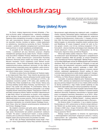 „Zdarto żagle, ster prysnął, ryk wód, szum zawiei, Głosy trwożnej gromady, pomp złowieszcze jęki” Stary (dobry) Krym Do Soczi, miejsca tegorocznej zimowej olimpiady, z Teodozji na Krymie „latały” turbogazochody – wodoloty rozwijające, jak na ślizganie się po powierzchni morza, zawrotną prędkość. Zapewne wielu energetyków korzystało w czasie pobytu na Krymie, jeśli marynistyczne Muzeum Ajwazowskiego w Teodozji nie wywołało choroby morskiej na lądzie, z okazji popłynięcia na całodzienną, niecodzienną wycieczkę do Soczi. Pamiętam, że jeden z polskich zakładów energetycznych wymieniał grupy wypoczynkowe w ramach współpracy przedsiębiorstw. To początek lat 90. Wstrzymano budowę elektrowni atomowej, z podobnych jak przy Żarnowcu przyczyn: oficjalnej niestabilności geologicznej tej części Krymu. Chodzi o miejscowość Szczołkine niedaleko Teodozji. Miasteczko przekształcone w 1978 roku z osady budowniczych i pracowników Krymskiej Elektrowni Atomowej dosyć szybko się rozwija, jako kurort nad Morzem Azowskim. Kurort rozsławiany przez festiwal muzyki elektronicznej – Music Festival Kazantip odbywa się na terenie niedokończonej budowy elektrowni atomowej. W roku 2008 na terenie budowy rozpoczęto prace nad projektem „parku przemysłowego w miejscowości Szczołkine”. Głównie w celu utworzenia nowych miejsc pracy i rozwoju turystyki . W drodze ze stolicy Krymu Symferopolu do Teodozji znajduje się miejscowość Stary Krym. Tutaj mieściła się pierwsza stolica Chanatu Krymskiego, tutaj też półwysep krymski zyskał swoją nazwę. Miasto było znane z handlu i rzemiosła już w VI-VII w., ale największe znaczenie zyskało w XIV wieku, jako siedziba okręgu Złotej Ordy. Kiedy wyodrębnił się z Ordy Chanat, Tatarzy swą pierwszą siedzibę nazwali Starą Twierdzą, czyli Eski-Kyrym. Tym samym imię zyskał cały półwysep. Po przeniesieniu stolicy do Bakczysaraju miasto zaczęło stopniowo podupadać, a po aneksji rosyjskiej straciło nawet prawa miejskie. Tutaj jeszcze w latach 70. poznałem powojenną historię Tatarów krymskich deportowanych w głąb Rosji, którym nie pozwolono na powrót, mimo pogarszającego się stanu nawodnienia dużej części Krymu, który chciano odbudować jedynie za prawo powrotu. Dziś tą małą miejscowość można odwiedzić poznając historię kilku znaczących meczetów, mauzoleum derwiszów czy ormiański klasztor Świętego Krzyża – Surb Chacz, który był miejscem przechowywania narodowej relikwii Ormian, Świętego Krzyża. Na miejskim cmentarzu jest grób autora „Szkarłatnych żagli”, „Biegnącej po falach” – Aleksandra Grina (1880-1932), którego ojciec (Hryniewiecki) był polskim powstańcem zesłanym na Sybir. Ten pisarz o pokręconych losach, a raczej postawie, uważany jest za prekursora literatury science fiction. Klimat jego książek często jest przyrównywany do powieści Conrada. 160 lat mija, jak Rosja wypowiedziała wojnę Anglii i Francji, a 31 marca wypowiedzieli wojnę Rosji zachodni sojusznicy. strona 192 Burza. Sonety krymskie. Adam Mickiewicz Sprzymierzeni zajęli półwysep bez większych walk, z wyjątkiem miasta i twierdzy Sewastopol (gdzie znajdowało się dowództwo rosyjskiej Floty Czarnomorskiej), którego oblężenie, połączone z ciężkimi bombardowaniami, trwało przez 11 miesięcy, do września 1855. Do historii przeszła też brytyjska kawaleryjska szarża lekkiej brygady na stanowiska rosyjskiej artylerii podczas bitwy pod Bałakławą. W czasie trwających ponad rok walk na Krymie zginęło i zmarło z ran 3,5 tys. żołnierzy brytyjskich i 37 tys. francuskich. Jeszcze bardziej przerażająca była statystyka ofiar chorób zakaźnych i mrozu: ok. 7 tys. Brytyjczyków i ok. 63 tys. Francuzów. Ogromne straty ponieśli też Rosjanie. Winna była fatalna opieka medyczna. Ranni i chorzy żołnierze ewakuowani spod Sewastopola dogorywali w przepełnionych i brudnych lazaretach. Mało kto pamięta, że cichymi bohaterami wojny krymskiej byli Florence Nightingale i Mikołaj Pirogow. Z wojny krymskiej Nightingale wróciła do Wielkiej Brytanii jako bohaterka narodowa. Mimo że w Łodzi jest szpital im. Pirogowa, on sam jest mniej znany. Był prekursorem nauczania anatomii topograficznej (Autor klasycznego atlasu anatomii, wydanego w latach 18521859), w 1855 zastosował opatrunek gipsowy w leczeniu złamań kończyn, zastosował segregowanie chorych według ich stanu i schorzeń podczas leczenia w strefie działań wojennych i transportu na tyły. Jego zabalsamowane ciało można oglądać w mauzoleum w Winnicy, a w Parku-Muzeum obejrzeć dzieła jego życia. I pomyśleć, że podczas oblężenia portu Teodozji przez Tatarów w 1346 r. pierwszy raz zastosowano broń biologiczną. Oblegający przy pomocy katapult wrzucali za mury miasta zwłoki zmarłych na dżumę (uciekinierzy z tego miasta roznieśli epidemię na cały kontynent) zapoczątkowując tym samym jej epidemię w Europie. Historia – historią, tymczasem brytyjski rząd prowadzi oficjalne rozmowy z rosyjskim koncernem Rosatom w sprawie budowy elektrowni atomowej. Podpisano memorandum w sprawie współpracy w energetyce atomowej. Stwierdzono, że po 2015 r. Rosatom może formalnie rozpocząć procedury przebudowy technologii atomowej do użytku w Wielkiej Brytanii – budowę reaktorów WWER, czyli takich, jakie miano zastosować także w Żarnowcu. Na Ukrainie działa 15 reaktorów i 2 są w stadium budowy. Dostarczają one 44% wytwarzanej na Ukrainie energii elektrycznej. Wśród nich są dwie bardzo znane, jedna to Czarnobyl (zamknięta w 2000 roku) i druga Chmielnicka AES, z którą mamy energetyczne, niefunkcjonujące połączenie elektroenergetyczną linią na poziomie 750 kV. Śledząc rozwój wypadków na Ukrainie nie zapominajmy o dobrosąsiedzkich stosunkach związanych zarówno z kulturą, wypoczynkiem, ale i gospodarką. Historia Krymu to bogactwo ludzkiego doświadczenia. 